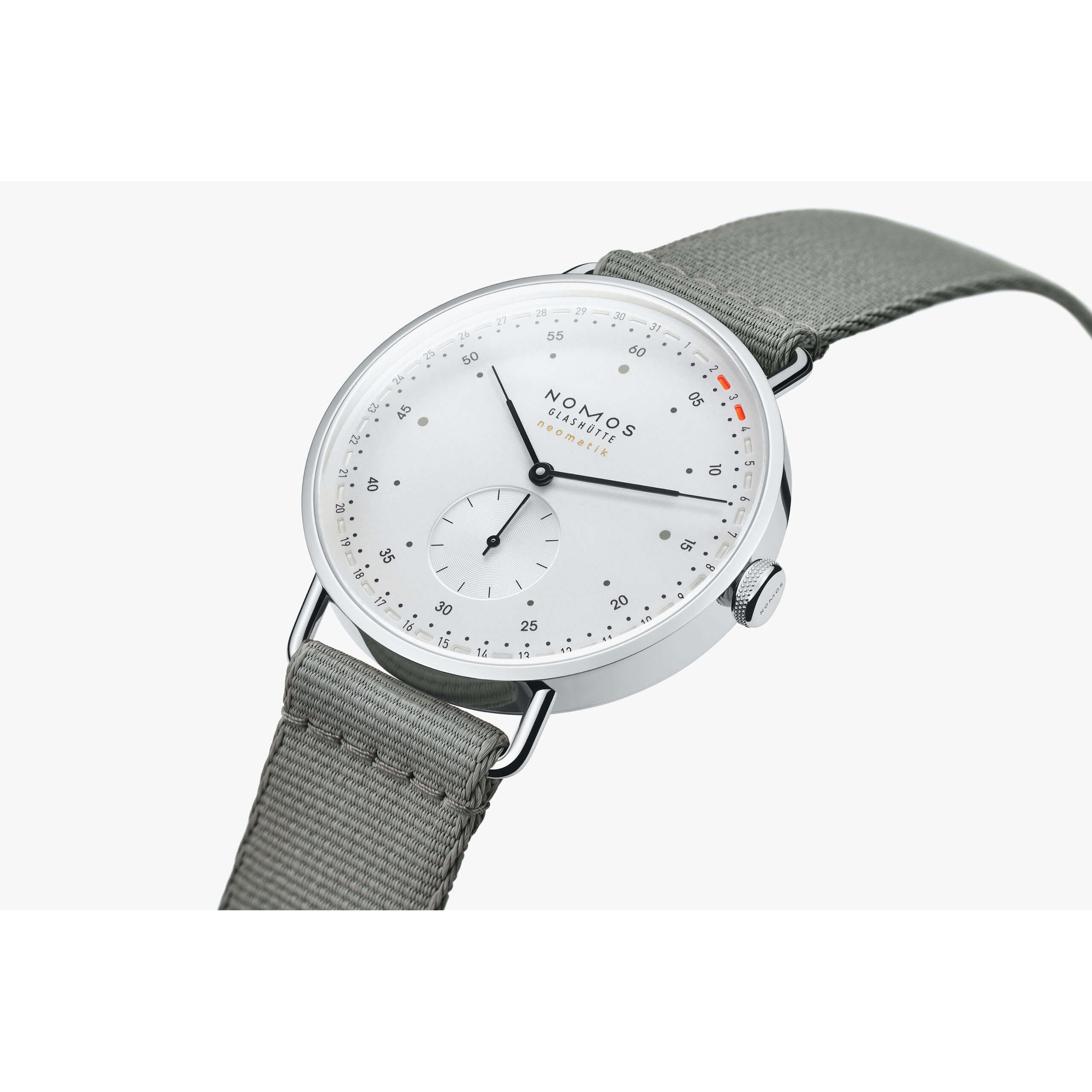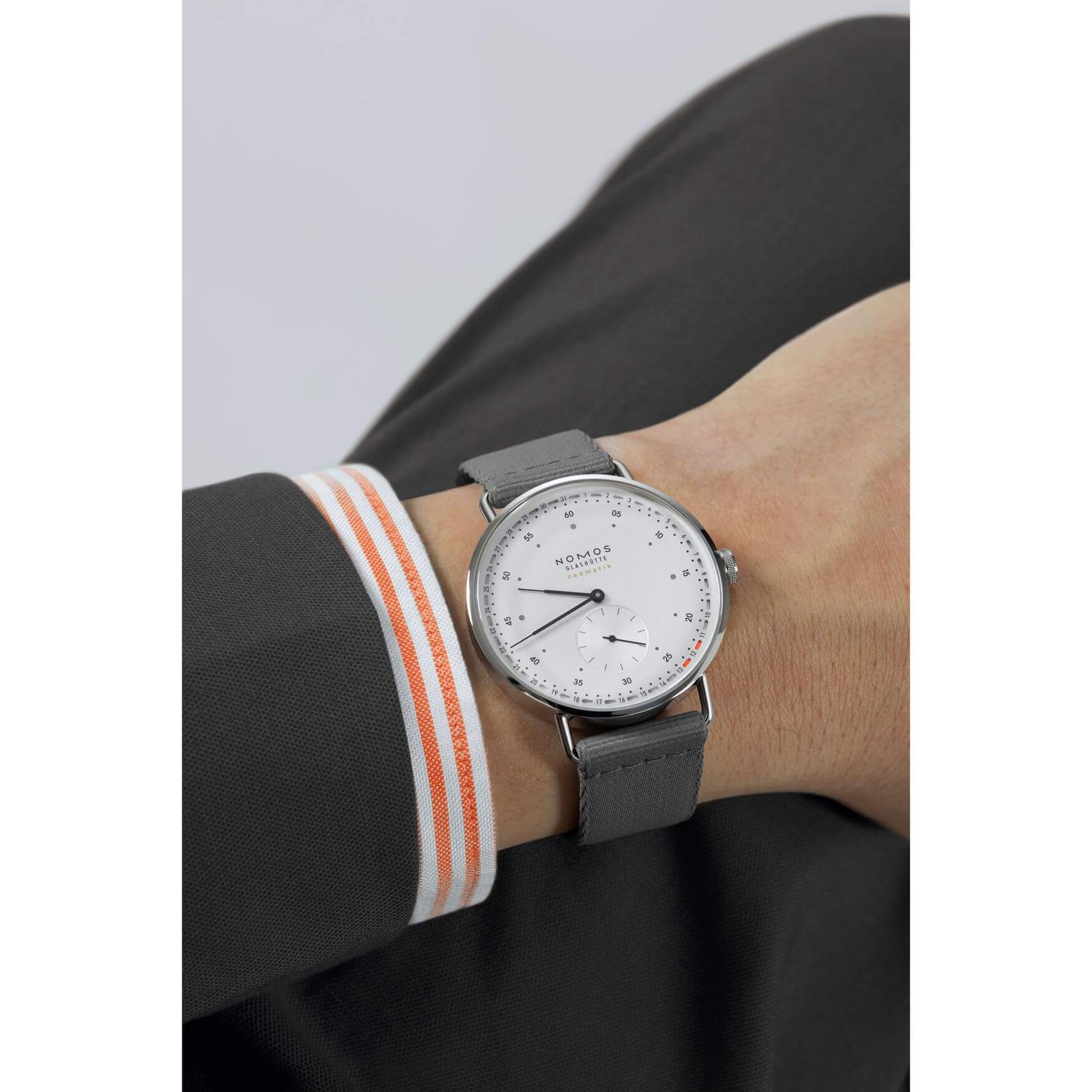 Großstädtisch, weltgewandt und smart – das ist Metro. Auch als Metro neomatik 41 Update liebt diese Uhr klare Formen. Das einzigartige, patentierte NOMOS-Ringdatum in Neonorange verweist auf eine neue Zeit – die schöne Gestaltung von Metro bleibt dennoch unverkennbar Metro. Das dunkelgraue Textilband gibt diesem jüngsten Modell, das in Zusammenarbeit mit Mark Braun entstanden ist, einen eleganten Akzent.Produktspezifikationen