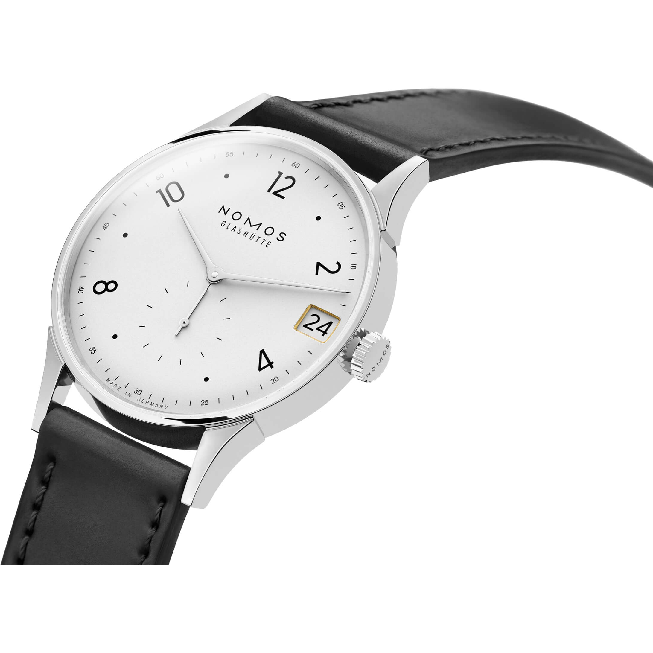 Diese Dresswatch verbindet zeitlose Ästhetik mit feiner Dynamik. Sanft geschwungene Bandanstöße, das gewölbte Saphirglas und das weiß versilberte Zifferblatt fließen harmonisch ineinander und schaffen eine fließende Silhouette. Ein goldgerahmtes Datumsfenster bei 3 Uhr rückt das Tagesdatum stilvoll ins Licht und verweist zugleich auf das innovative Handaufzugskaliber mit Datum aus dem Hause NOMOS. Ein raffinierter Begleiter – für jeden Tag, für ein ganzes Leben.Produktspezifikationen