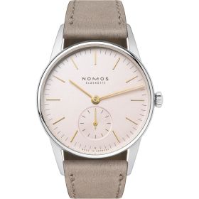 Orion 33 rosé: dezentrale Sekunde, Sekundenstopp, Glashütter Dreiviertelplatine, 17 Rubine, Glashütter Gesperr, Incabloc-Stoßsicherung, Unruhspirale aus Nivarox 1A, Feinregulierung in sechs Lagen, Schrauben temperaturgebläut, Werkoberflächen rhodiniert mit Glashütter Streifenschliff und NOMOSPerlage, Sperr- und Kronrad mit Glashütter Sonnenschliff