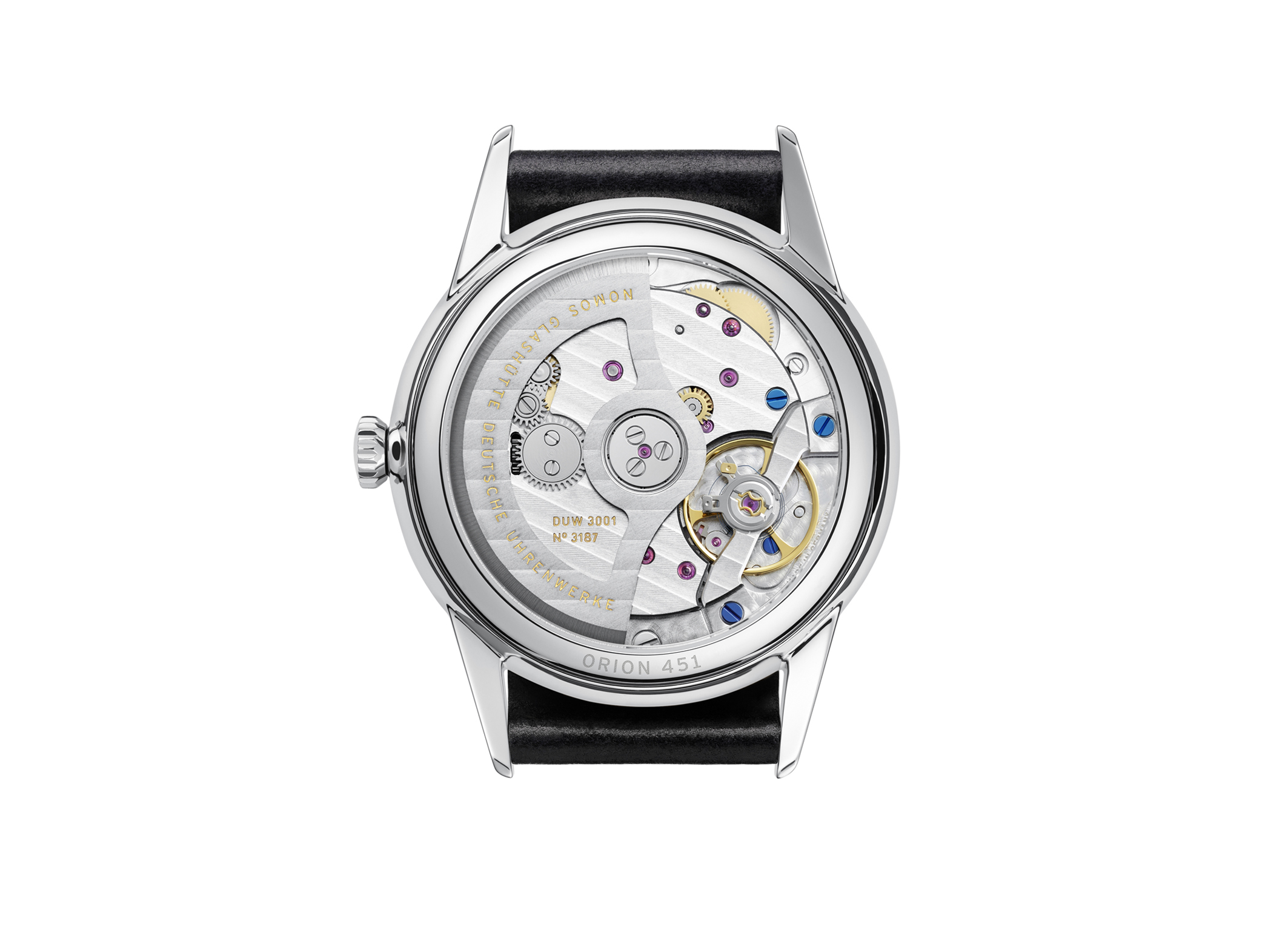 dezentrale Sekunde,Sekundenstopp, Glashütter Dreiviertelplatine, Nomos-Unruhbrücke, 27 Rubine, beidseitig aufziehender Rotor, Incabloc-Stoßsicherung, DUWReguliersystem, feinreguliert in sechs Lagen, temperaturgebläute Schrauben, rhodinierte Werkoberflächen mit Glashütter Streifenschliff und NOMOSPerlageProduktspezifikationen