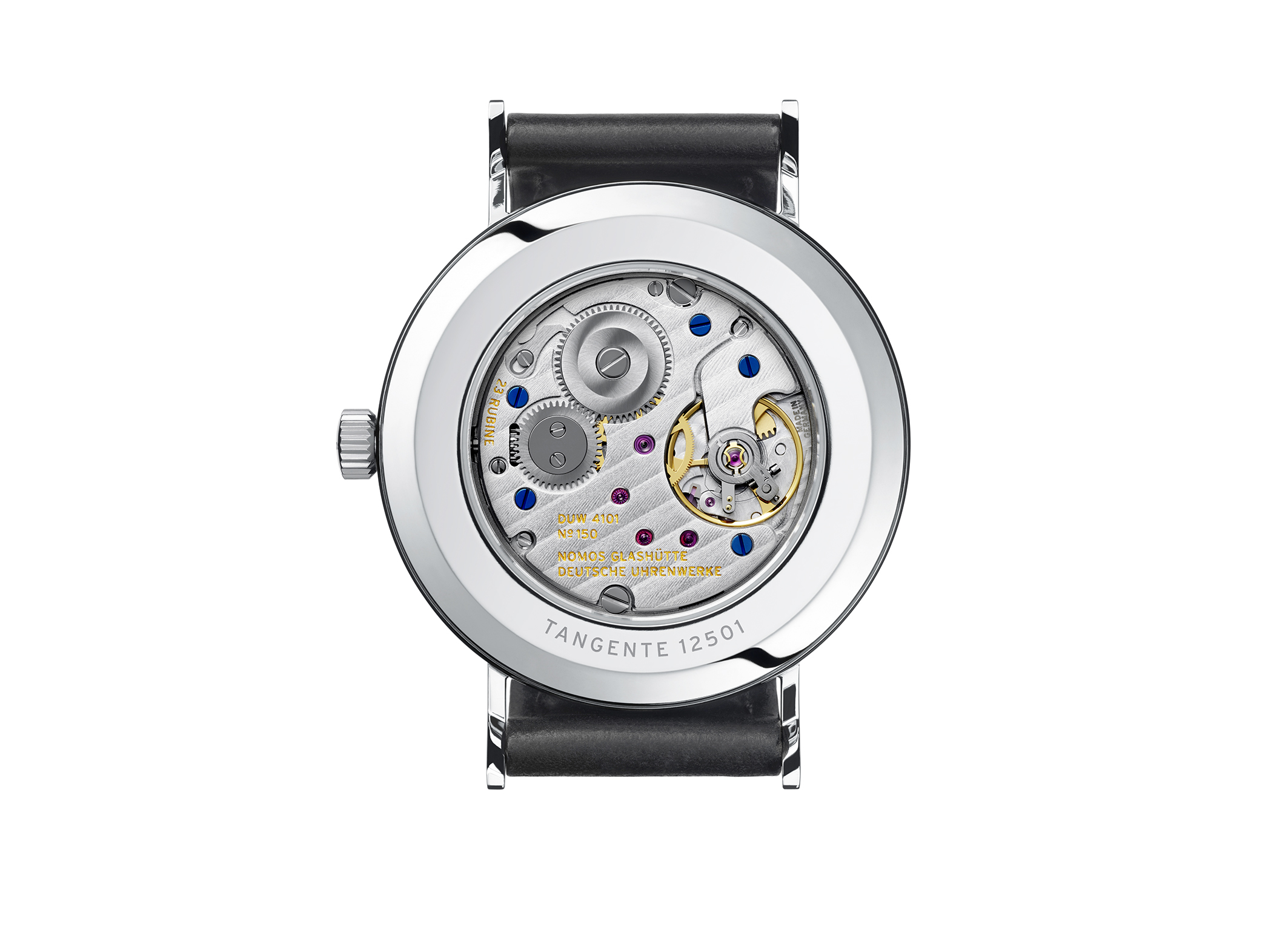 dezentrale Sekunde, Sekundenstopp, Glashütter Dreiviertelplatine, 23 Rubine, Glashütter Gesperr, Incabloc-Stoßsicherung, Feinregulierung in sechs Lagen, Schrauben temperaturgebläut, Werkoberflächen rhodiniert mit Glashütter Streifenschliff und NOMOS-Perlage, Sperr- und Kronrad mit Glashütter SonnenschliffProduktspezifikationen