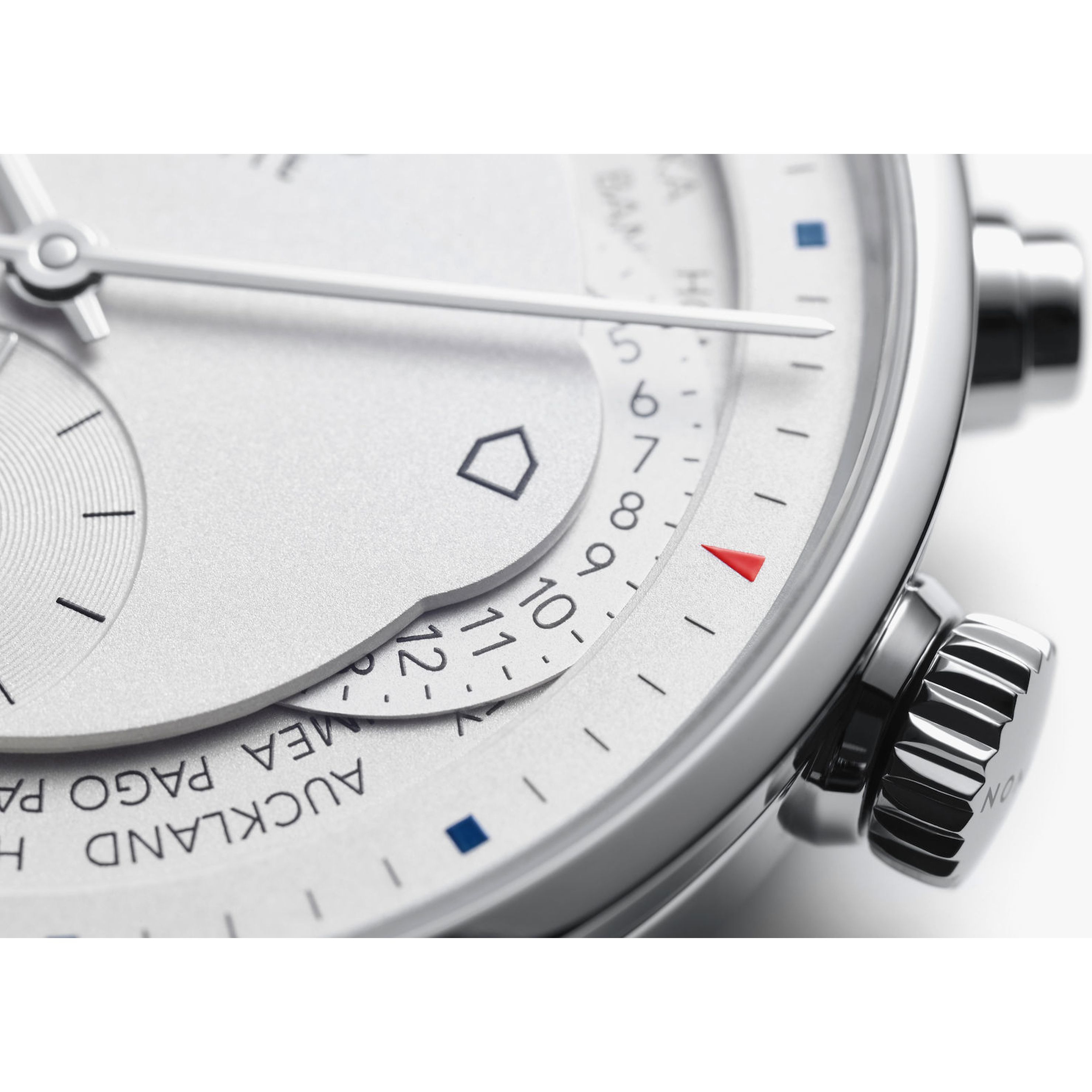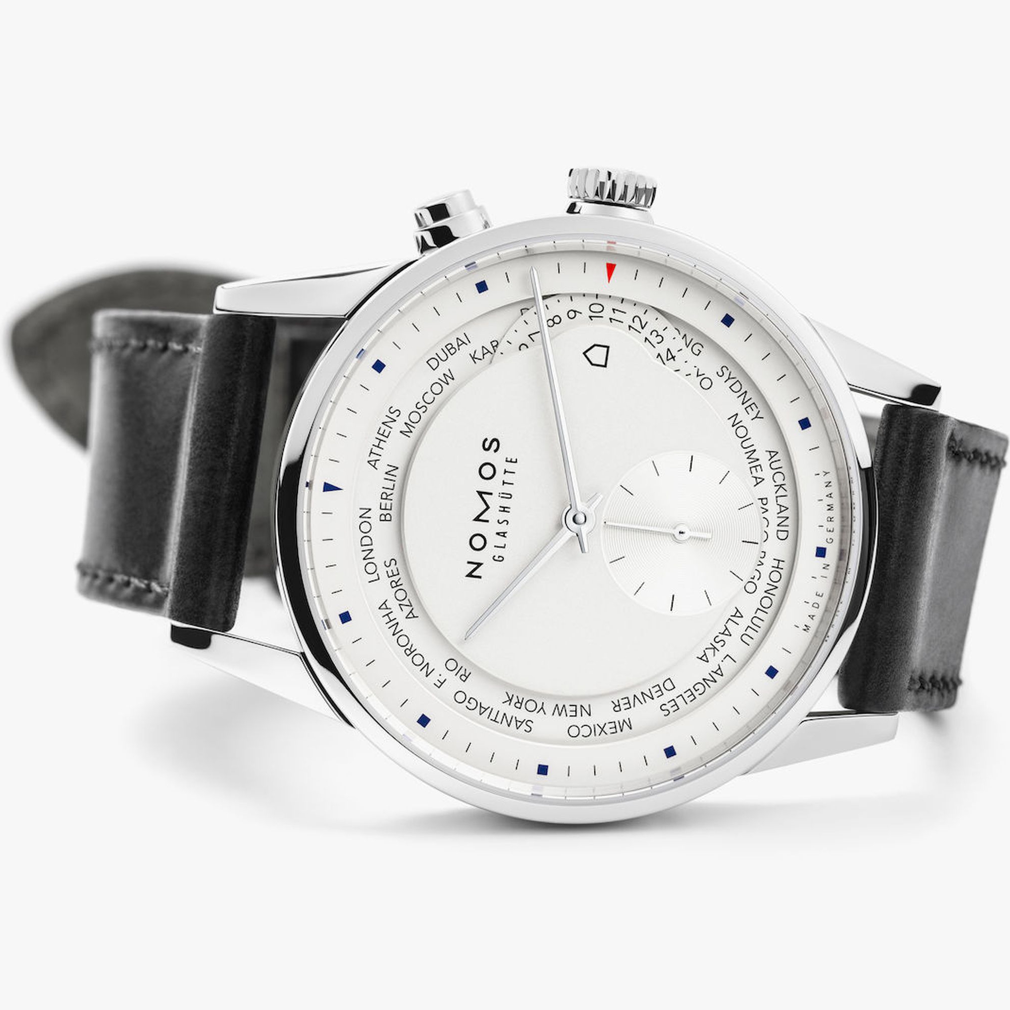 NOMOS Glashütte Zürich Weltzeit: 24 Uhren in einer. Entdecken Sie die Zeiten der Welt per Knopfdruck. Eine Komplikation ganz unkompliziert, nützlich für jedermann. Das Automatikkaliber DUW 5201 von Nomos verleiht der Züricher Weltzeituhr die Möglichkeit, die eigene Zeit und die von 23 weiteren Zeitzonen abzulesen. Durchmesser ca. 40 mm. Edelstahlgehäuse mit Rückseite aus Saphirglas. Vorderseite Saphirglas gewölbt und beidseitig entspiegelt. Das Uhrwerk besteht aus einem DUW 5201 Automatik-Kaliber mit einer Gangreserve von ca. 42 Stunden. Zifferblatt in weiß, Lederarmband in schwarz mit Dornschließe.Produktspezifikationen