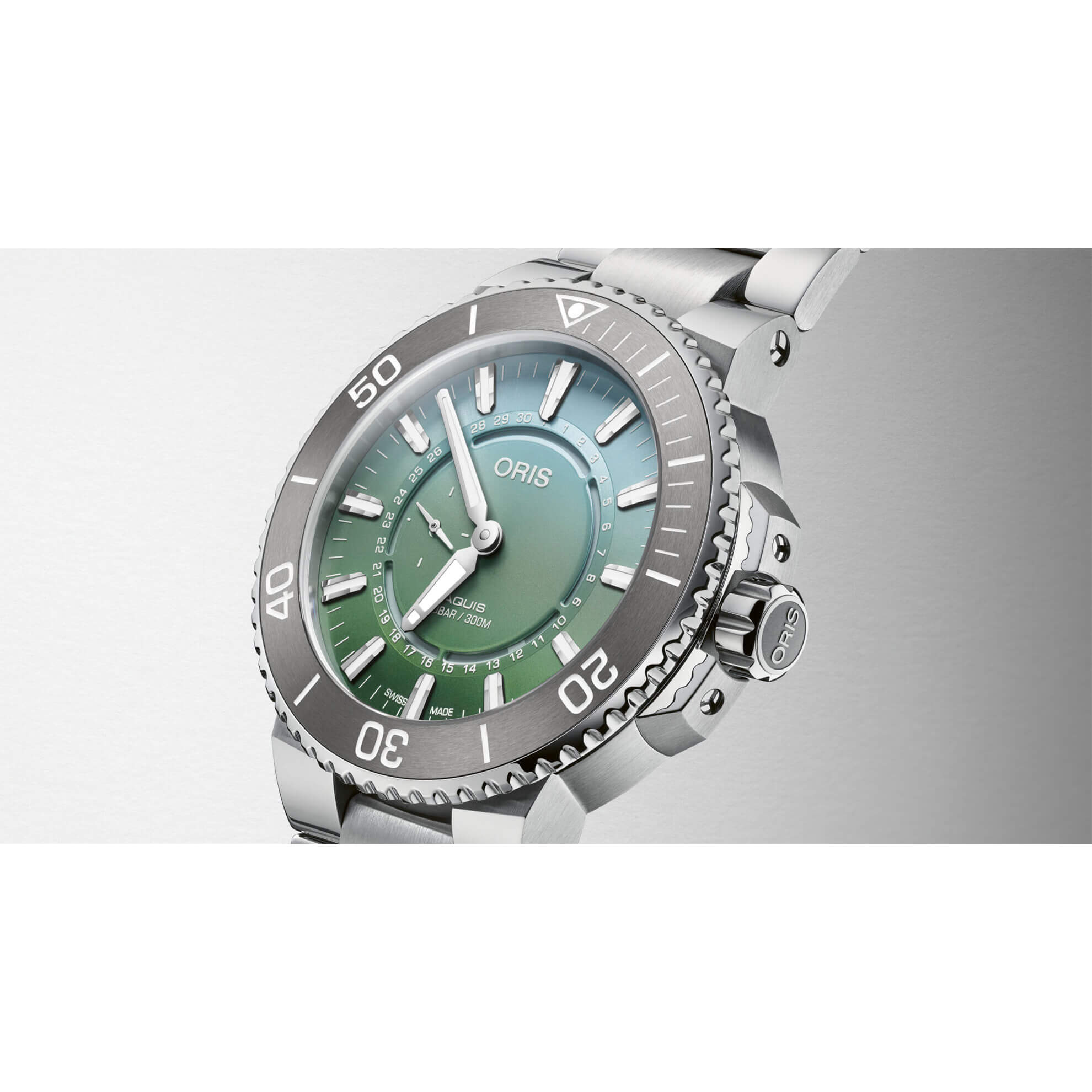 Oris präsentiert stolz die Aquis Dat Watt Limited Edition II. Durch die Verlängerung der Zusammenarbeit mit dem Gemeinsamen Wattenmeersekretatriat bis Ende 2025 hilft dieses Modell dabei, eines der wichtigsten Ökosysteme der Welt zu bewahren. Das nordeuropäische Wattenmeer erstreckt sich über eine beeindruckende Küstenlinie von 500 km und bedeckt eine Fläche von 11.500 km², die sich von Dänemark über Deutschland bis in die Niederlande erstreckt. Diese einzigartige Region zeichnet sich durch ihre markanten Salzwiesen aus, und das besondere grüne Zifferblatt der Uhr erinnert an den Farbton, der entsteht, wenn das Licht auf diese einzigartigen Ökosysteme fällt. Die Uhr selbst beeindruckt mit einer unkonventionellen Datumsanzeige, bei der ein umlaufender Zeiger zum Einsatz kommt. Angetrieben wird die Uhr von einem automatischen Swiss-Made Kaliber. Mit einer beeindruckenden Wasserdichtigkeit von bis zu 30 bar (300 Metern) eignet sich diese Uhr hervorragend für Unterwasserabenteuer. Zusätzlich zum Metallarmband wird ein Kautschukarmband mitgeliefert, das nach Belieben ausgetauscht werden kann. Beachten Sie außerdem, dass nur 2009 Exemplare dieser Uhr hergestellt werden, um das Jahr zu würdigen, in dem das Wattenmeer in die UNESCO-Welterbe-Liste aufgenommen wurde.Produktspezifikationen