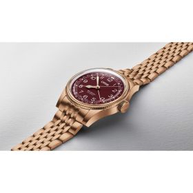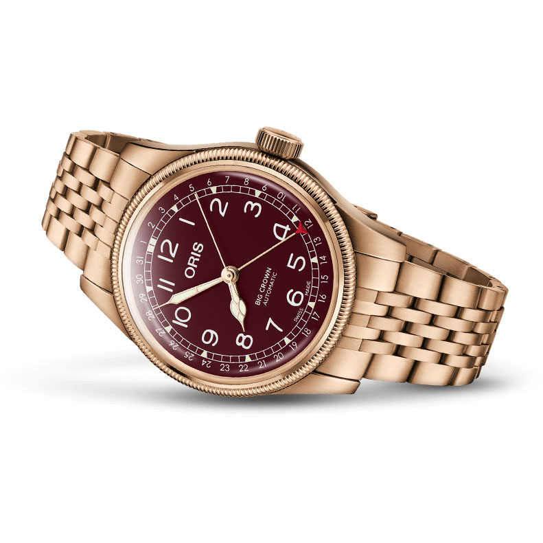 Ein Design für alle Jahreszeiten - Die Big Crown Pointer Date, die seit 1938 in kontinuierlicher Produktion ist, ist das Oris Design mit der längsten Tradition und eine Ikone der schweizerischen Uhrmacherkunst. Mit ihrer übergrossen Krone, dem roten halbmondförmig gespitzten Zeigerdatum und der geriffelten Lünette ist sie eine Oris Signatur und Synonym für zeitloses Uhrendesign. Jetzt bietet Oris sie erstmalig in Bronze mit einem Gehäuse, einer Lünette, einer Krone, einem Gliederarmband und Verschluss aus Vollbronze sowie Zifferblatt in bordeauxrot.Produktspezifikationen