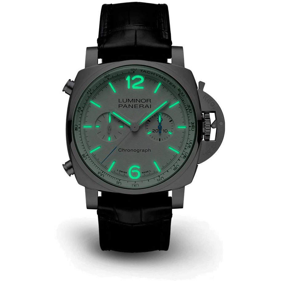 Luminor Chrono mit 44 mm Gehäuse, weißem Zifferblatt mit fluoreszierenden arabischen Ziffern und Stundenmarkierungen. Schwarzes Alligatorlederband mit Ton-in-Ton Naht, mechanisches Automatikuhrwerk, Kaliber P.9200Produktspezifikationen