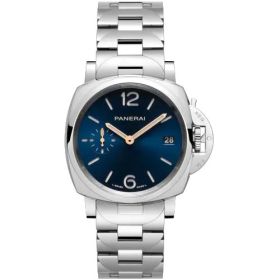 Panerai Luminor Due - 38 mm Gehäuse aus Edelstahl, Mechanisches Automatikuhrwerk Kaliber P.900 und 3 Tage Gangreserve, Zifferblatt Blau mit Sonnenschliff, fluoreszierenden arabischen Ziffern und Stundenmarkierungen. Datum auf der 3-Uhr-Position und kleine Sekunde auf der 9-Uhr-Position.- Durchmesser