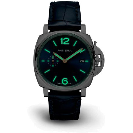 Panerai Luminor Due - 42 mm Edelstahlgehäuse, Zifferblatt Blau mit Sonnenschliff, fluoreszierenden arabischen Ziffern und Stundenmarkierungen. Datum auf der 3-Uhr-Position und kleine Sekunde auf der 9-Uhr-Position. Mechanisches Automatikuhrwerk, Kaliber P.900, 3 Tage Gangreserve. Dunkelblaues Alligatorlederarmband.Produktspezifikationen