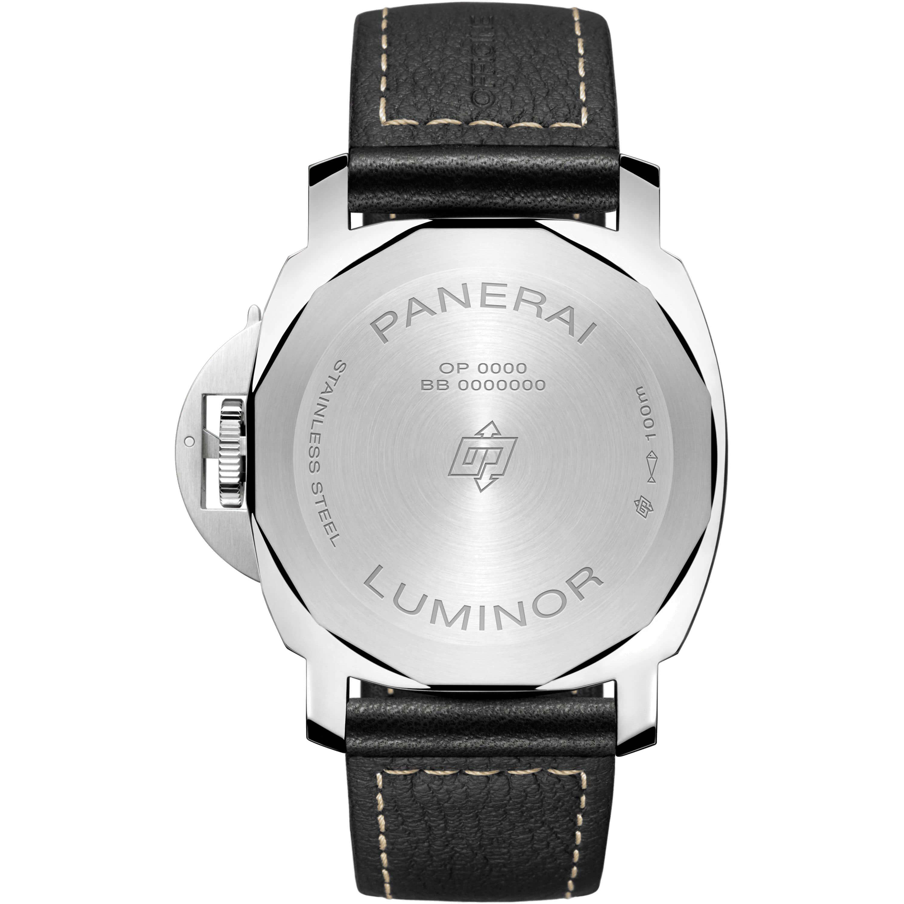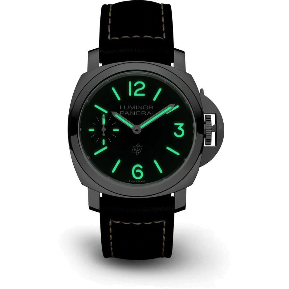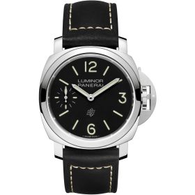 Panerai Luminor Logo - 44 mm. Mechanisches Uhrwerk mit Handaufzug, Kaliber P.6000, 3 Tage Gangreserve. Armband aus Kalbsleder "Ponte Vecchio" in Schwarz mit Ziernaht.Produktspezifikationen