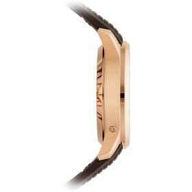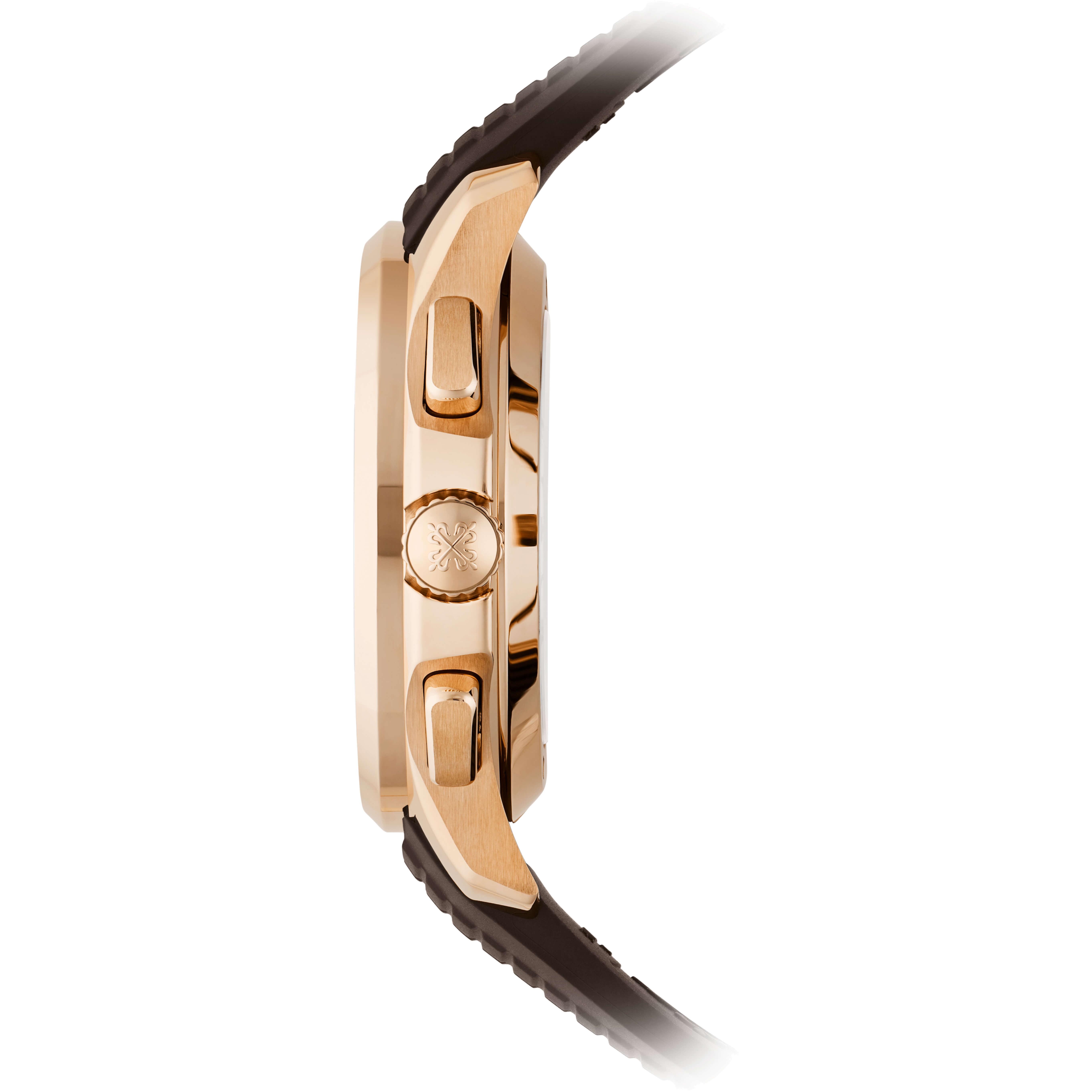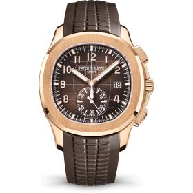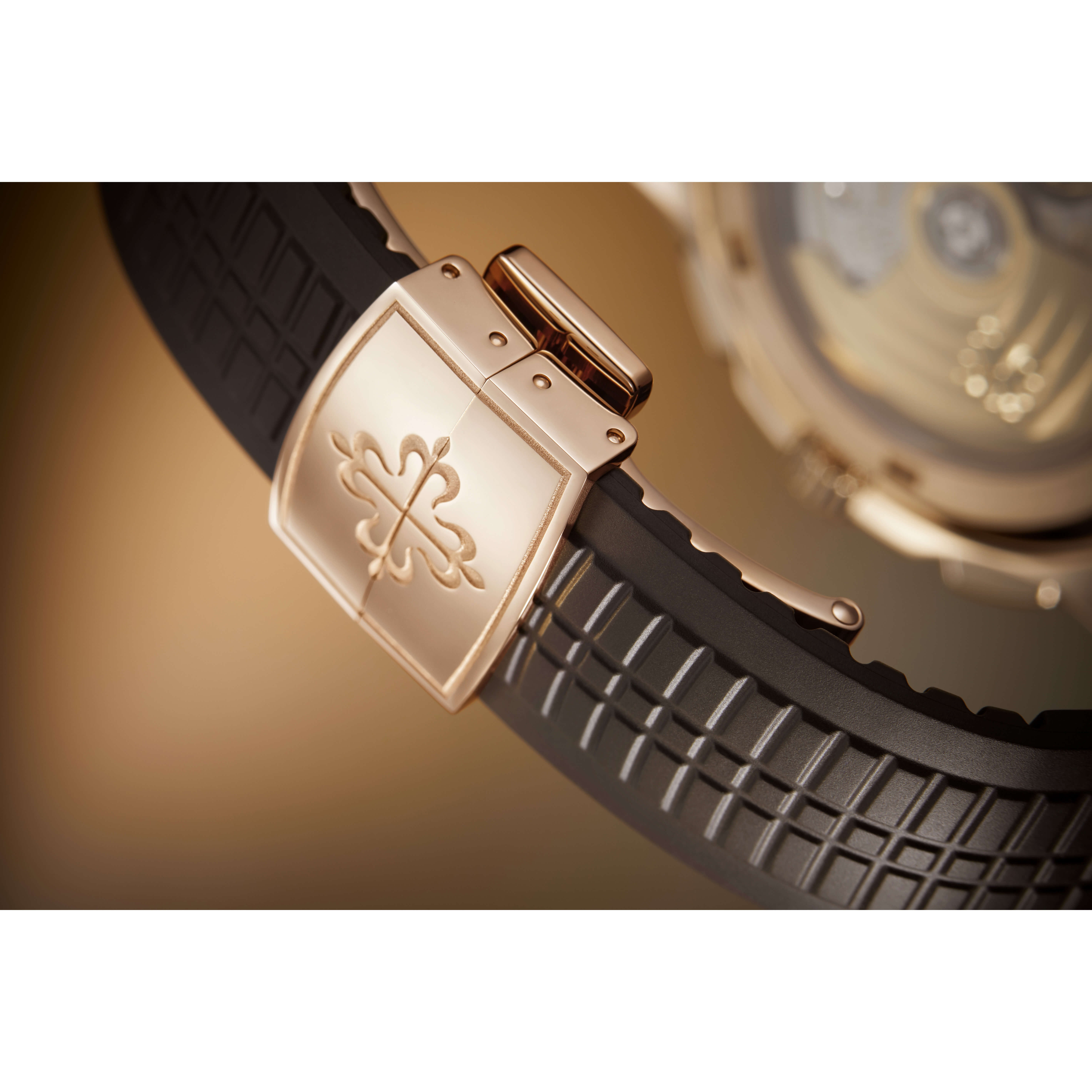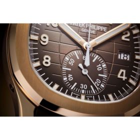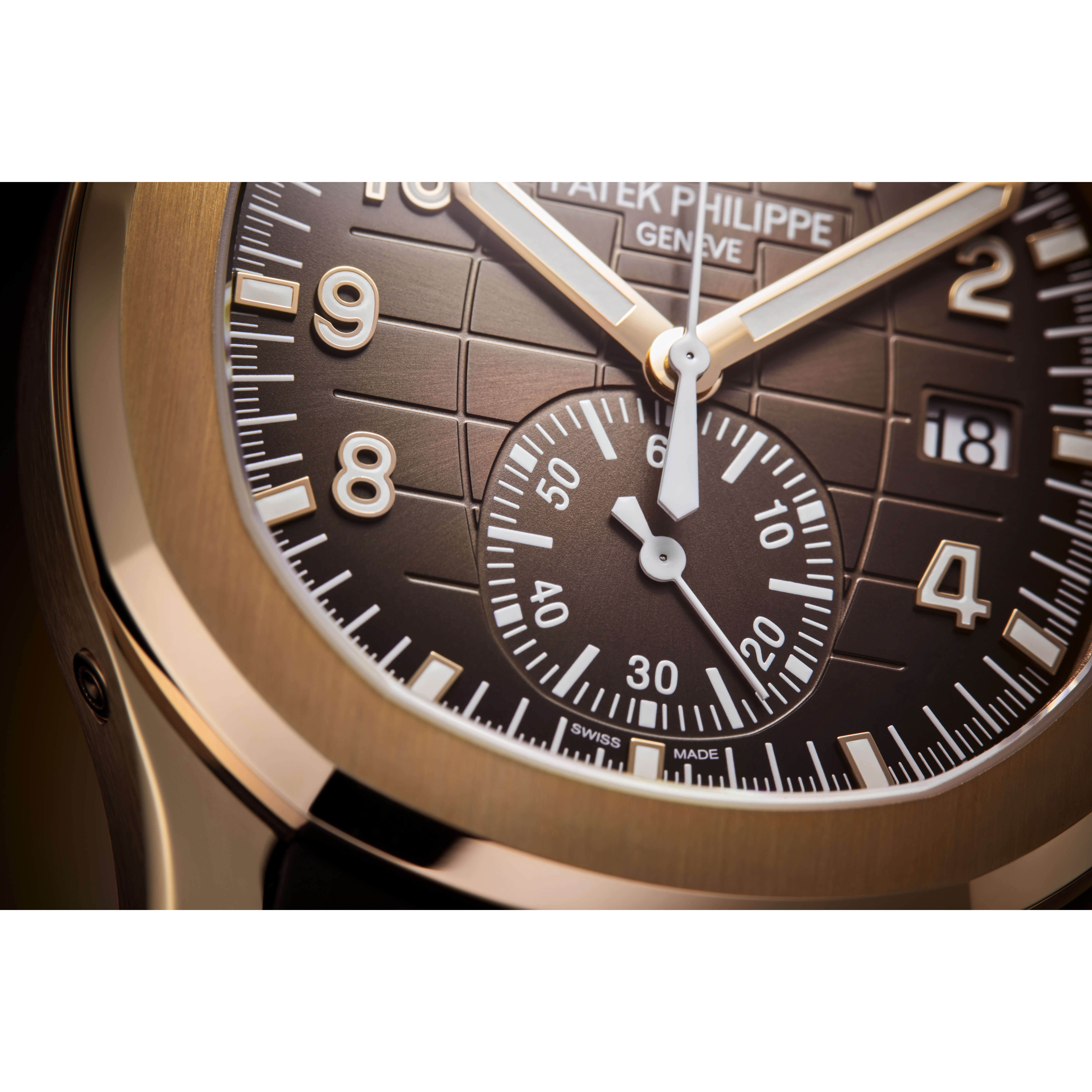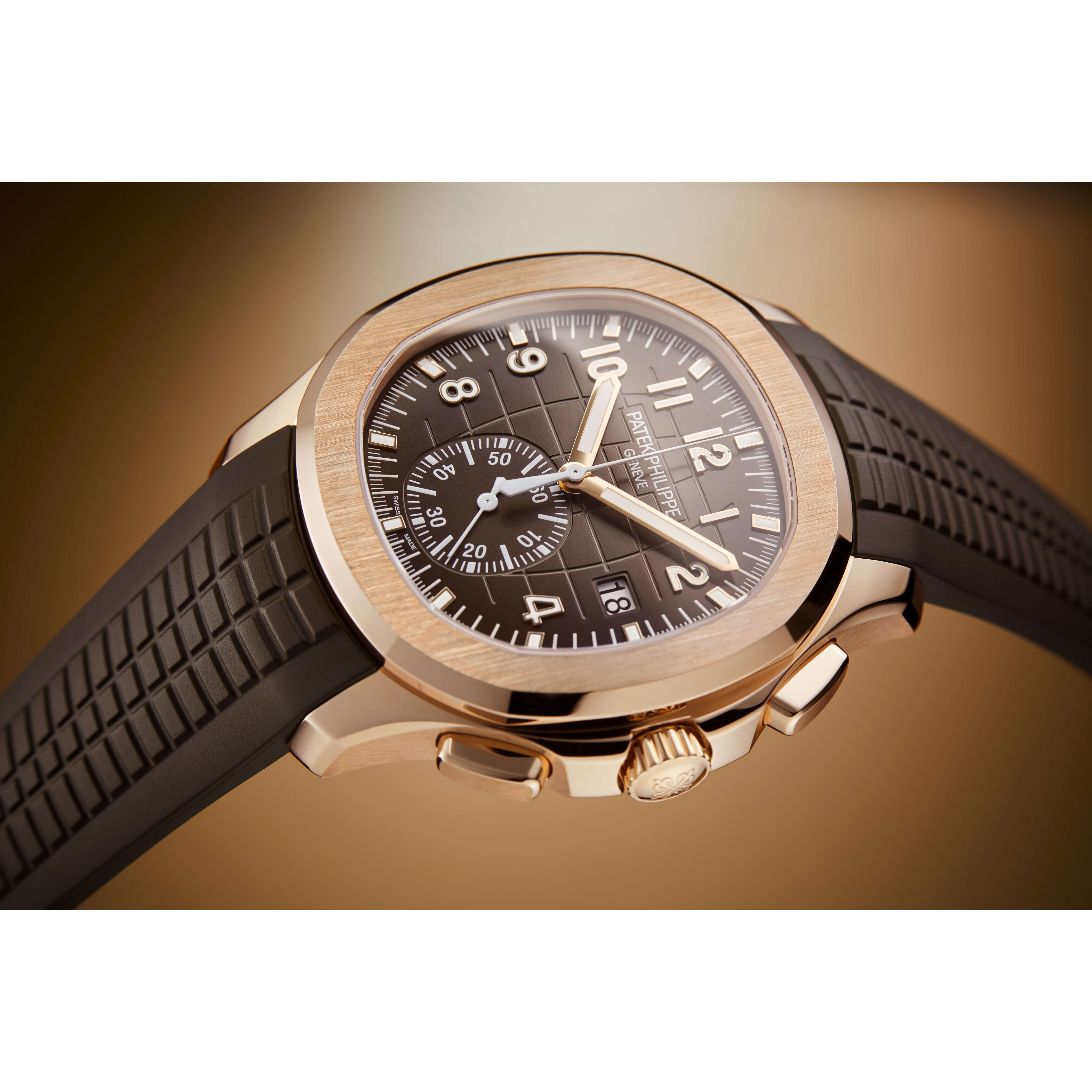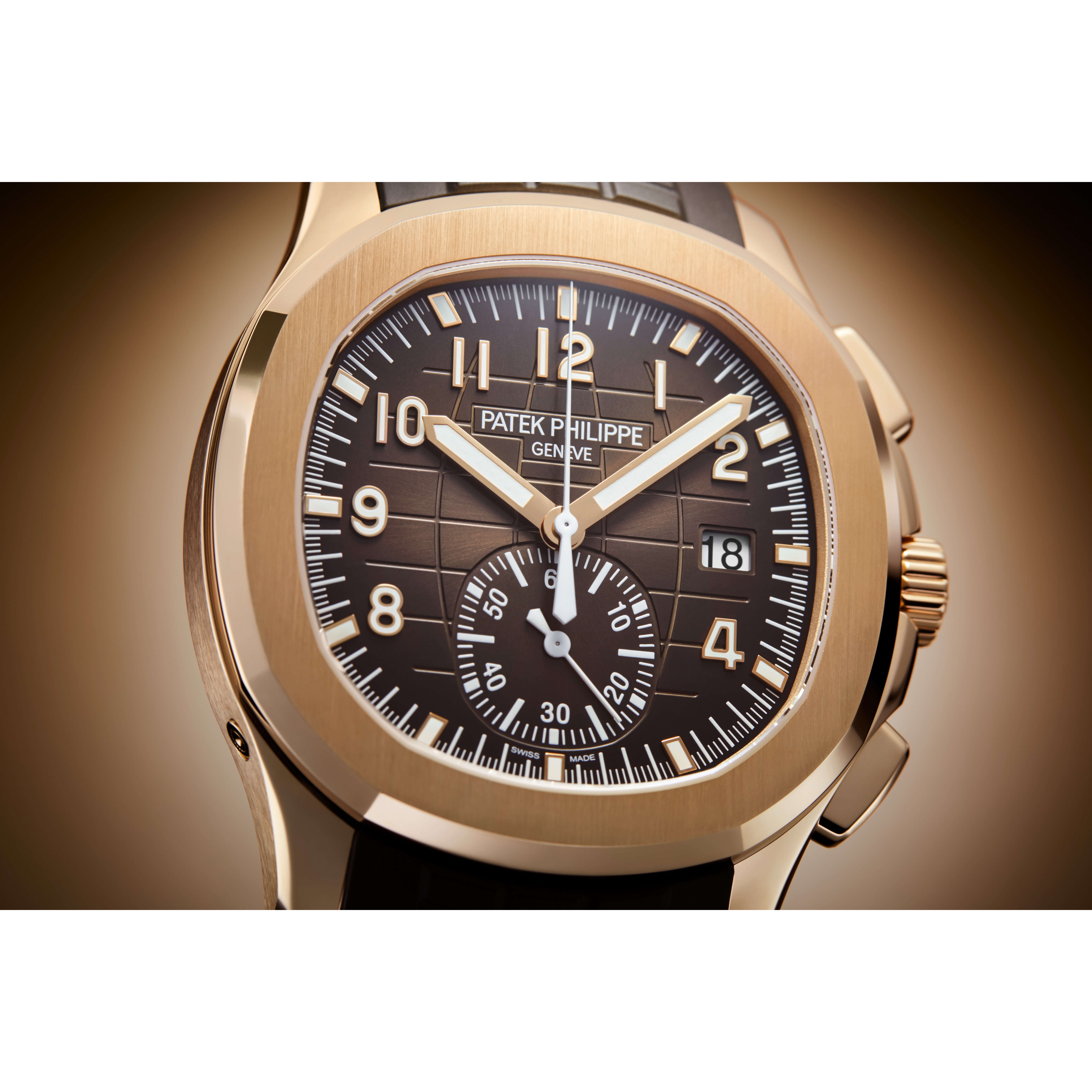 Patek Philippe lässt den sportlichen Stil des Chronographen Aquanaut in einer Version aus Roségold neu aufleben, die mit einem braunen, schwarz verlaufenden „Sonnenschliff“-Zifferblatt und einem passenden Armband kombiniert wird. Das originelle Design des Gehäuses (wasserdicht bis 30 m) und der Lünette wird durch abwechselnd polierte und satinierte Finissierungen unterstrichen. Das automatische Chronographenwerk mit Flyback-Funktion verbindet Tradition (Schaltradsteuerung) und Innovation (vertikale Scheibenkupplung). Weil diese Kupplung nahezu verschleißfrei funktioniert, kann der zentrale Chronographenzeiger auch als laufende Sekunde verwendet werden.