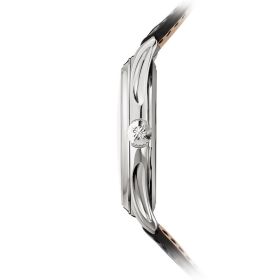 Weißgold-Gehäuse, schwarz glänzendes Allgatorlederarmband, Dornschließe, Saphirglasboden unter einem Staubdeckel mit unsichtbarem ScharnierProduktspezifikationen