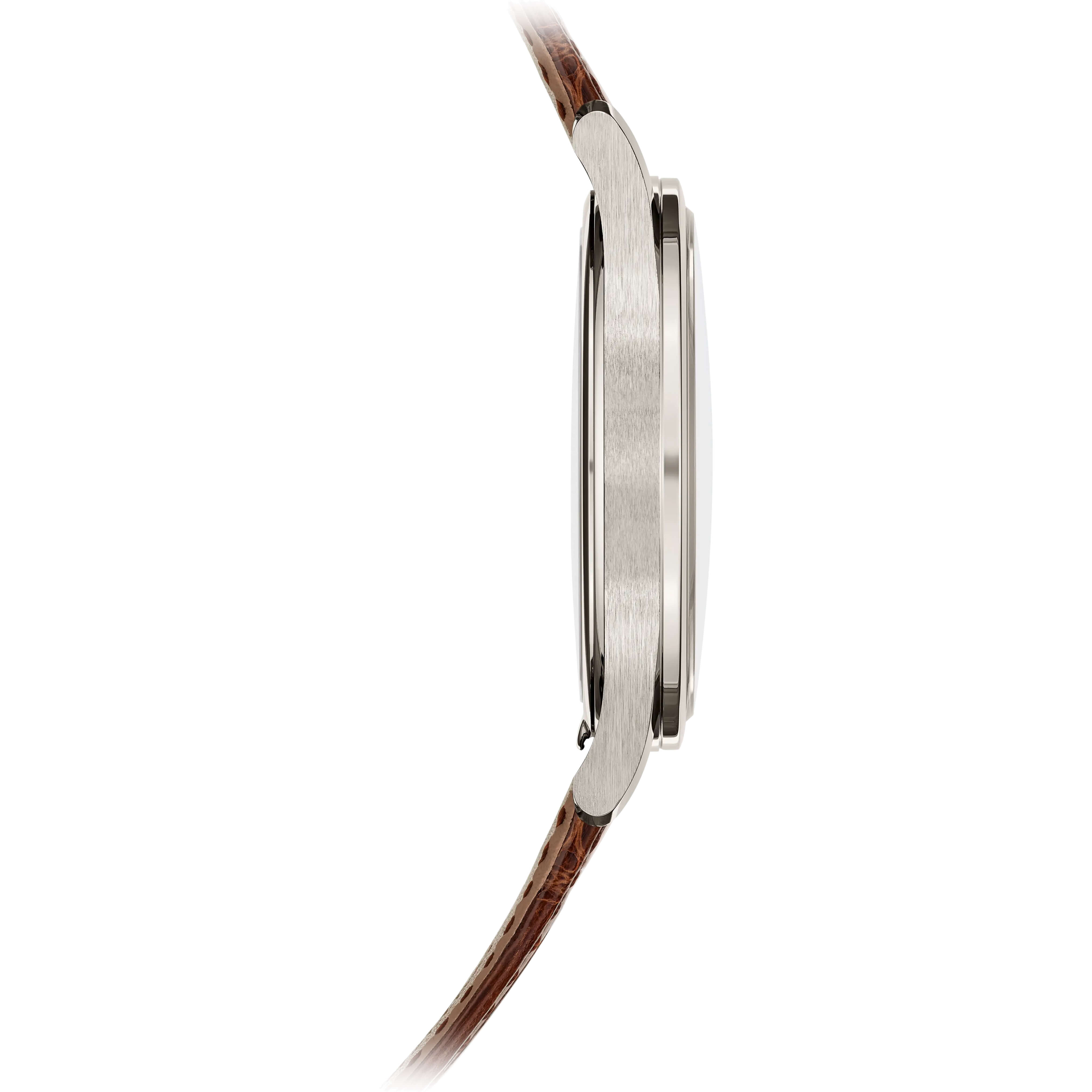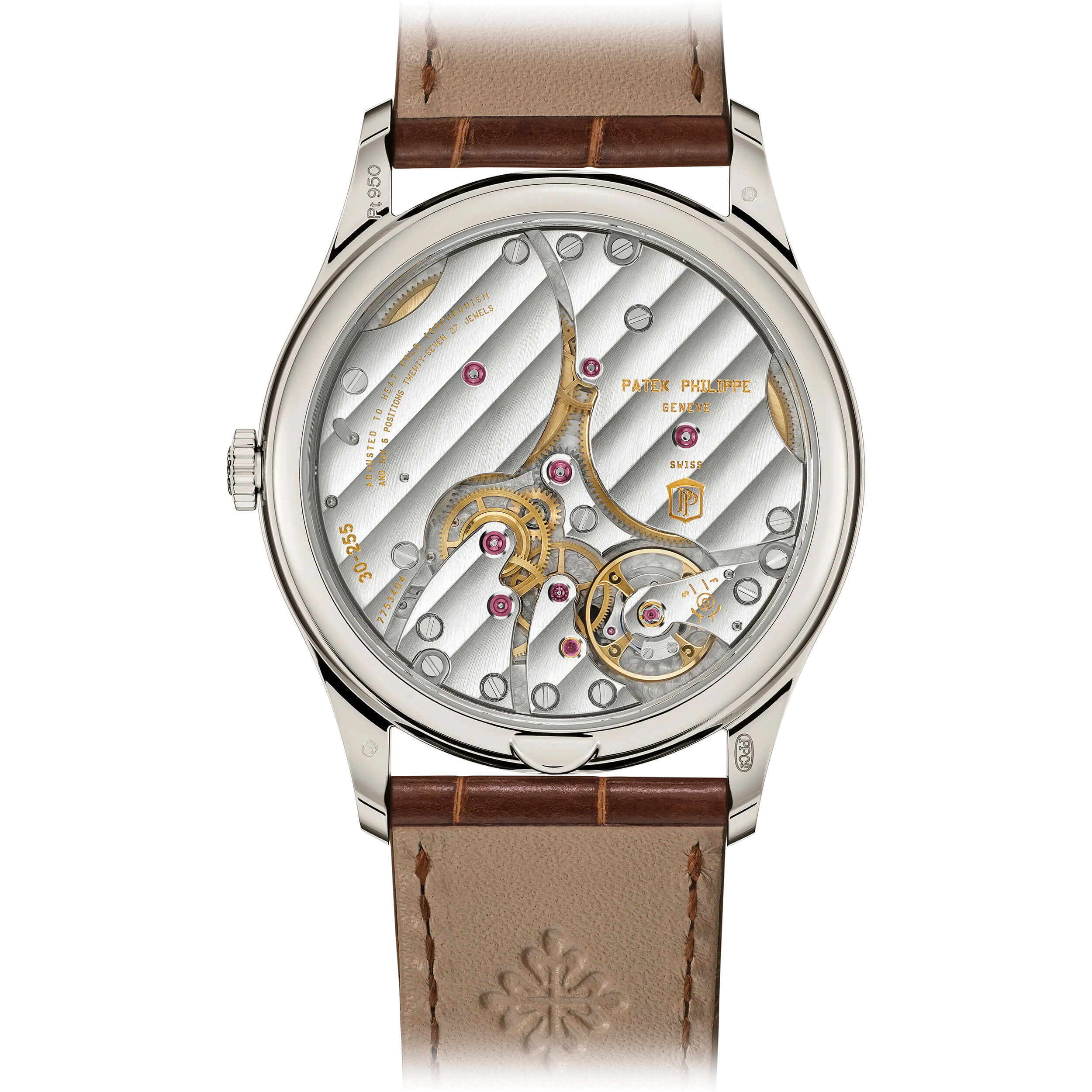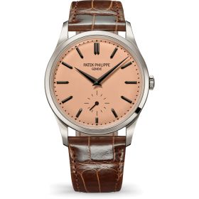 Die Calatrava-Kollektion, Sinnbild zeitloser Eleganz und unverwechselbarer Patek Philippe-Ästhetik, wird um ein neues Platinmodell erweitert. Das minimalistische Design des roségoldenen Opalin-Zifferblatts verleiht der Uhr eine subtile Vintage-Note. Das fein polierte Gehäuse besticht durch eine glatte, abgeschrägte Lünette, satinierte Flanken und schlanke Anstöße, die nahtlos in das glänzend schokoladenbraune Alligatorlederarmband übergehen. Im Inneren sorgt das Kaliber 30-255 PS mit Handaufzug für höchste Präzision. Mit einer Gangreserve von 65 Stunden und einer „Sekundenstopp“-Funktion ermöglicht es eine exakte Zeitmessung auf die Sekunde genau.Produktspezifikationen