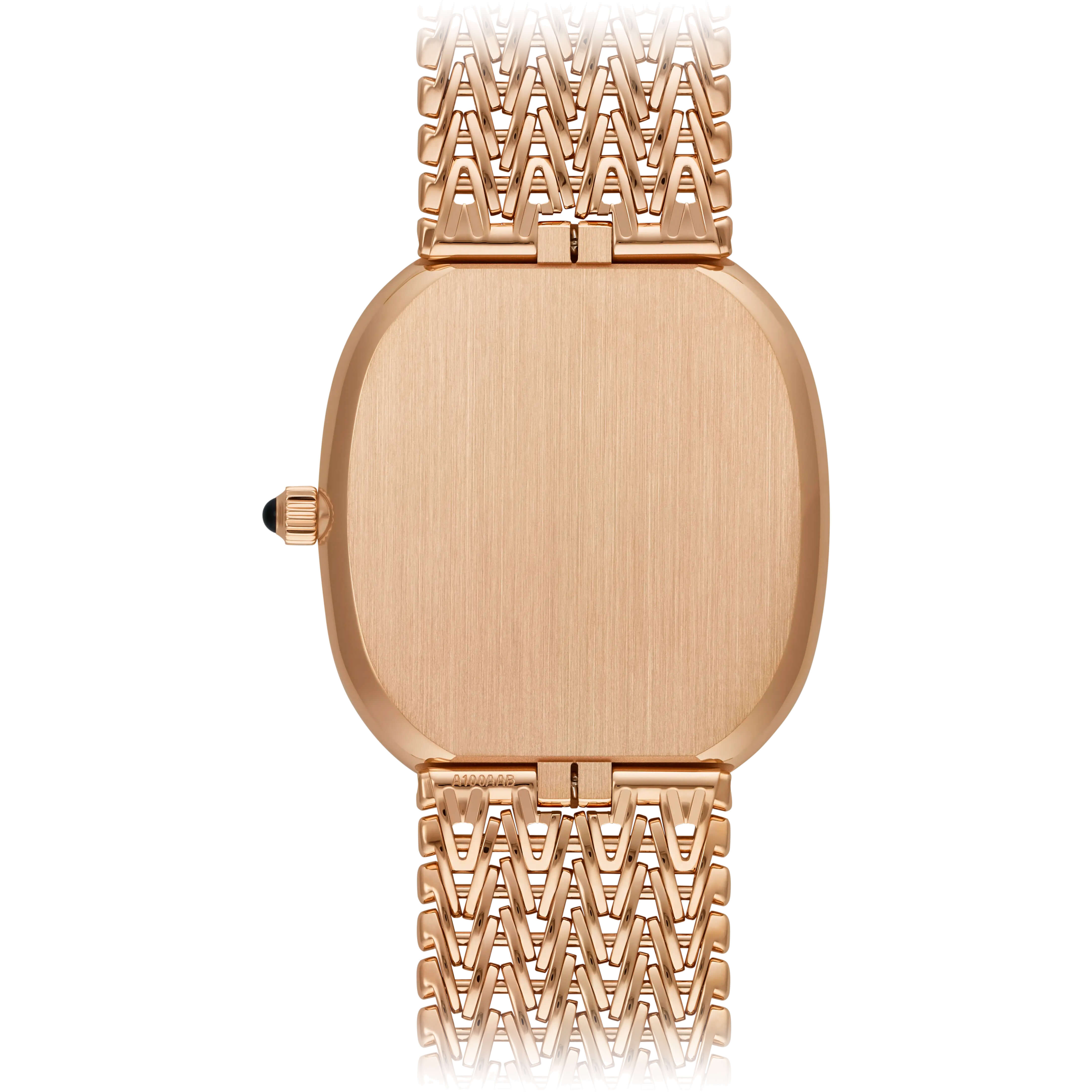 Patek Philippe hat die legendäre Golden Ellipse mit einem exklusiven Armband ausgestattet, das durch eine moderne, patentierte Konstruktion besticht. Das geschmeidige, elegante Armband aus Roségold besteht aus feinen Gliederreihen, die an klassische Kettenarmbänder erinnern. Mit seiner gravierten Schließe und drei Einstellmöglichkeiten zollt es der Ästhetik der 1970er-Jahre Tribut – jener Ära, in der die Golden Ellipse zu einer wahren Ikone wurde.Produktspezifikationen