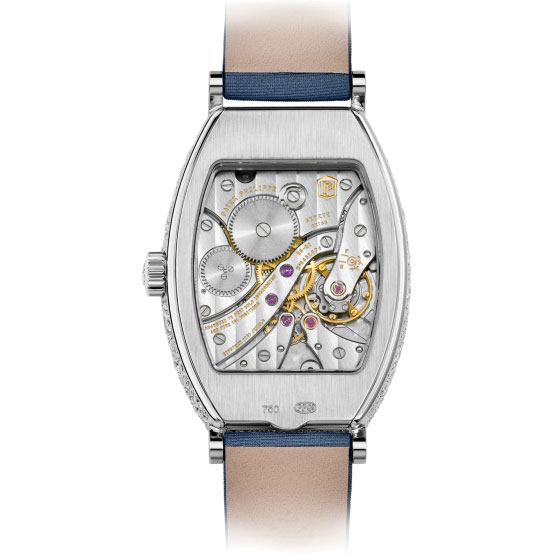 In der Gondolo Kollektion ist ein Großteil der Patek Philippe Formuhren zusammengefasst. Das sind alle Uhren mit rechteckigen, tonneau- oder kissenförmigen Uhrengehäusen. Mit ihren prägnanten Konturen, ihrem zeitlosen Stil, ihren klaren Formen und außergewöhnlichen Uhrwerken präsentieren diese Uhren eine sehr zeitgemäße Interpretation des Art Déco, das zu den goldenen Epochen von Patek Philippe zählt. Die Manufaktur lässt auch historische Uhren aus der Manufakturgeschichte, die zur Sammlung des Patek Philippe Museums gehören, in dieser Kollektion wiederaufleben. Gehäuse mit 480 Diamanten (ca. 3,31 ct.), rasterloser Vollbesatz. Hand guillochiertes Gold-Zifferblatt mit 367 Diamanten (ca. 0,56 ct), Goldcabochon-Indexe. Dornschließe mit 26 Diamanten (ca. 0,15 ct.). Gesamt: 873 Diamanten (ca. 4,02 ct.).