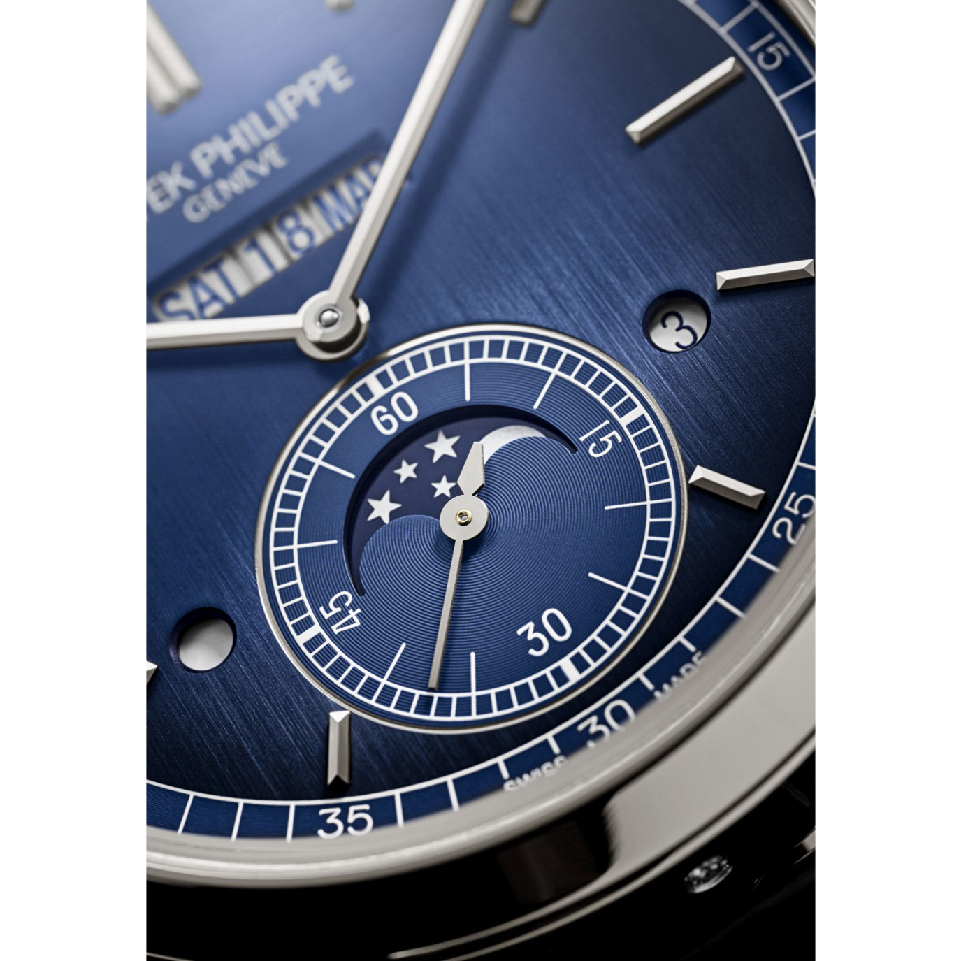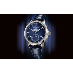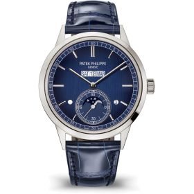 Patek Philippe ergänzt sein breit gefächertes Kalenderuhrensortiment um einen ganz neuen ewigen Kalender mit innovativer Anzeige-Linie. Tag, Datum und Monat sind hier in einem einzigen großen Fenster bei 12 Uhr untergebracht. Um eine originelle, aber auch gut ablesbare und zuverlässige Uhr anbieten zu können, entwickelten die Konstrukteure das mechanische Uhrwerk 31-260 PS QL mit automatischem Aufzug und passendem Zusatzmodul für die Anzeige auf einer Linie. Darauf wurden drei Patente angemeldet. Diese neue Grande Complication wurde passgenau in ein elegantes Platin-Gehäuse eingefügt und mit einem Zifferblatt in Blau mit Schwarz-Verlauf und vertikalem Satinschliff kombiniert.Produktspezifikationen