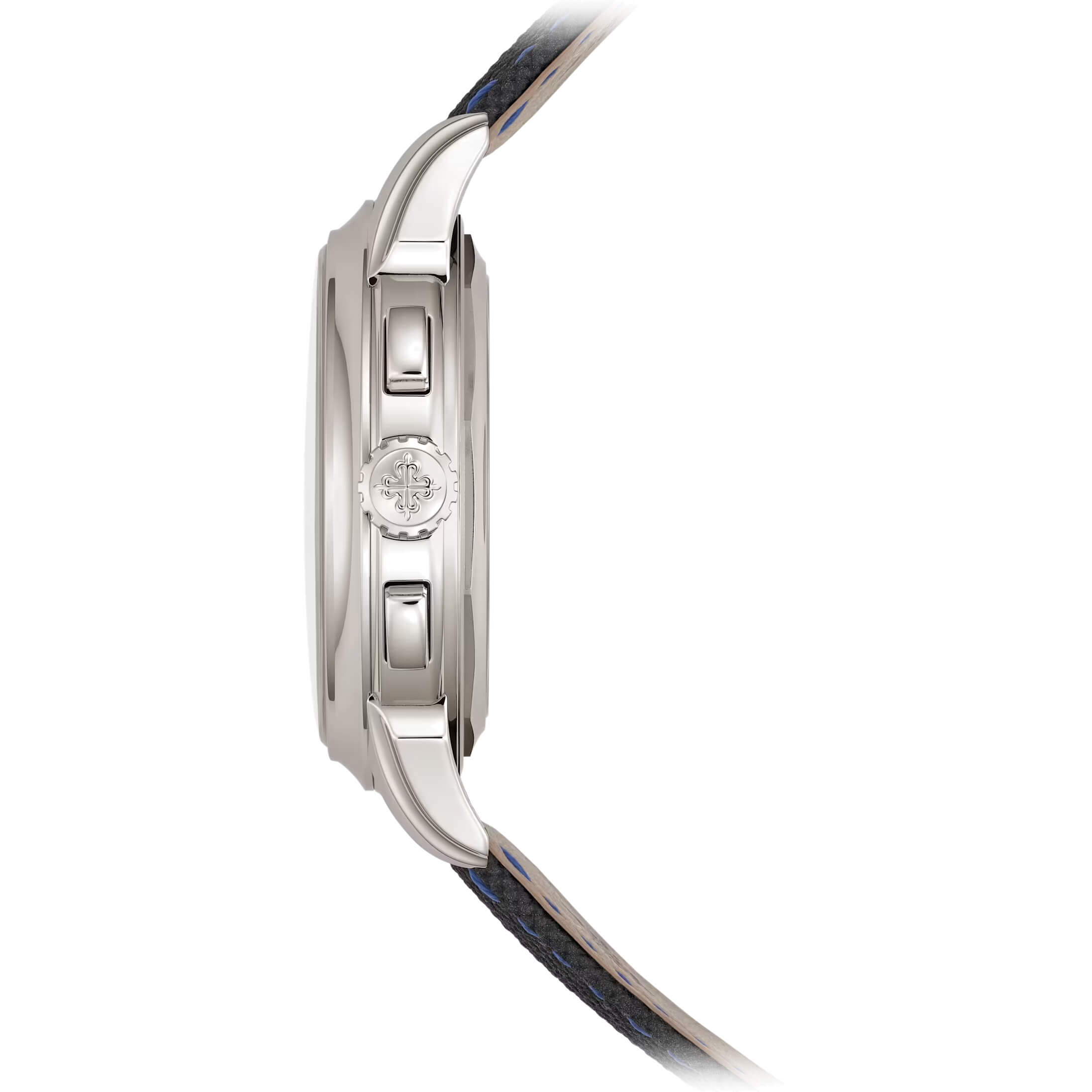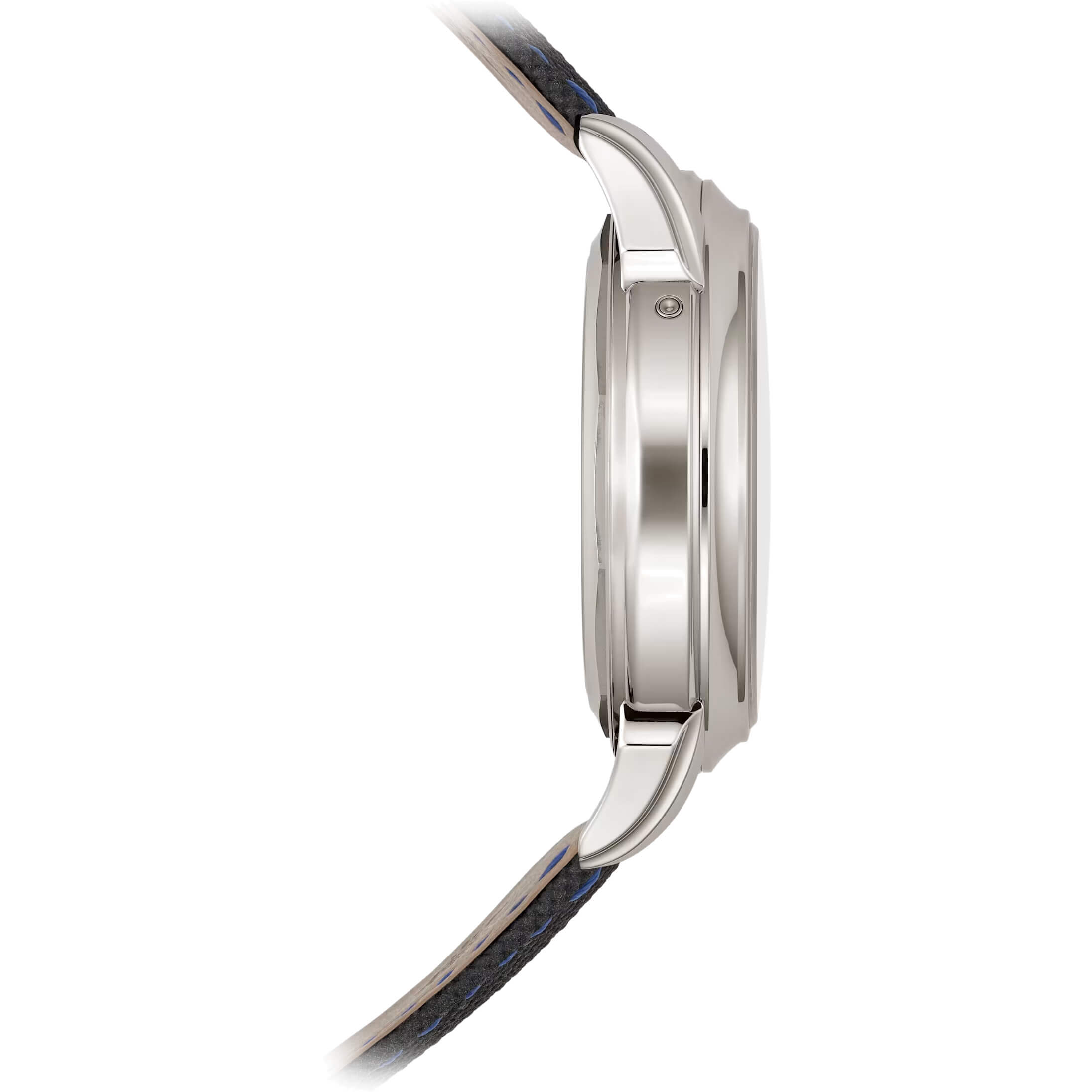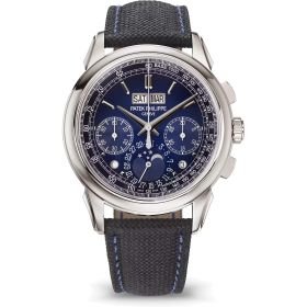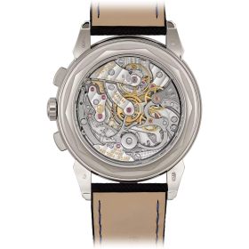 Diese moderne Interpretation des ewigen Kalender-Chronographen verbindet sportliche Eleganz mit klassischer Haute Horlogerie. Das vollständig polierte Platingehäuse mit konkaver Lünette und zweistufigen Bandanstößen verleiht der Uhr eine dynamische, zugleich elegante Präsenz, während ein bei 6 Uhr gesetzter Diamant ein dezentes, exklusives Detail bildet. Das lackierte blaue Zifferblatt mit schwarzem Farbverlauf am Rand wirkt tief und technisch zugleich. Facettierte, applizierte Stundenmarkierungen sowie Dauphine-Zeiger aus Weißgold unterstreichen die präzise Gestaltung, während die aufgedruckte Tachymeterskala die sportliche Ausrichtung betont. Die Anzeigen des ewigen Kalenders sind funktional und klar strukturiert: Tag und Monat erscheinen in einer Doppelöffnung bei 12 Uhr, ergänzt durch Anzeigen für Tag/Nacht und Schaltjahr in separaten Fenstern sowie das Datum über einen Zeiger bei 6 Uhr. Eine Mondphasenanzeige und die kleine Sekunde vervollständigen das Zifferbild. Im Inneren arbeitet das Handaufzugskaliber CH 29-535 PS Q, ein hochentwickeltes Chronographenwerk mit klassischer Architektur und sechs patentierten Innovationen im Chronographenmechanismus. Es vereint traditionelle Konstruktion mit modernster Feinabstimmung und ermöglicht eine präzise, sofort springende 30-Minuten-Zählung bei integrierter ewiger Kalenderfunktion. Das Werk umfasst 456 Komponenten und zeichnet sich durch hohe technische Raffinesse sowie eine Gangreserve von bis zu 65 Stunden bei deaktiviertem Chronographen aus. Die Frequenz von 4 Hz sorgt für eine stabile und präzise Zeitmessung. Durch den Saphirglasboden offenbart sich die sorgfältig finissierte Mechanik in ihrer ganzen Tiefe. Abgerundet wird das Design durch ein schwarzes Composite-Armband mit Textilstruktur und kontrastierenden Nähten sowie eine elegante Faltschließe aus Platin. Diese Uhr vereint sportliche Funktionalität, technische Komplexität und klassische Uhrmacherkunst in vollendeter Form.Produktspezifikationen