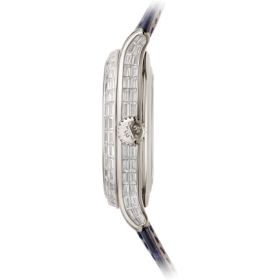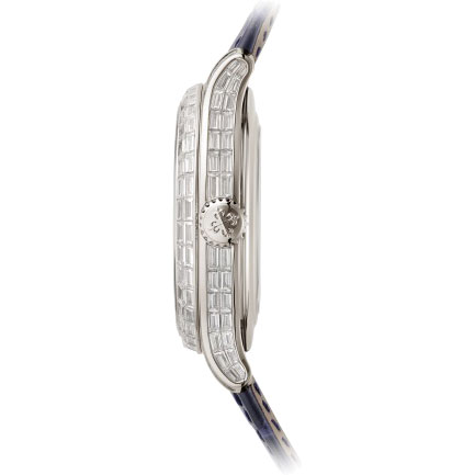 Patek Philippe hat die Referenz 5374 — eine Mischung aus zwei sehr begehrten Grandes Complications — in einer neuen cloisonné Version aus Platin mit blau lackiertem Zifferblatt virtuos neu interpretiert. Das Platingehäuse mit seinem subtilen kurvigen Formenspiel ist mit Diamanten im Baguetteschliff besetzt, die eine leuchtende Geometrie zeichnen. Die konkave Lünette bildet mit einer Doppelreihe Diamanten im Baguetteschliff einen perfekten Kreis. Der Höhenring ist ebenfalls mit Baguetteschliff-Diamanten und auf Höhe der Stunden mit Indexen aus blauen Baguetteschliff- Saphiren verziert. Dieses originelle Design bildet ein „Amphitheater“ um das Zifferblatt und sorgt für eine spektakuläre Tiefenwirkung. Die Ausgewogenheit der Anzeigen des ewigen Kalenders mittels Zeiger, die sich von dem blau lackierten Hintergrund mit Schwarz-Verlauf am Rand abheben, wird so besonders hervorgehoben. Das Kaliber R 27 Q mit automatischem Aufzug verfügt über eine Minutenrepetition mit Schlagwerk auf zwei „Kathedralen“-Tonfedern, die das Uhrwerk fast zweimal umrunden und einen vollen und tiefen Klang erzeugen.Produktspezifikationen