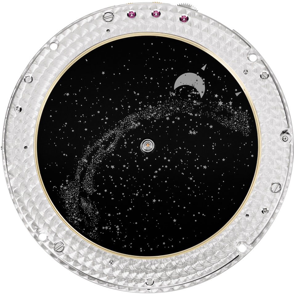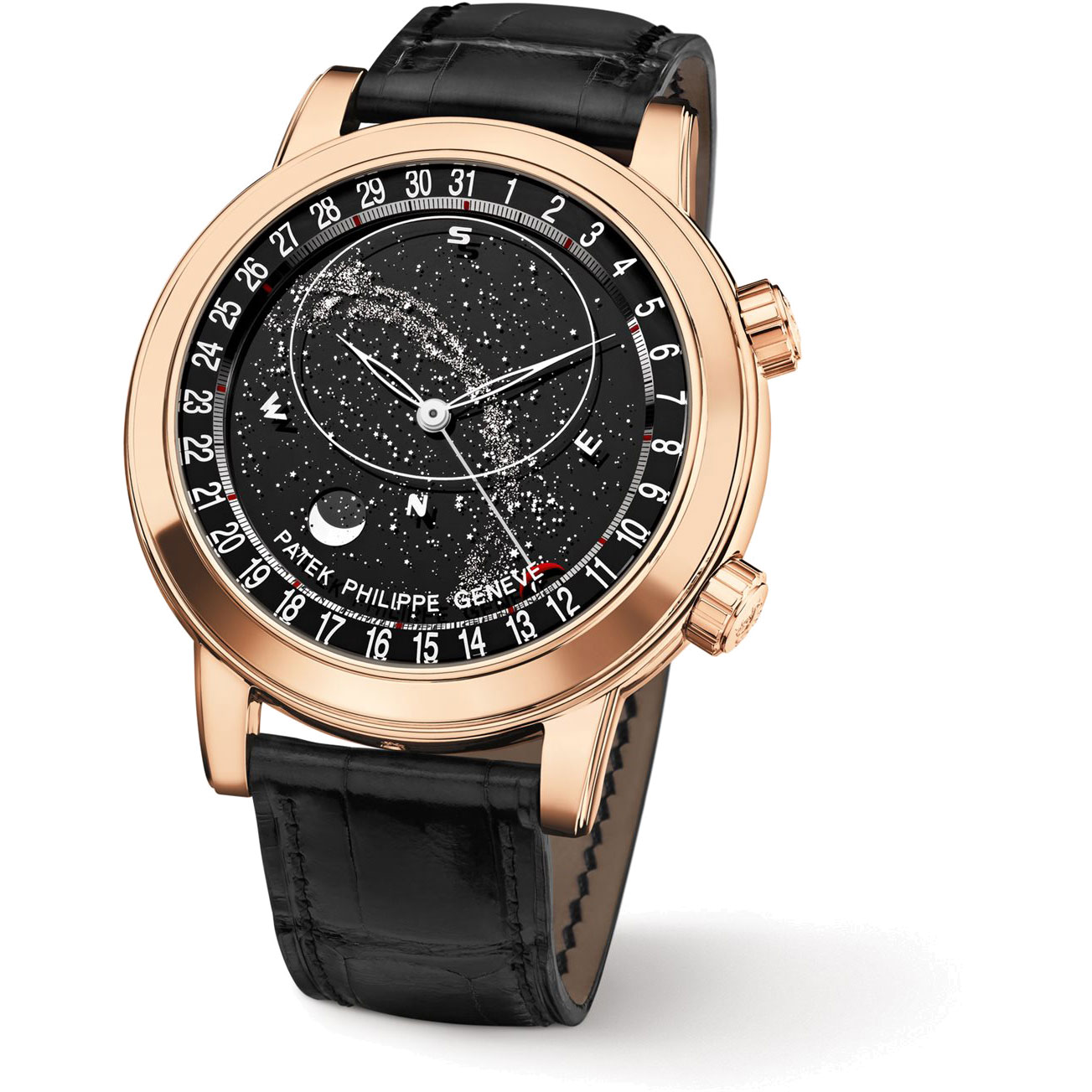 Die Celestial zeigt auf ihrem Zifferblatt eine bewegliche Sternkarte und erweist damit der großen Tradition der astronomischen Patek Philippe Uhren die Reverenz. Sie hat ein mechanisches Werk mit automatischem Aufzug. Kaliber 240 LU CL C. Zeigerdatum. Stunden und Minuten der gesetzlichen Zeit (mittlere Sonnenzeit). Sternkarte, Phasen und Winkelbewegung des Mondes, Zeit der Meridiandurchgänge von Sirius und Mond. Zeit der Meridiandurchgänge von Sirius und Mond. Blaue Saphirglasscheiben für Himmels-Hintergrund und Mondphasen. Das Zifferblatt hat schwarze Saphirglasscheiben für den Himmelshintergrund und die Mondphasen. Transparente Saphirglasscheibe für die Sternkarte und die Milchstraße. Das Gehäuse besteht aus Roségold mit Saphirglasboden. Wasserdicht bis 30 m. Gehäusedurchmesser: 44 mm. Der Zeitmesser hat ein Alligatorband mit quadratischen Schuppen, handgenäht, schwarz glänzend. Faltschließe.Produktspezifikationen