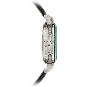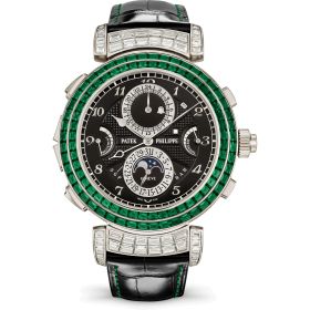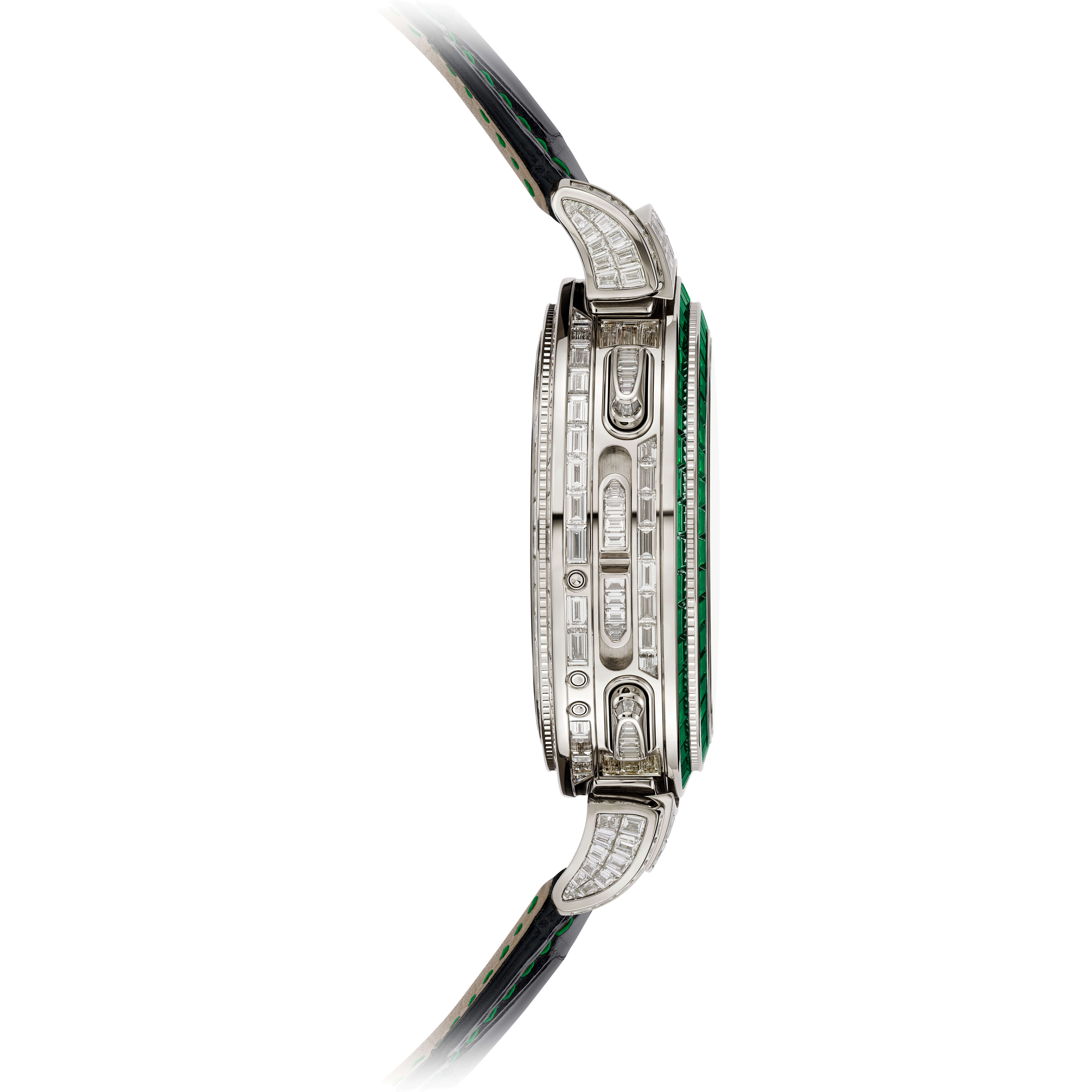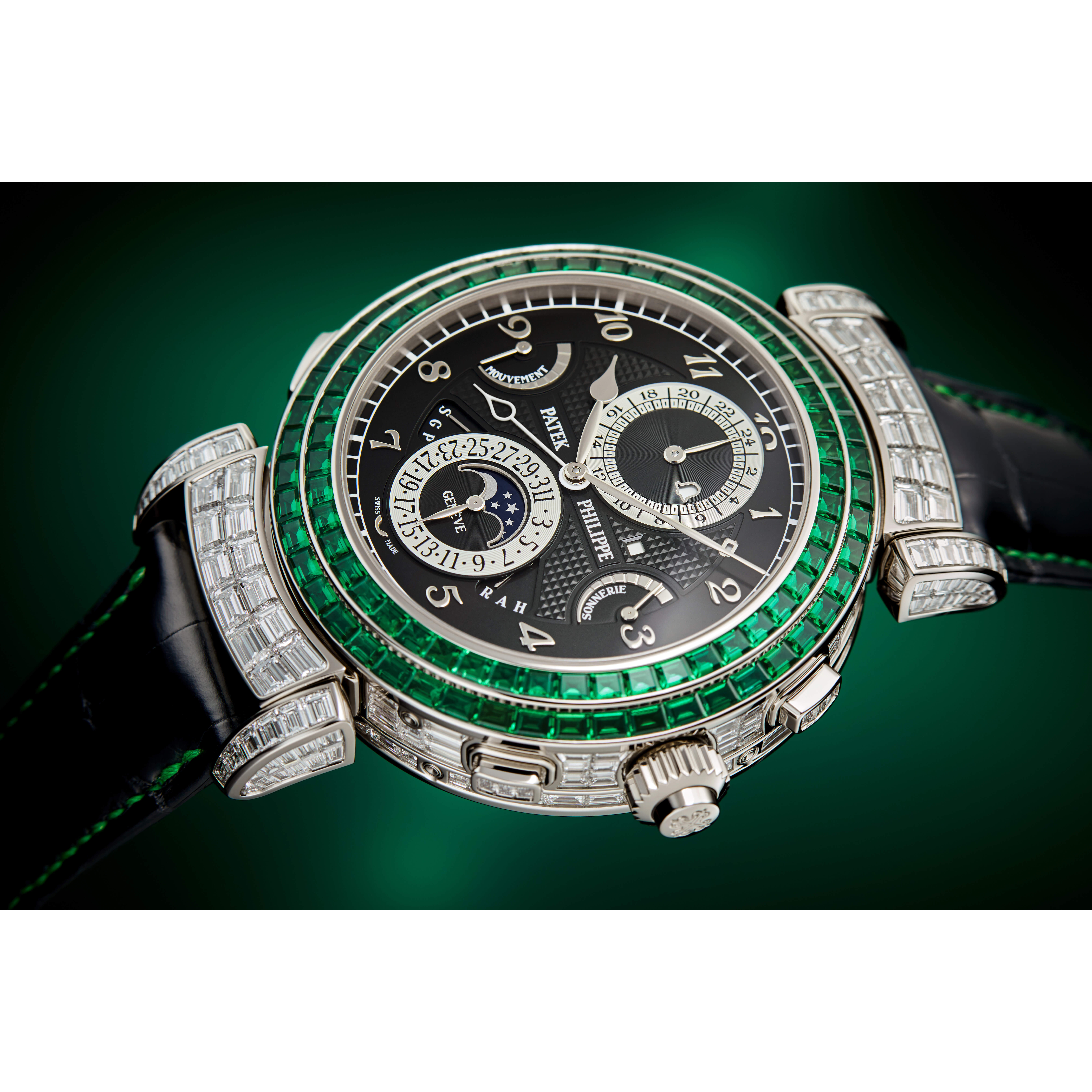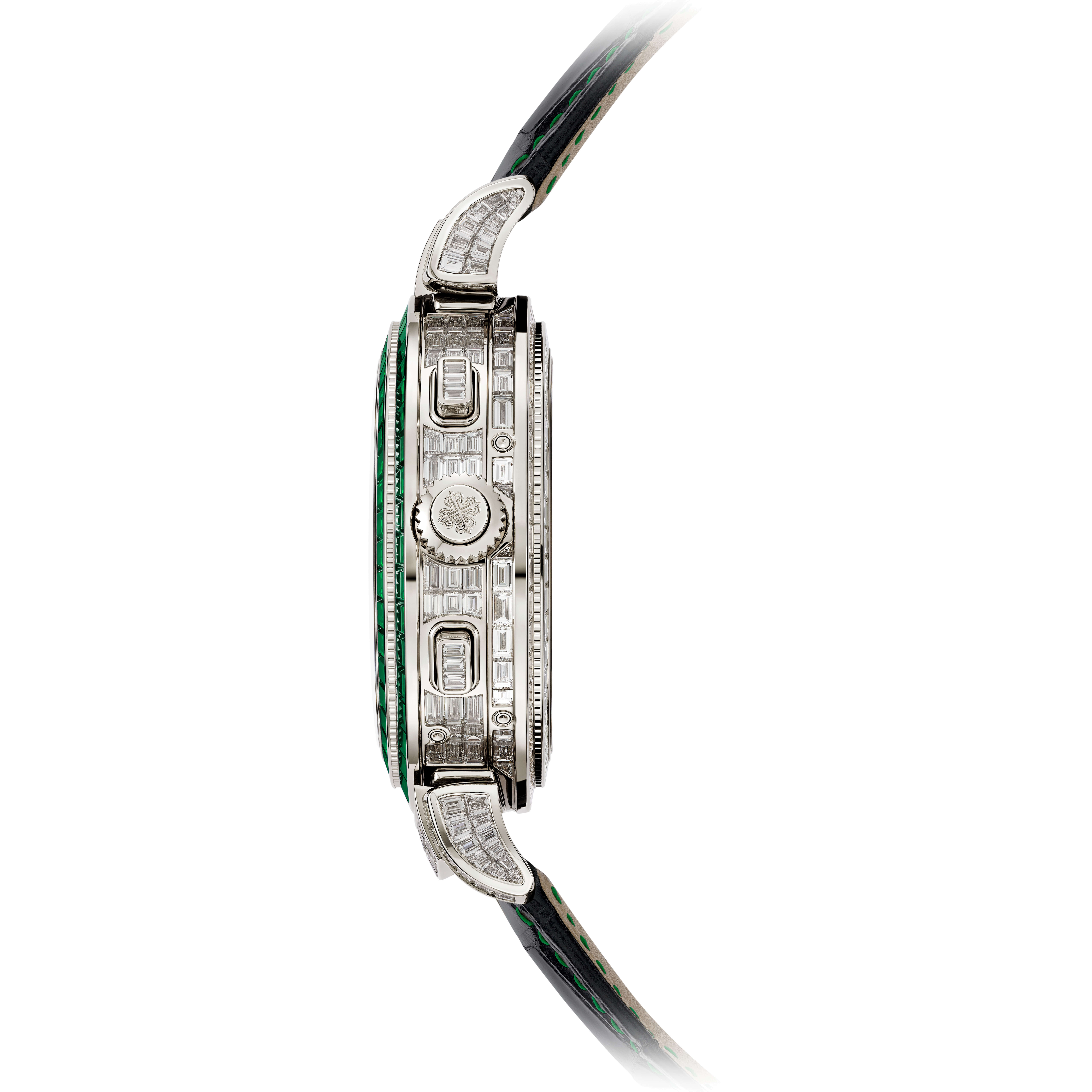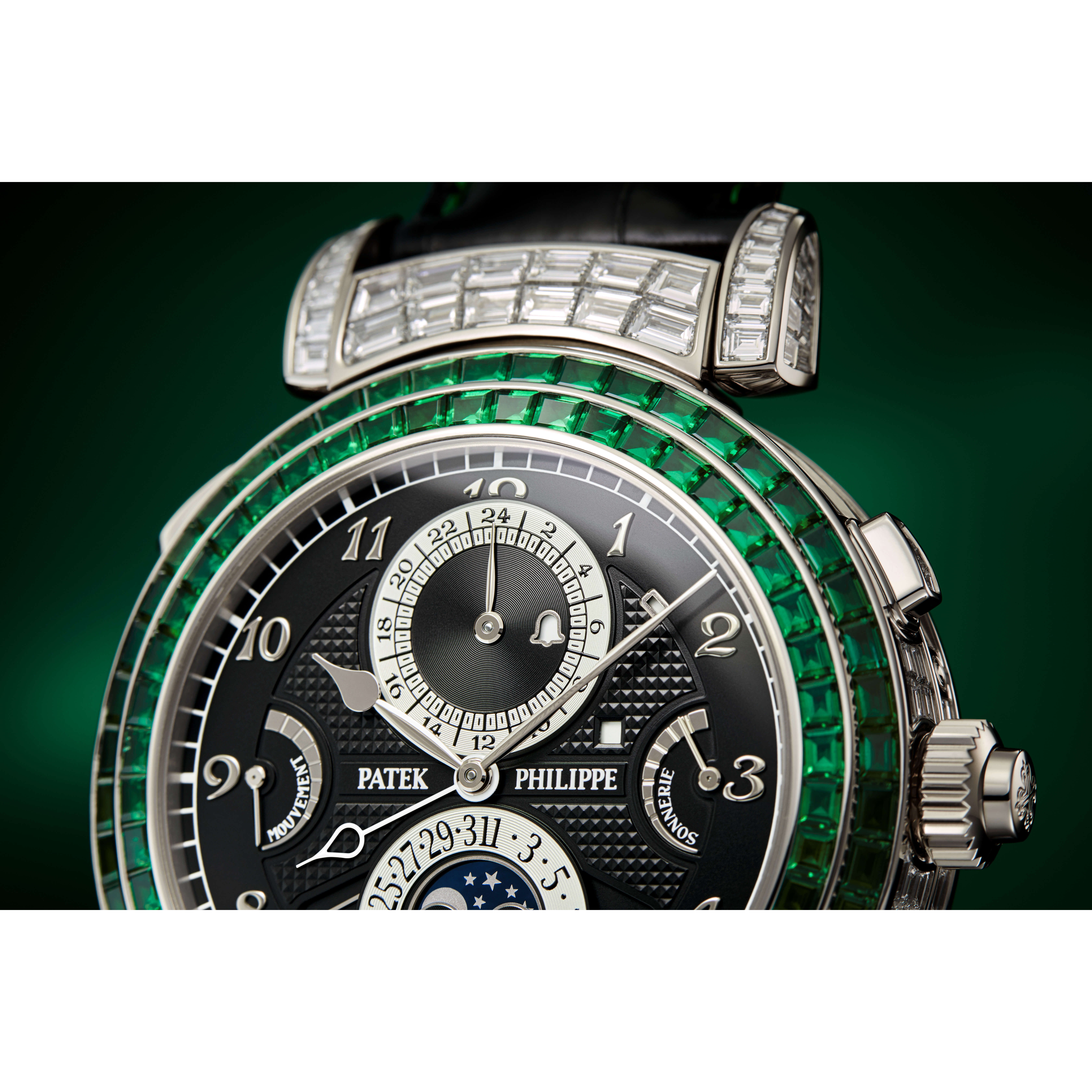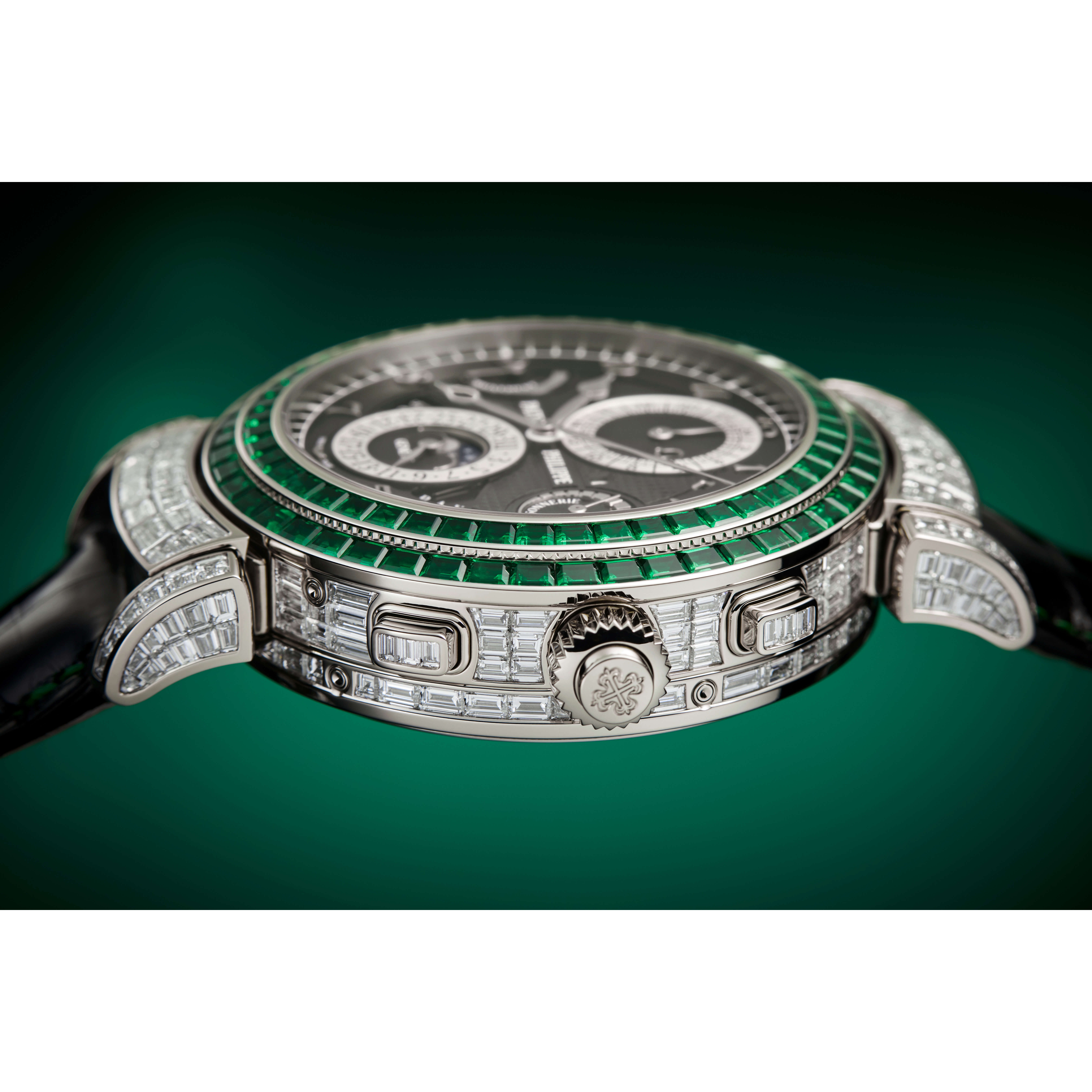 Patek Philippe verbindet hohe Uhrmacherkunst mit hoher Juwelierkunst und interpretiert seine komplizierteste Armbanduhr neu in einer Version aus Weißgold mit 118 Baguetteschliff-Smaragden (7,87 K) und 291 Baguetteschliff-Diamanten (20,54 K) in „unsichtbarer Fassung“.Produktspezifikationen