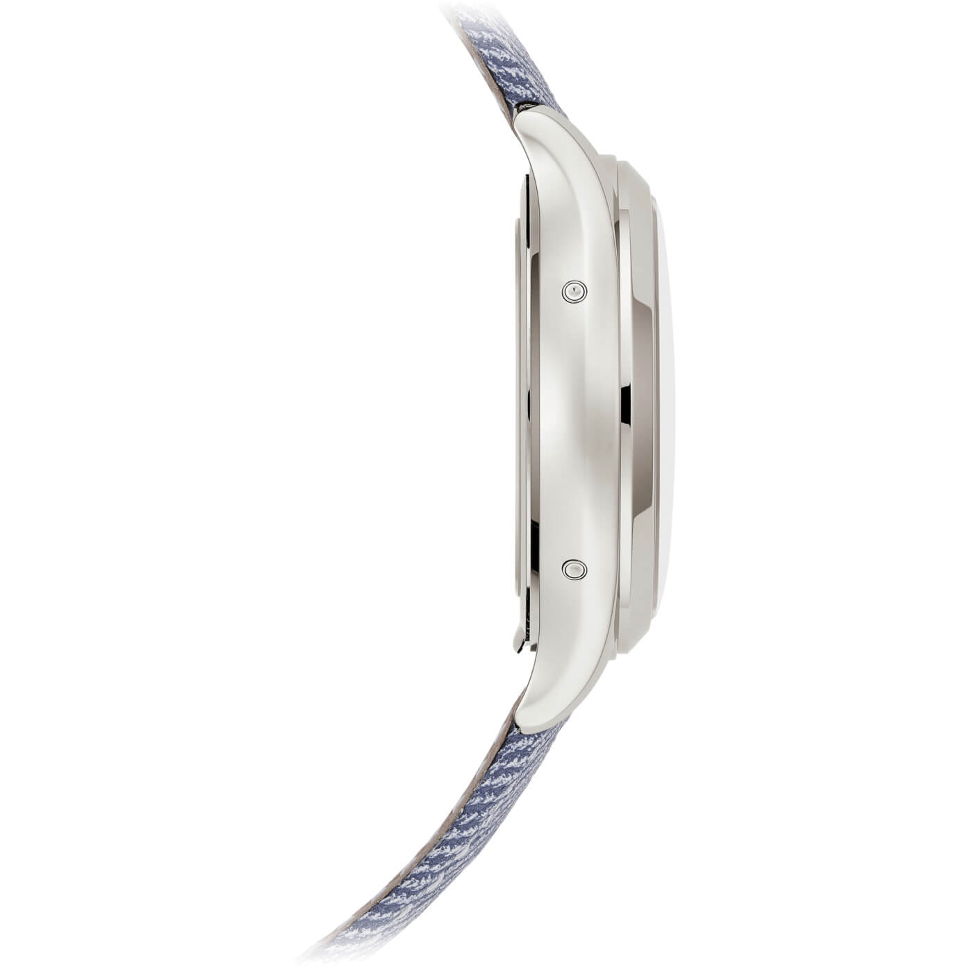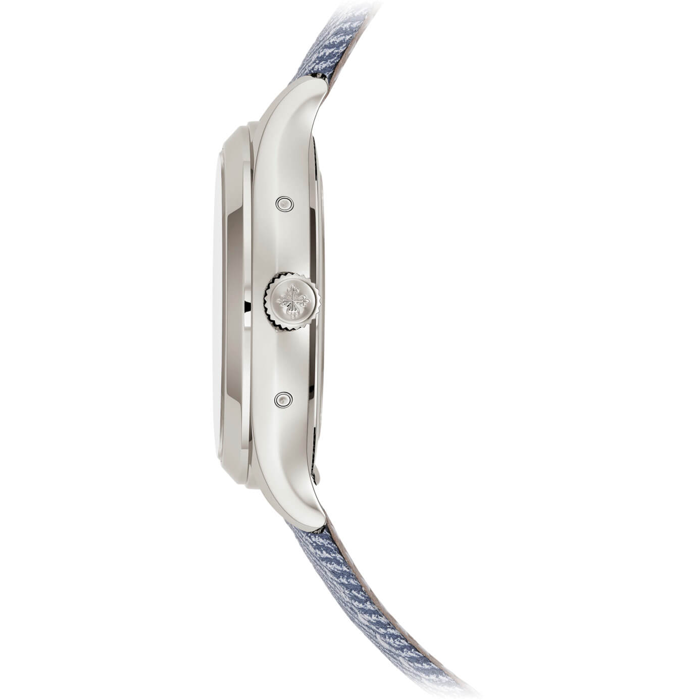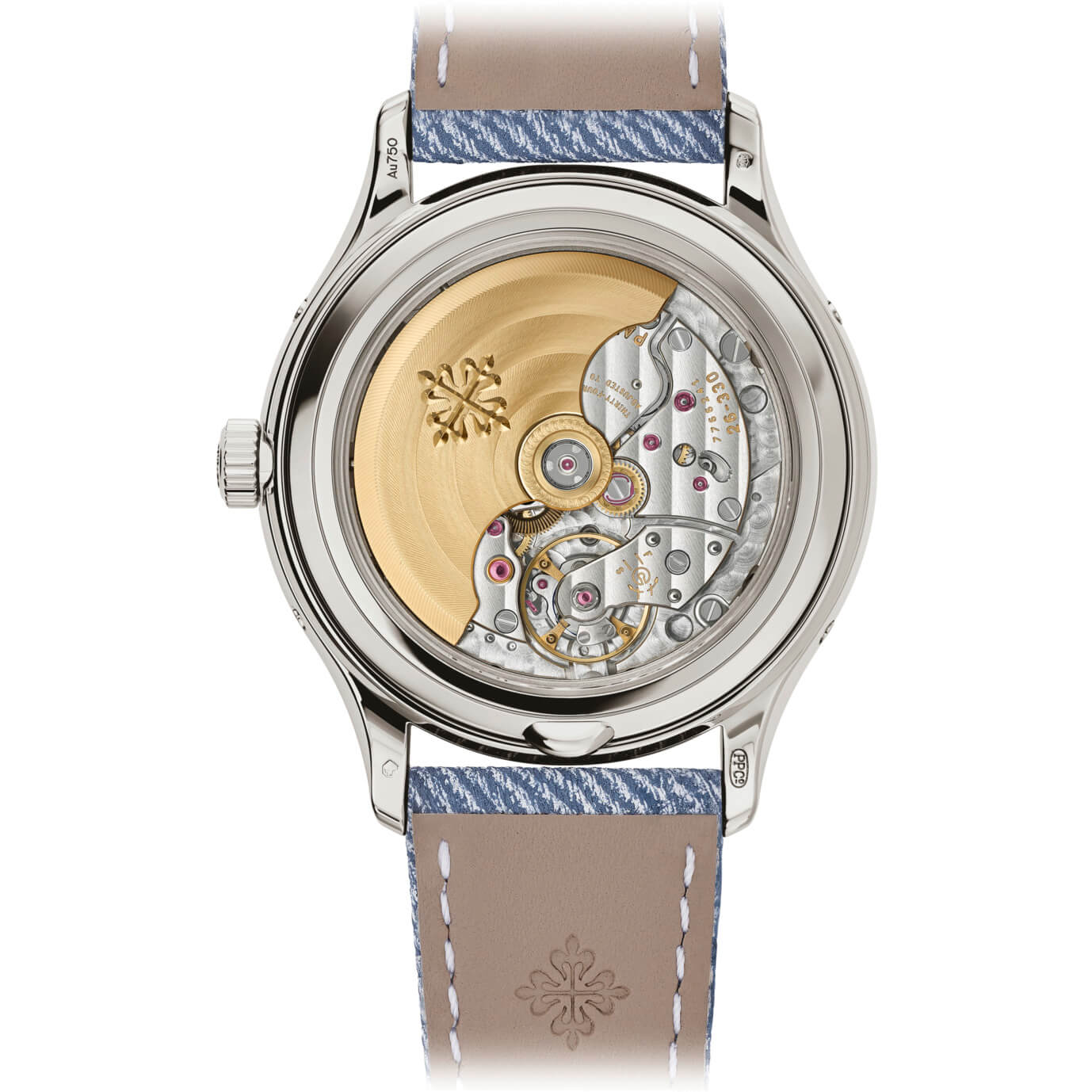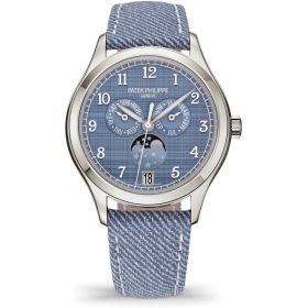 Diese moderne Annual Calendar verbindet funktionale Komplexität mit einer zeitgemäßen, textilinspirierten Ästhetik. Das vollständig polierte Weißgoldgehäuse mit 38 mm Durchmesser wirkt klassisch proportioniert und rahmt ein elegant zurückhaltendes Zifferblatt in Blau-Grau. Das Zifferblatt ist mit einer vertikalen und horizontalen Satinierung im „Shantung“-Stil versehen, die an edle Seidenstoffe erinnert und der Oberfläche eine subtile, lebendige Struktur verleiht. Applizierte Ziffern mit Leuchtbeschichtung sowie fein geformte Blattzeiger aus Weißgold sorgen für klare Ablesbarkeit und eine harmonische visuelle Balance. Im Inneren arbeitet das Automatikkaliber 26-330 S QA LU mit zentralem Rotor aus 21K Gold. Es integriert den Jahreskalender mit Datumsanzeige bei 6 Uhr sowie Wochentag und Monat in Zeigeranzeigen und ergänzt diese um eine Mondphasenanzeige und eine kleine Sekunde. Dank der Jahreskalender-Funktion ist lediglich eine Korrektur pro Jahr erforderlich. Das 32 mm große Werk mit einer Bauhöhe von nur 5,32 mm überzeugt durch seine effiziente Konstruktion, hohe Präzision und stabile Gangwerte bei 4 Hz Frequenz. Gyromax-Unruh und Spiromax-Spirale sorgen für zuverlässige Chronometrie im Alltag. Das Gehäuse aus Weißgold ist vollständig poliert und verzichtet bewusst auf eine Lünette mit Edelsteinbesatz, um die klare Formensprache zu betonen. Durch den Saphirglasboden lässt sich die fein ausgearbeitete Architektur des Uhrwerks detailliert betrachten. Abgerundet wird das Design durch ein blau-graues Kalbslederarmband mit Denim-Struktur und kontrastierenden weißen Nähten sowie eine klassische Dornschließe aus Weißgold. Diese Annual Calendar verbindet technische Raffinesse mit moderner Materialanmutung und einer ruhigen, ausgewogenen Eleganz.Produktspezifikationen