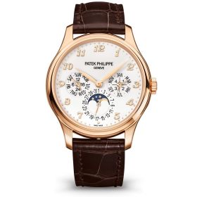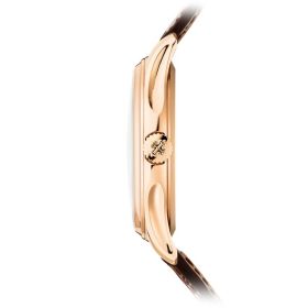 Roségold-Gehäuse, Zifferblatt elfenbeinfarben lackiert, Alligatorleder mit quadratischen Schuppen, dunkelbraun glänzend, Faltschließe, Saphirglasboden sowie auswechselbarer massiver Gehäuseboden, ewiger Kalender, Mondphasen, Schaltjahrzyklus und 24-Stunden- Anzeige mittels Zeigern, aufgesetzt Breguet-GoldziffernProduktspezifikationen