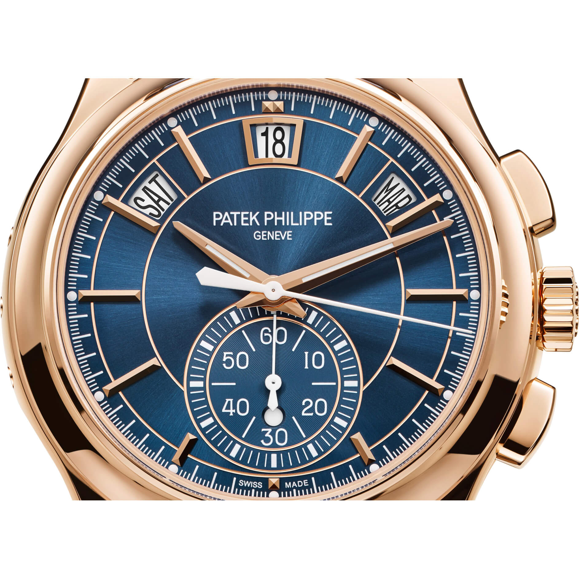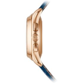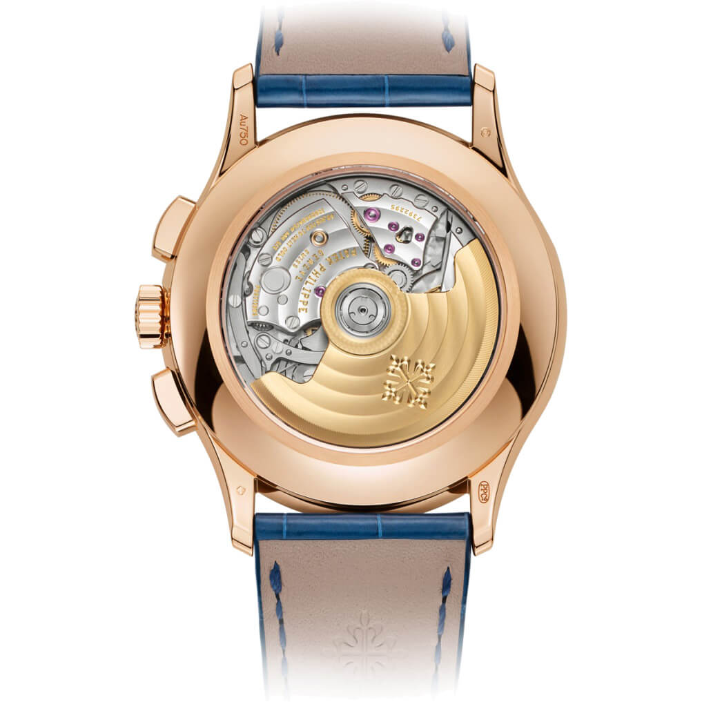 Der automatische Flyback-Chronograph mit Jahreskalender (Referenz 5905), eine Kombination zweier beliebter Komplikationen von Patek Philippe, ist in einer neuen Version aus Roségold mit blauem „Sonnenschliff“-Zifferblatt erhältlich. Die moderne und elegante Farbe bringt den zeitlosen Stil dieses Flaggschiff-Modells besonders schön zur Geltung. Der patentierte Jahreskalender berücksichtigt automatisch die unterschiedlich langen Monate mit 30 und 31 Tagen und muss nur einmal im Jahr, jeweils Ende Februar, korrigiert werden.
