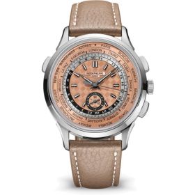 Den neuen Flyback-Chronographen mit automatischem Aufzug und Weltzeituhr erkennt man an seinem sportlichen Vintage-Stil. Er ist die allererste Stahlversion dieses Kultmodells. Das mit Roségold vergoldete Opalin-Zifferblatt mit „Karbon“-Motiv im Zentrum verleiht der Uhr einen modernen und dynamischen Touch. Mit einem exklusiven, patentierten Mechanismus, der alle Anzeigen durch einfaches Betätigen des Drückers bei 10 Uhr korrigiert, zeigt die Weltzeituhr gleichzeitig die Zeit aller 24 Zeitzonen an. Diese Uhr wird mit zwei Armbändern aus Kalbsleder geliefert – in genarbtem Taupe und in Beige mit Nubuck-Finish.Produktspezifikationen