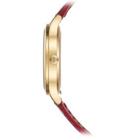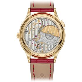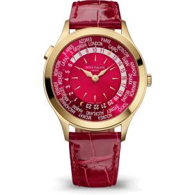 Diese ausdrucksstarke World Time vereint ikonische Reiseuhrmacherei mit einer besonders lebendigen Farbgestaltung. Das polierte Gelbgoldgehäuse mit 36 mm Durchmesser umrahmt ein intensiv karminrotes Zifferblatt, das klassische Komplexität mit einer mutigen, dekorativen Ästhetik verbindet. Im Zentrum steht die legendäre World-Time-Funktion, die auf dem von Louis Cottier in den 1930er-Jahren entwickelten Prinzip basiert und alle 24 Zeitzonen gleichzeitig anzeigt. Die lokale Zeit kann über einen Drücker bei 10 Uhr bequem eingestellt werden, wobei dank eines patentierten Mechanismus aus dem Jahr 1999 alle Anzeigen synchron angepasst werden. Das Zifferblatt zeigt ein fein handguillochiertes Mittelteil im „Old-Basket-Weave“-Muster, umgeben von einem lackierten karminroten Stadtkranz mit weiß beschrifteten Metropolen. Applizierte Stundenmarker aus Gelbgold sowie facettierte Zeiger in charakteristischer Linsenform sorgen für elegante Ablesbarkeit und klare Struktur. Im Inneren arbeitet das ultraflache Automatikkaliber 240 HU mit dezentralem Minirotor aus 22K Gold. Es ermöglicht die gleichzeitige Anzeige aller Zeitzonen inklusive 24-Stunden- und Tag-/Nacht-Indikationen und überzeugt durch seine außergewöhnliche Effizienz bei minimaler Bauhöhe von nur 3,88 mm. Das 30 mm große Werk ist technisch hochentwickelt und auf maximale Präzision sowie Energieeffizienz ausgelegt, mit einer Gangreserve von bis zu 48 Stunden. Die Gyromax-Unruh und die Spiromax-Spirale gewährleisten dabei stabile Gangwerte bei kompakter Bauweise. Das Gehäuse aus Gelbgold ist klassisch poliert und wird durch einen Saphirglasboden ergänzt. Abgerundet wird das Design durch ein glänzendes karminrotes Alligatorlederarmband mit passender Dornschließe aus Gelbgold. Diese World Time verbindet höchste Reistechnik, traditionelle Uhrmacherkunst und eine besonders expressive Farbgestaltung zu einem charakterstarken Gesamtbild.Produktspezifikationen