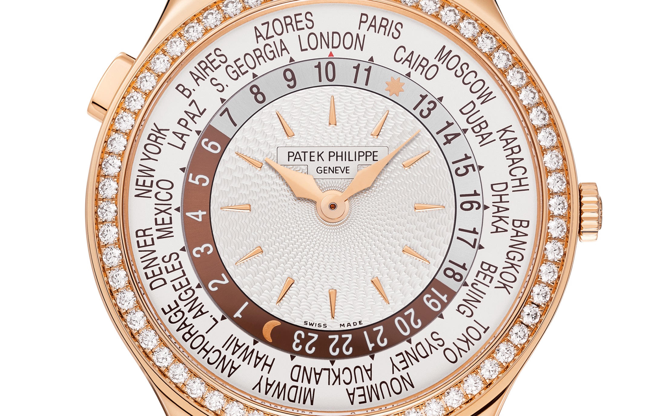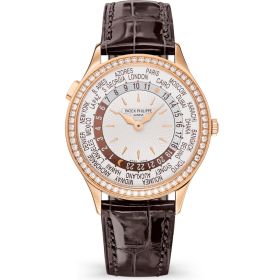 Patek Philippe Komplizierte Uhren Kollektion. Herrenuhr aus Roségold/Saphirglasboden/Diamanten. Uhrwerk mit Automatikaufzug Kaliber 240 HU, Funktion: Weltzeituhr (24-Stunden- und Tag-/Nachtanzeige für die 24 Zeitzonen), Stunden, Minuten. Durchmesser 36 mm. Besondere Merkmale des Zeitmessers: Lünette besetzt mit 62 Diamanten(ca. 0,82 ct.), Dornschließe besetzt mit 27 Diamanten (ca. 0,21 ct.). Armband aus Alligatorleder mit Dornschließe.Produktspezifikationen
