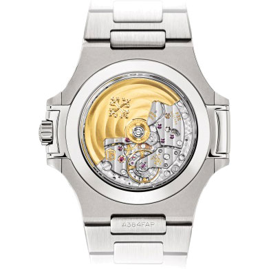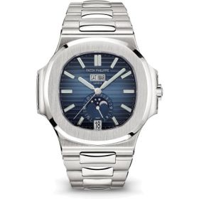 Ein neues Ziffernblatt für die Nautilus aus Edelstahl mit Jahreskalender und Mondphasenanzeige. Inspiriert von der Zifferblattfarbe des Nautilus-Originalmodells von 1976, zeigt sich das Zifferblatt mit einer horizontalen Reliefprägung und einem subtilen Schwarz-Verlauf. Die sportlich-eleganten Fassade verbirgt das Kaliber 324 S QA LU 24H/303 (347 Einzelteile) mit automatischem Aufzug und Saphirglasboden. Die Anzahl Einzelteile: 347. Die Aufzugmasse: Zentral-rotor aus 21 K Gold. Die Frequenz: 28.800 Halbschwingungen/Stunde (4 Hz). Die Gangreserve: min. 35 Stunden - max. 45 Stunden. Das Zifferblatt: blau, schwarz-Verlauf, aufgesetzte Goldindexe mit Leuchtbeschichtung; Stabzeiger aus Weißgold mit Leuchtbeschichtung. Das GEHÄUSE: Stahl, Durchmesser (10-4 Uhr): 40,5 mm, Höhe: 11,3 mm, Wasserdicht bis 12 bar, Schraubkrone, Saphirglasboden. Das Armband: Stahl, Nautilus Faltschließe
