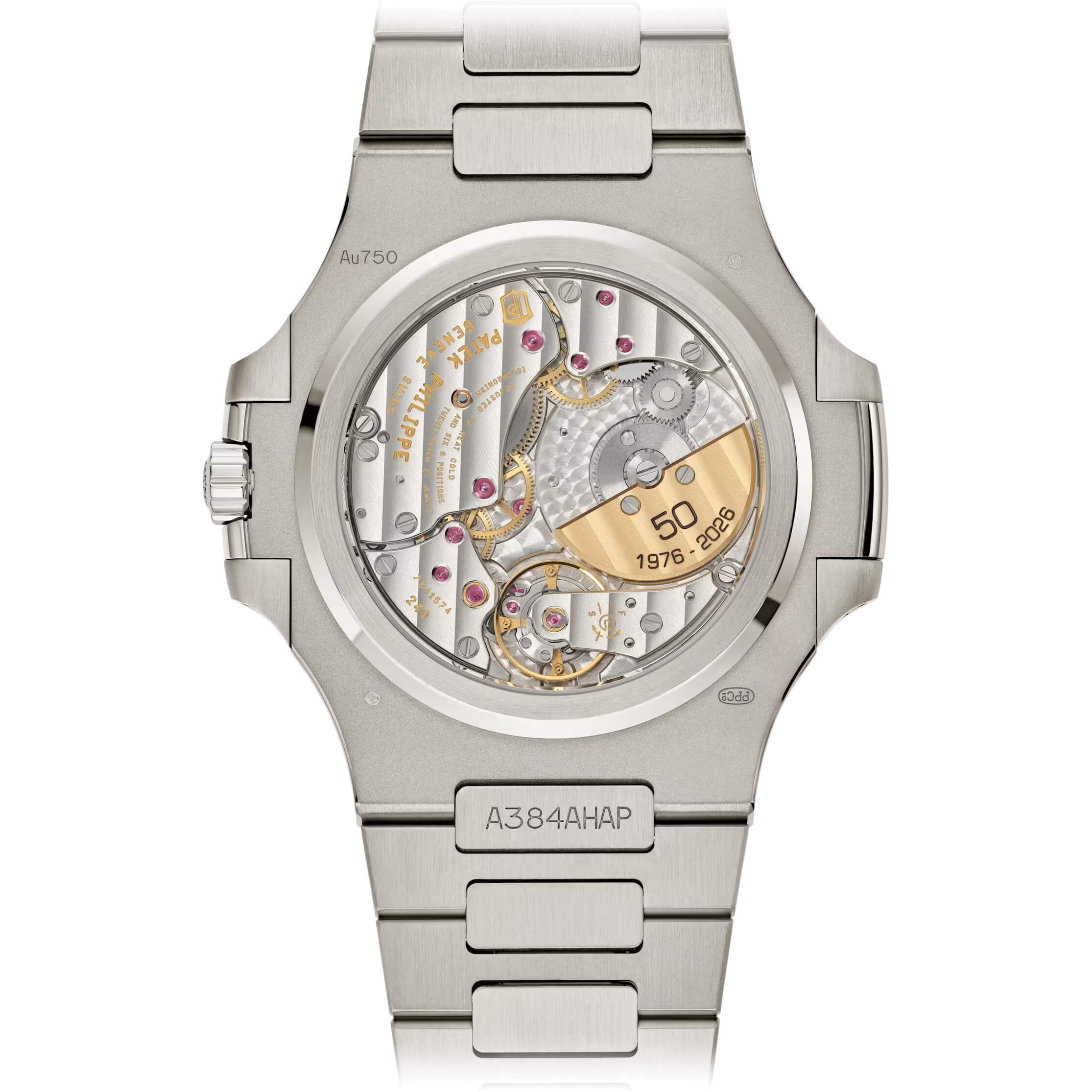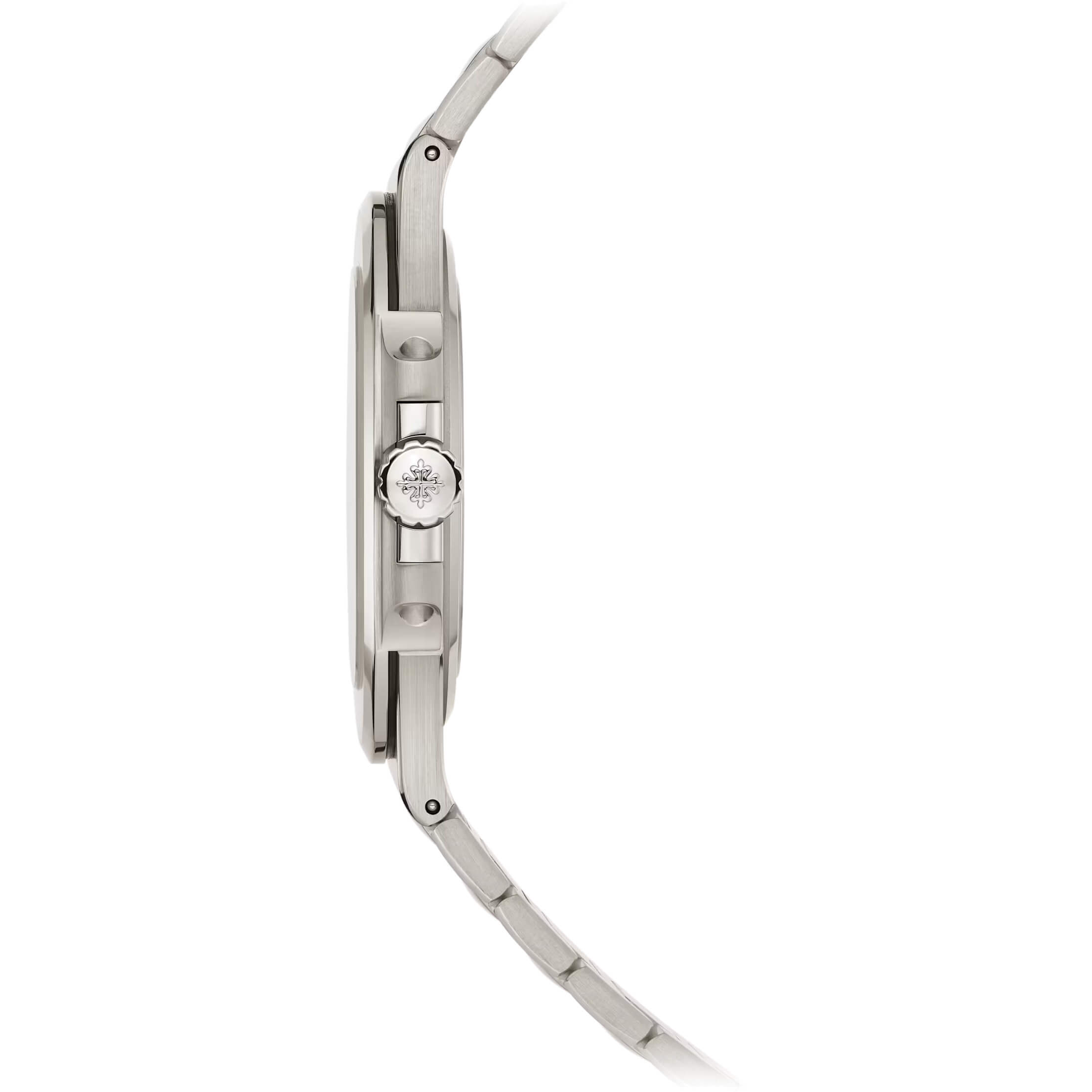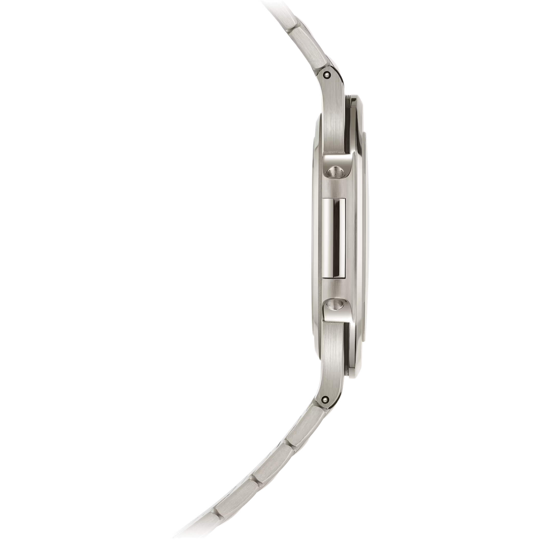 Diese besondere Jubiläums-Nautilus feiert 50 Jahre der ikonischen Kollektion und interpretiert ihr charakteristisches Design in einer edlen Ausführung aus Weißgold neu. Das zweigeteilte Gehäuse mit 41 mm Durchmesser bewahrt die markante Nautilus-Silhouette und verbindet sportliche Präsenz mit eleganter Zurückhaltung. Die Kombination aus polierten und satinierten Oberflächen verleiht Gehäuse, Lünette und integriertem Armband eine lebendige Materialtiefe. Das harmonische Zusammenspiel der Finissierungen betont die fließende Linienführung des Designs und unterstreicht den luxuriösen Charakter dieser Sonderedition. Das sonnengeschliffene blaue Zifferblatt mit horizontal geprägter Struktur greift das ikonische Nautilus-Motiv auf und erzeugt eine subtile, elegante Tiefenwirkung. Applizierte Stabindexe aus Weißgold sowie abgerundete Zeiger mit Leuchtbeschichtung sorgen für klare Ablesbarkeit und eine ausgewogene, zeitlose Ästhetik. Im Inneren arbeitet das ultraflache Automatikkaliber 240 mit dezentralem Minirotor aus 22K Gold, der mit der Gravur „50 1976–2026“ veredelt ist. Mit nur 2,53 mm Bauhöhe steht das Werk für außergewöhnliche Präzision bei minimalem Volumen und bietet eine Gangreserve von bis zu 48 Stunden. Das Kaliber überzeugt durch seine hochentwickelte Konstruktion mit Gyromax-Unruh und Spiromax-Spirale, die eine stabile und zuverlässige Ganggenauigkeit gewährleisten. Durch den Saphirglasboden lässt sich die fein dekorierte Mechanik in ihrer ganzen Tiefe betrachten. Das integrierte Armband aus Weißgold ist mit einer patentierten Faltschließe sowie einem Verriegelungssystem für die Längenverstellung ausgestattet und sorgt für hohen Tragekomfort und sichere Passform. Diese auf 2.000 Exemplare limitierte Nautilus verbindet technische Exzellenz, ikonisches Design und höchste Materialqualität zu einer würdigen Jubiläumsedition.Produktspezifikationen