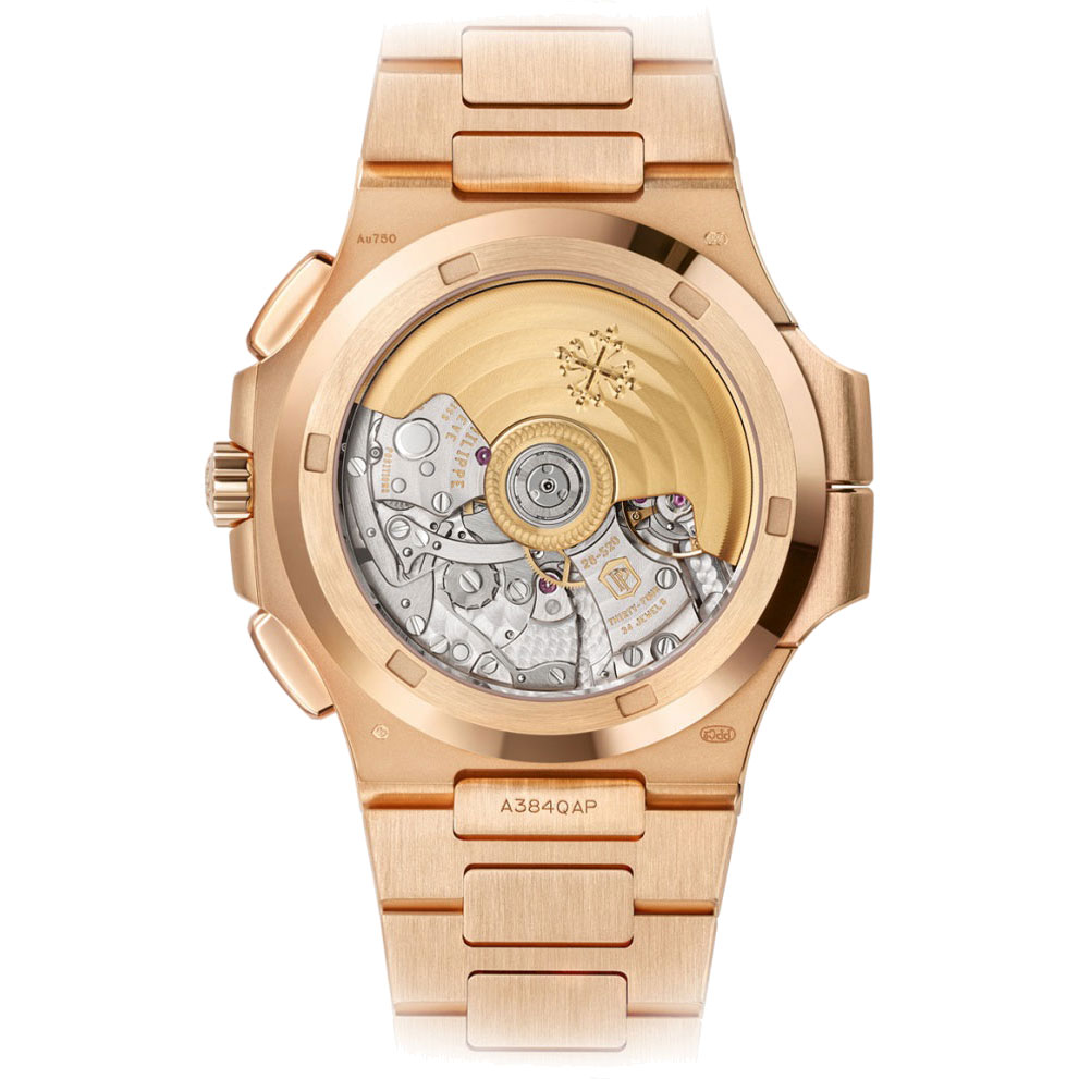 Patek Philippe bietet die Nautilus Travel Time Chronograph Referenz 5990/1 jetzt in einer großzügigeren Ausführung aus Roségold an. Dieser Goldton steht in reizvollem Gegensatz zum blauen Zifferblatt mit „Sonnenschliff‟, horizontaler Reliefprägung und aufgesetzten Indexen. Die Stabzeiger mit Leuchtbeschichtung sind aus Roségold gefertigt. Diese Innovation verbindet drei sehr beliebte Komplikationen: einen Flyback-Chronographen mit automatischem Aufzug, eine besonders einfach anwendbare Travel Time Funktion (zwei Zeitzonen) sowie eine Datumsanzeige mittels Zeiger, die mit der Ortszeit gekoppelt ist.Produktspezifikationen