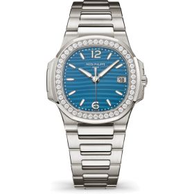 Diese elegante Neuinterpretation der Nautilus für Damen kombiniert zeitlose Ästhetik mit moderner Raffinesse. Das 32 mm große Gehäuse mit charakteristischer Bullaugen-Form besteht aus Weißgold und wird von einem integrierten Armband aus demselben Edelmetall ergänzt. Das azurblaue Zifferblatt mit dem typischen Wellenrelief der Kollektion verleiht der Uhr eine dynamische Tiefe. Die Lünette wird von 46 funkelnden Diamanten im Brillantschliff (insgesamt 0,8 ct) geziert, die dem Modell eine luxuriöse Note verleihen. Fein satinierte und polierte Oberflächen betonen das Zusammenspiel von Licht und Struktur. Das Weißgoldarmband ist mit einem innovativen Verlängerungssystem mit Sicherheitsriegel ausgestattet und schließt mit einer patentierten Faltschließe von Patek Philippe, die durch vier unabhängige Rasten für optimalen Tragekomfort sorgt.Produktspezifikationen