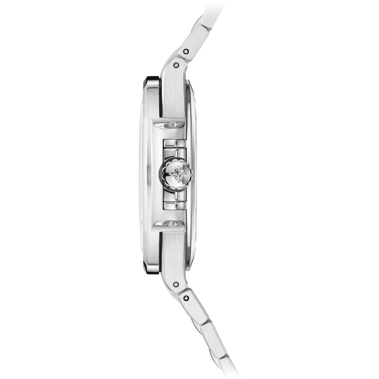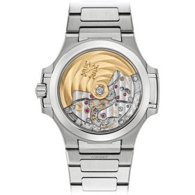 Edelstahlgehäuse, Zifferblatt opalen silberfarben, aufgesetzte Goldziffern und -indexe, Stahlarmban mit Nautilus-Faltschließe, SaphirglasbodenProduktspezifikationen