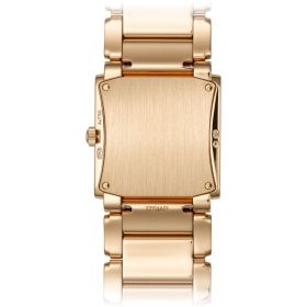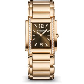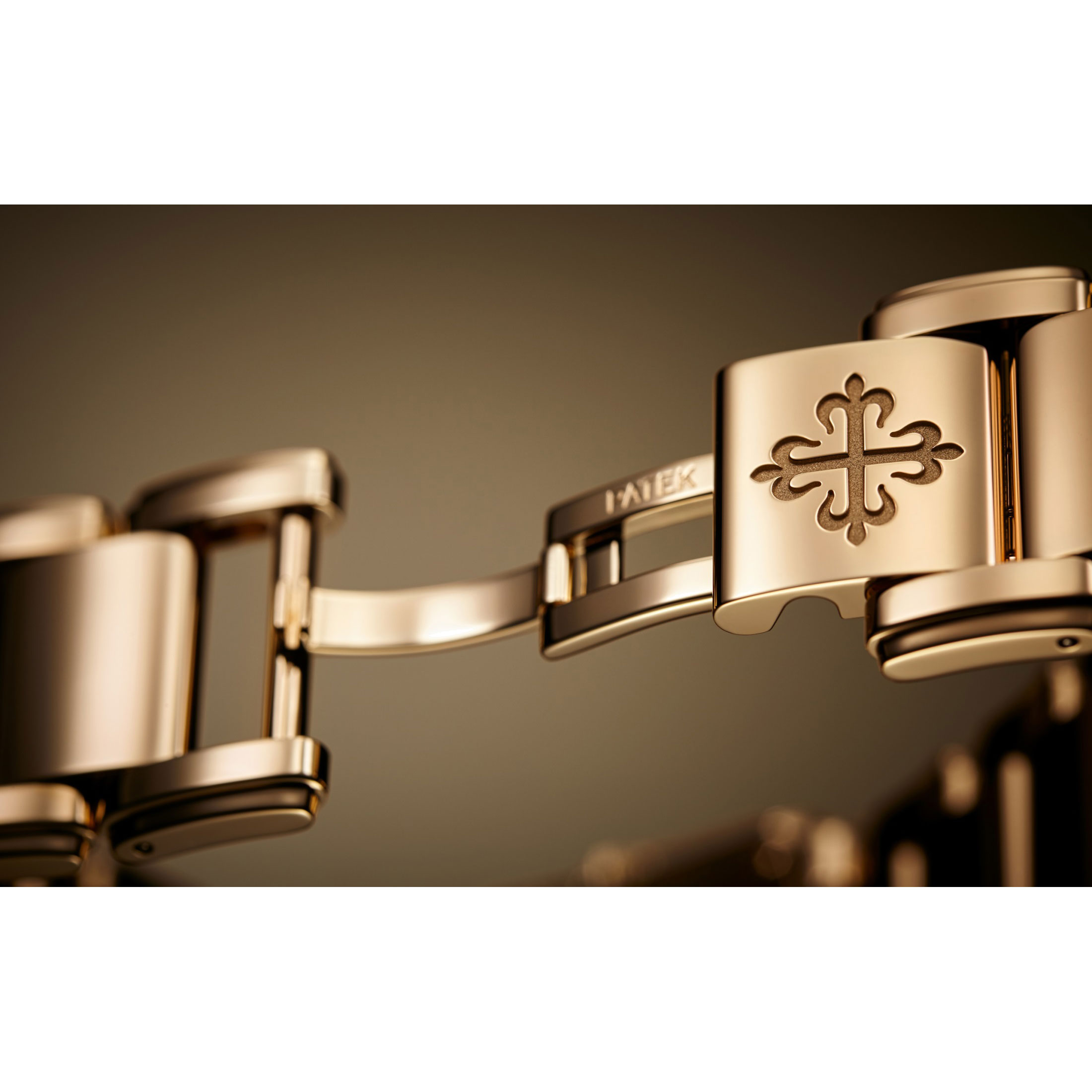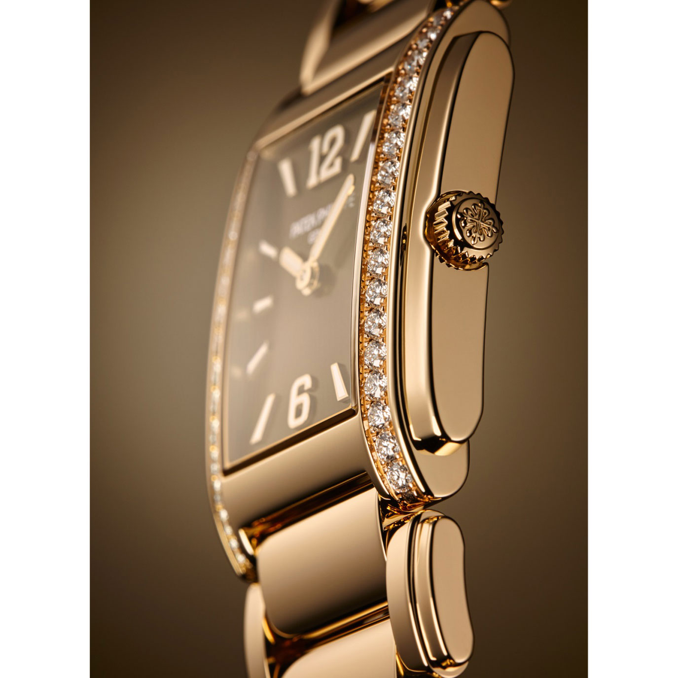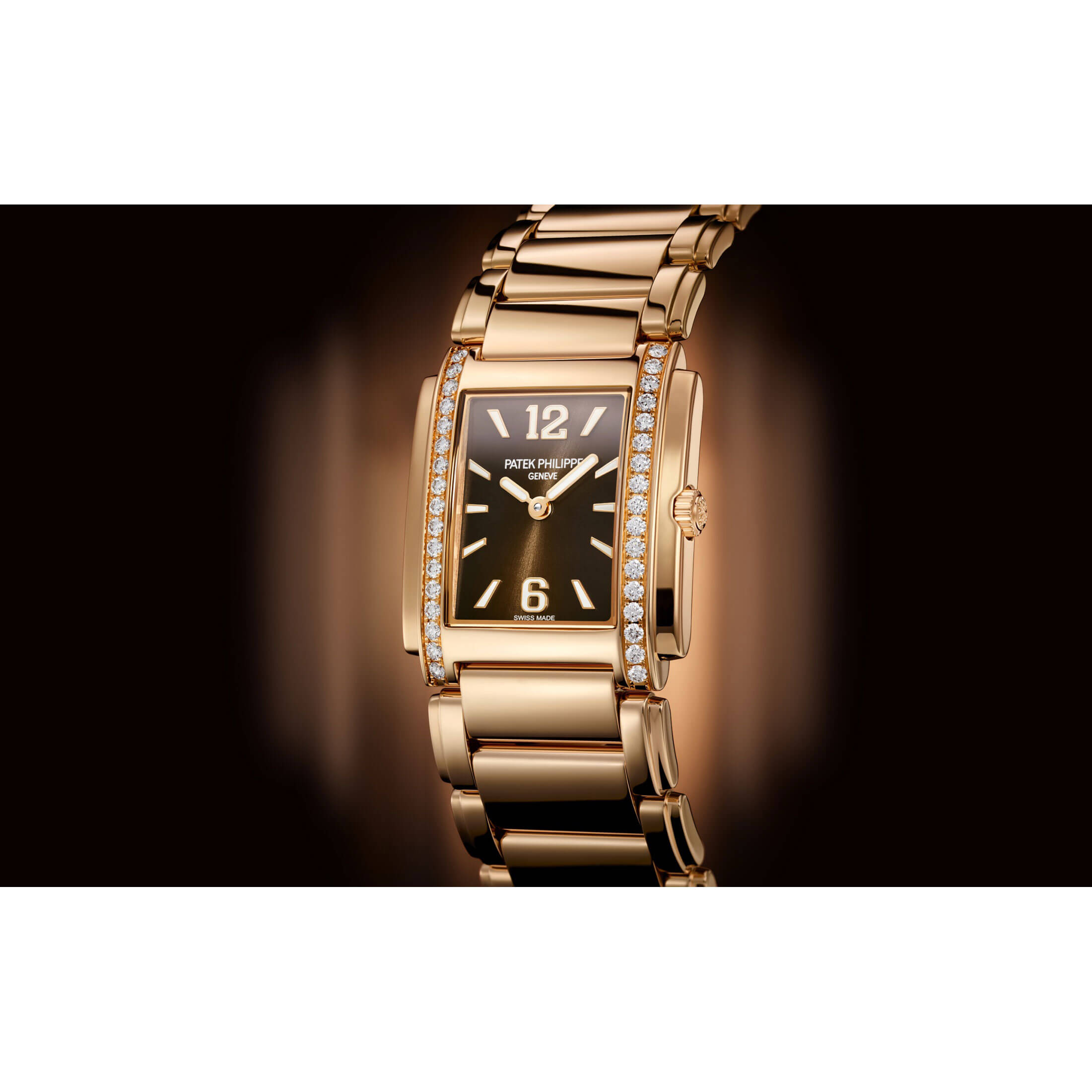Patek Philippe präsentiert ihre Twenty-4 Quarzuhr, die Verkörperung zeitloser femininer Eleganz, in einer neuen Roségoldvariante mit schokobraunem Sonnenschliff-Zifferblatt. Die unverwechselbare Form des rechteckigen Gehäuses wird durch zwei Diamantreihen betont. Das übersichtliche Zifferblatt schmücken arabische Ziffer-Appliken, Trapez-Indexe und Leuchtzeiger aus Roségold. Die Krone ist mit dem Calatrava Kreuz verziert, dem Markenzeichen von Patek Philippe Das Armband ist von Hand poliert und schmiegt sich perfekt an das Handgelenk.Produktspezifikationen