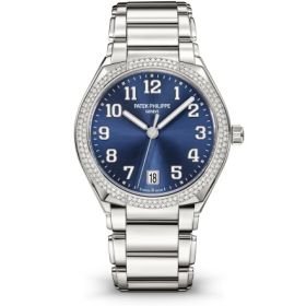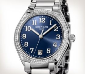 Patek Philippe lanciert mit der neuen Twenty~4 Automatik eine neue mechanische Damenuhr. Die Edelstahl-Ausführung hat eine diamantbesetzte Lünette (160 Diamanten mit ca. 0,77 ct.) und ein blaues Zifferblatt mit Sonnenschliff. Unter dem Saphirglasboden tickt das Uhrwerk 324 S C.Produktspezifikationen