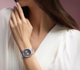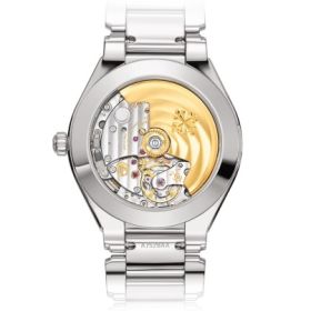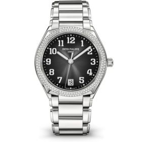 Patek Philippe lanciert mit der neuen Twenty~4 Automatik eine neue mechanische Damenuhr. Die Edelstahl-Ausführung hat eine diamantbesetzte Lünette (160 Diamanten mit ca. 0,77 ct.) und ein schiefergraues Zifferblatt mit Sonnenschliff. Unter dem Saphirglasboden tickt das Uhrwerk 324 S C.Produktspezifikationen