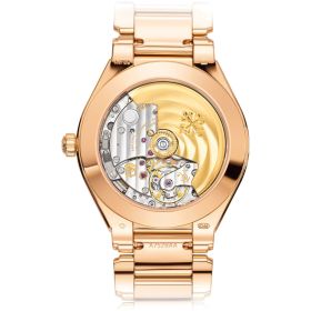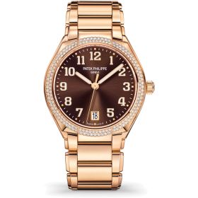 Patek Philippe lanciert mit der neuen Twenty~4 Automatik eine neue mechanische Damenuhr. Die Roségold-Ausführung hat eine diamantbesetzte Lünette (160 Diamanten mit ca. 0,77 ct.) und ein braunes Zifferblatt mit Sonnenschliff. Unter dem Saphirglasboden tickt das Uhrwerk 324 S C.Produktspezifikationen