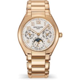 Die Kollektion Twenty~4 erweitert ihr Spektrum erstmals um eine Komplikation – und das mit einem der bedeutendsten Uhrmachermeisterwerke von Patek Philippe: dem ewigen Kalender. Ausgestattet mit dem extraflachen Automatikkaliber 240 Q, bleibt das unbesetzte Gehäuse schlank und elegant – ganz im Stil der Linie. Die Kalenderfunktionen werden klassisch über Zeiger auf drei Hilfszifferblättern angezeigt, ergänzt durch eine fein integrierte Mondphasenanzeige – ein Paradebeispiel für die harmonische Gestaltung der ewigen Kalender des Hauses. Das silbergraue Zifferblatt ist mit einem doppelt gearbeiteten Satinfinish in vertikaler und horizontaler Ausrichtung veredelt, das an die feine Struktur von Shantung-Seide erinnert – ein subtiler Ausdruck von Raffinesse und Stil.Produktspezifikationen