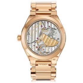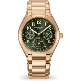 Als erste Komplikation der Twenty~4 Kollektion und zugleich die erste runde Version ohne Diamantbesatz besticht dieser Ewige Kalender aus Roségold mit einem Zifferblatt in elegantem Olivgrün mit feinem Sonnenschliff – eine moderne, zugleich zurückhaltende Farbwahl. Im Inneren des vollständig polierten Gehäuses arbeitet das extraflache Automatikkaliber 240 Q, das nicht nur für eine harmonisch schlanke Silhouette sorgt, sondern auch durch technische Raffinesse überzeugt: Der Ewige Kalender zeigt zuverlässig Wochentag, Datum und Monat an – inklusive Schaltjahreskorrektur. Komplettiert wird die Uhr durch ein massives Roségoldarmband mit einer patentierten Faltschließe, deren vier unabhängige Sicherheitsrasten für höchsten Tragekomfort und sicheren Halt sorgen.Produktspezifikationen