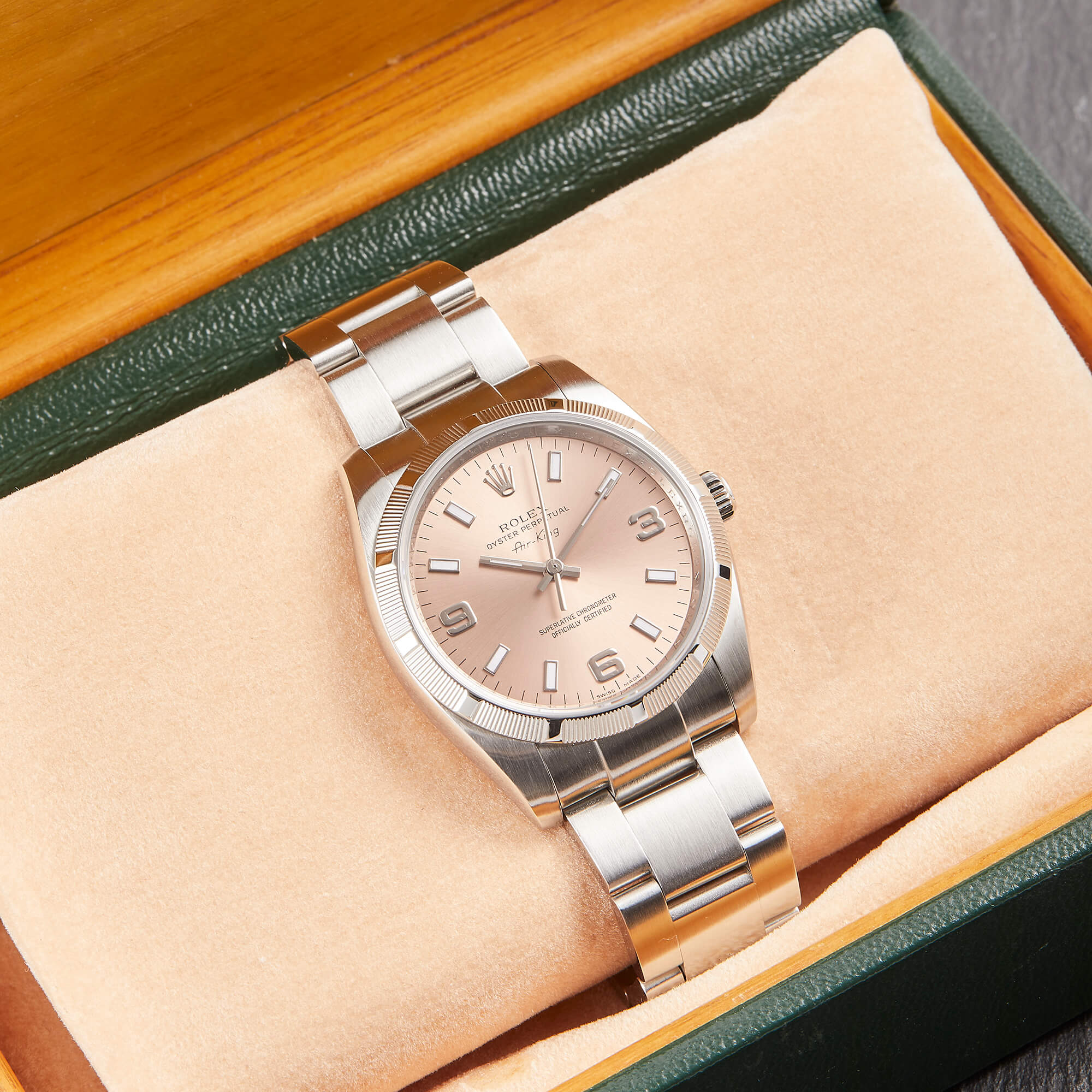Die Rolex Air-King Referenz 114210 überzeugt mit einem eleganten rosafarbenen Sonnenschliff-Zifferblatt und klassischer Rolex-Ästhetik. Dieses Exemplar kommt im vollständigen Fullset inklusive Box und Papieren und wurde frisch revisioniert – technisch wie optisch in hervorragendem Zustand. Eine stilvolle und seltene Variante der beliebten Air-King.- Durchmesser