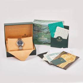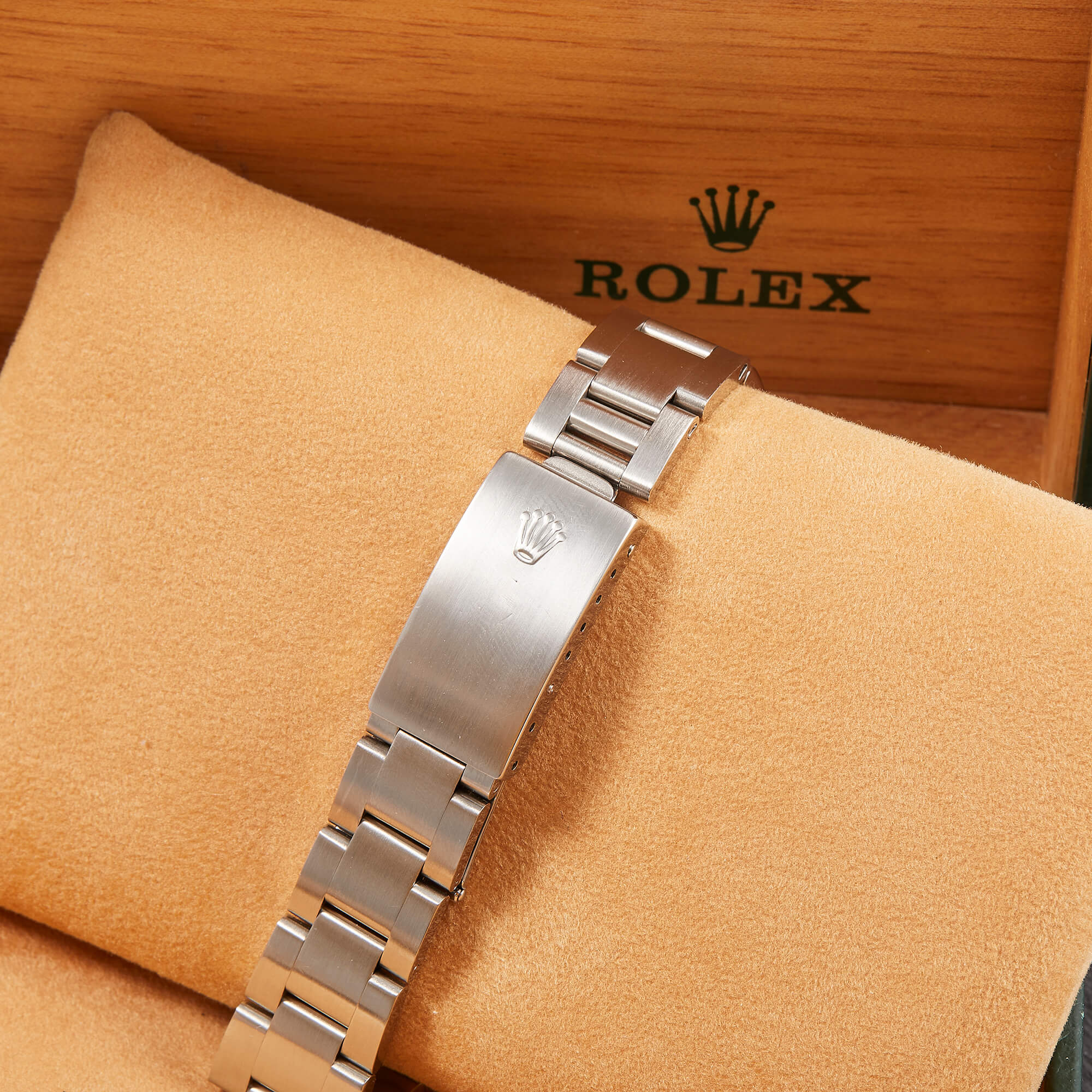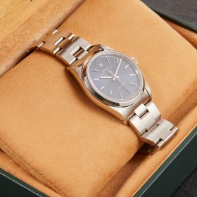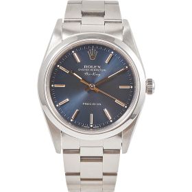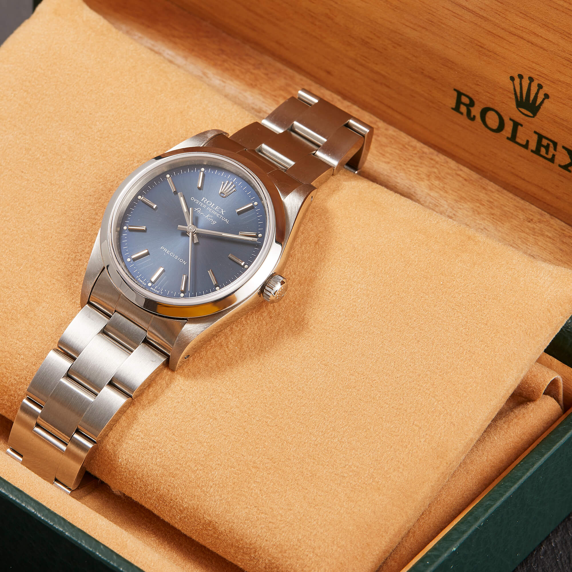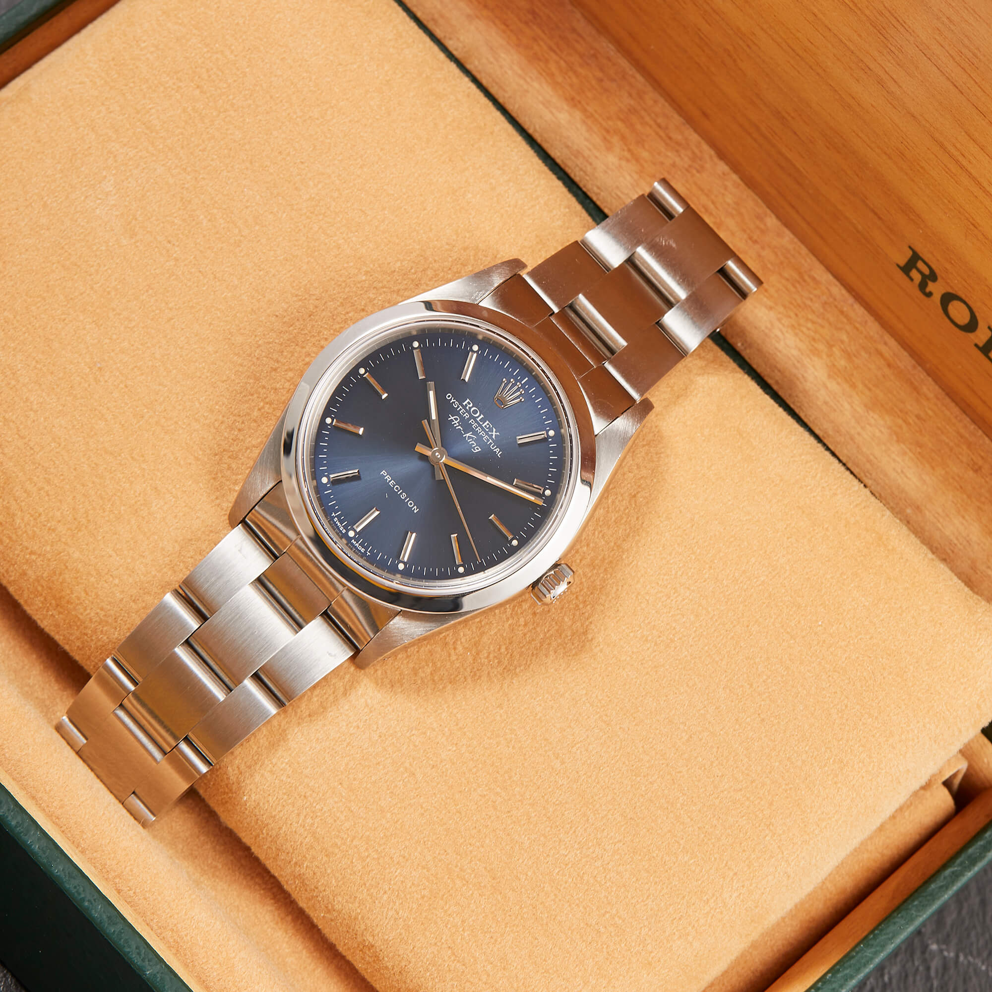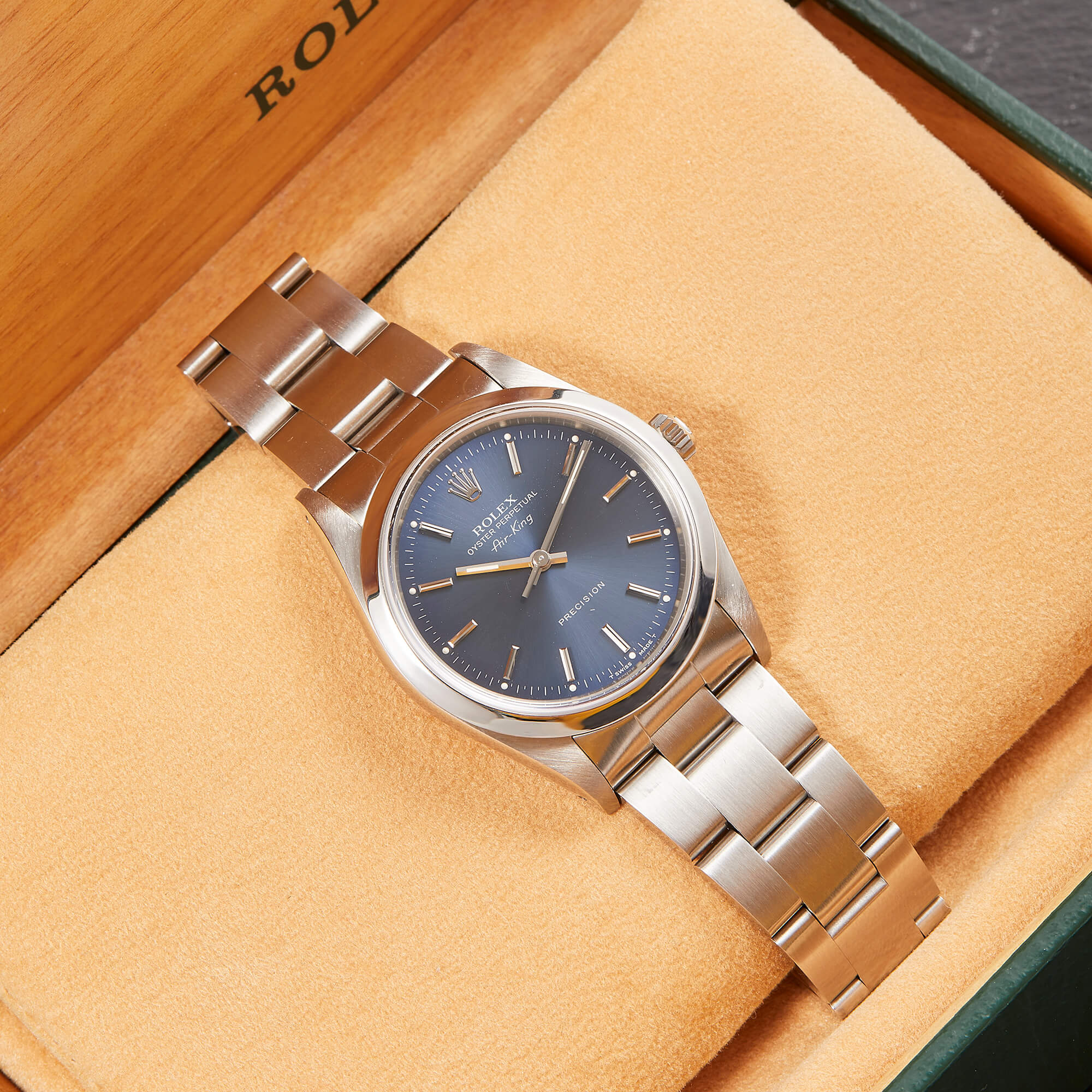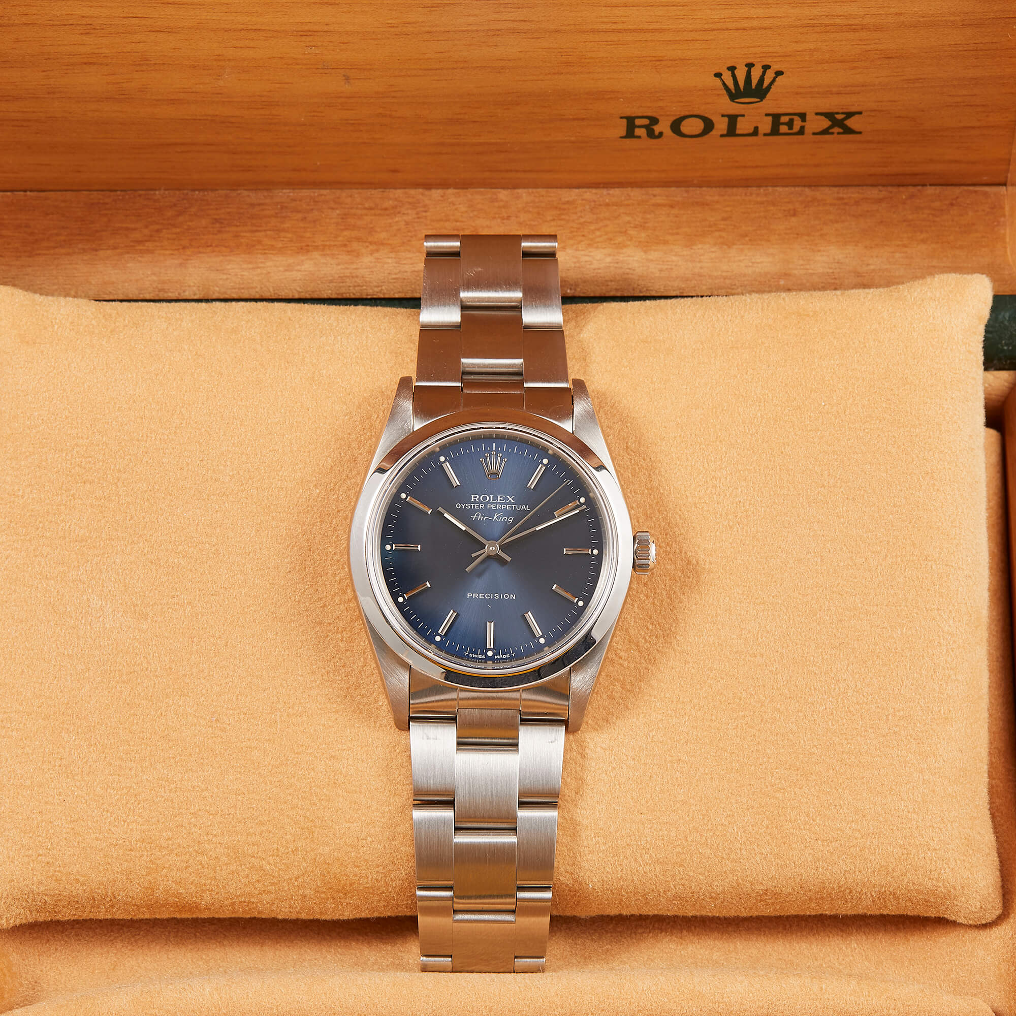 Die Rolex Air-King Referenz 14000 besticht durch ihr schlichtes, robustes Design mit einem 34 mm Edelstahlgehäuse und einem eleganten blauen Zifferblatt. Das Modell überzeugt mit klarer Ablesbarkeit und klassischem Look, ideal für den Alltag. Die Uhr befindet sich im Fullset.- Durchmesser