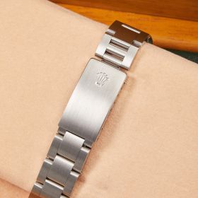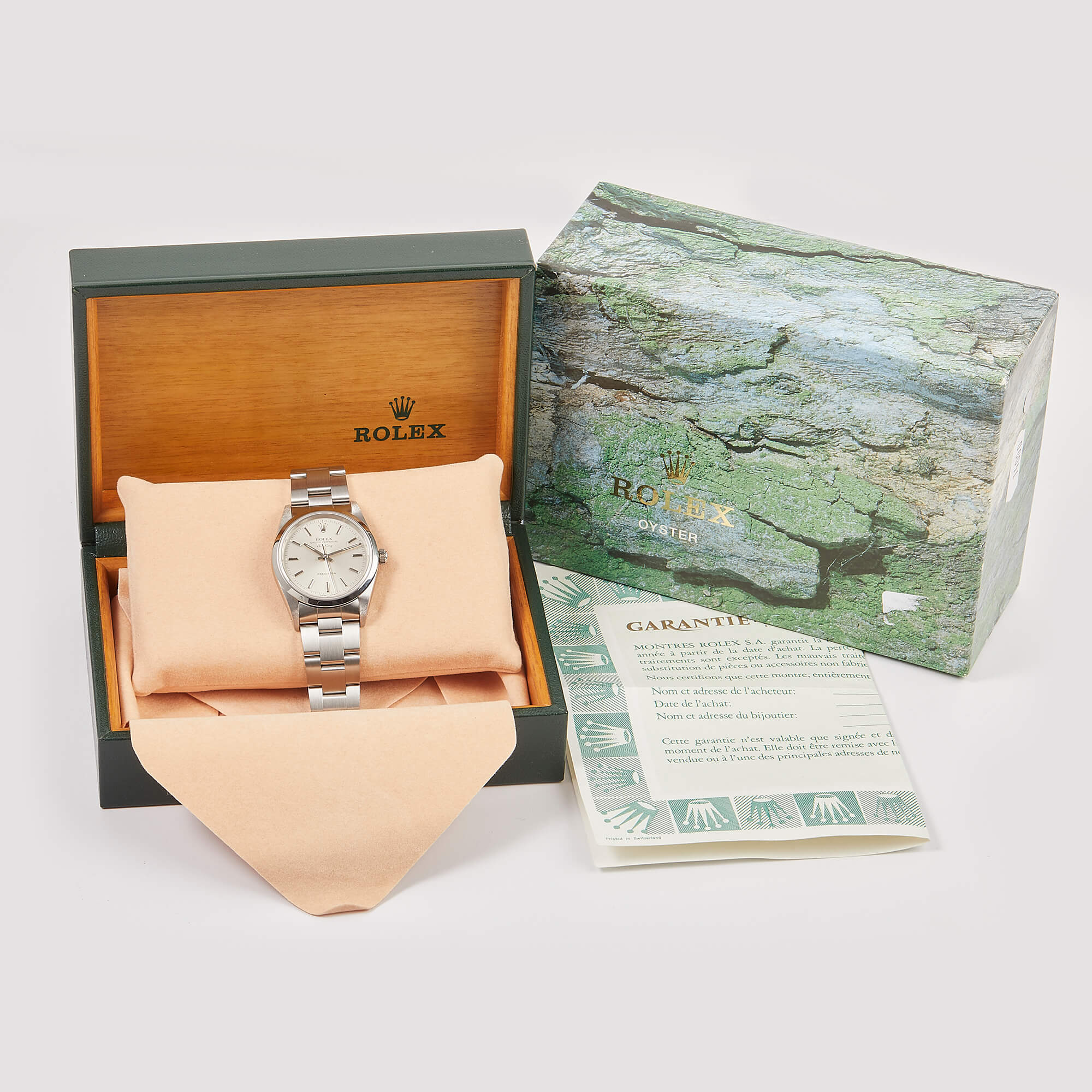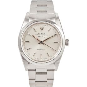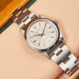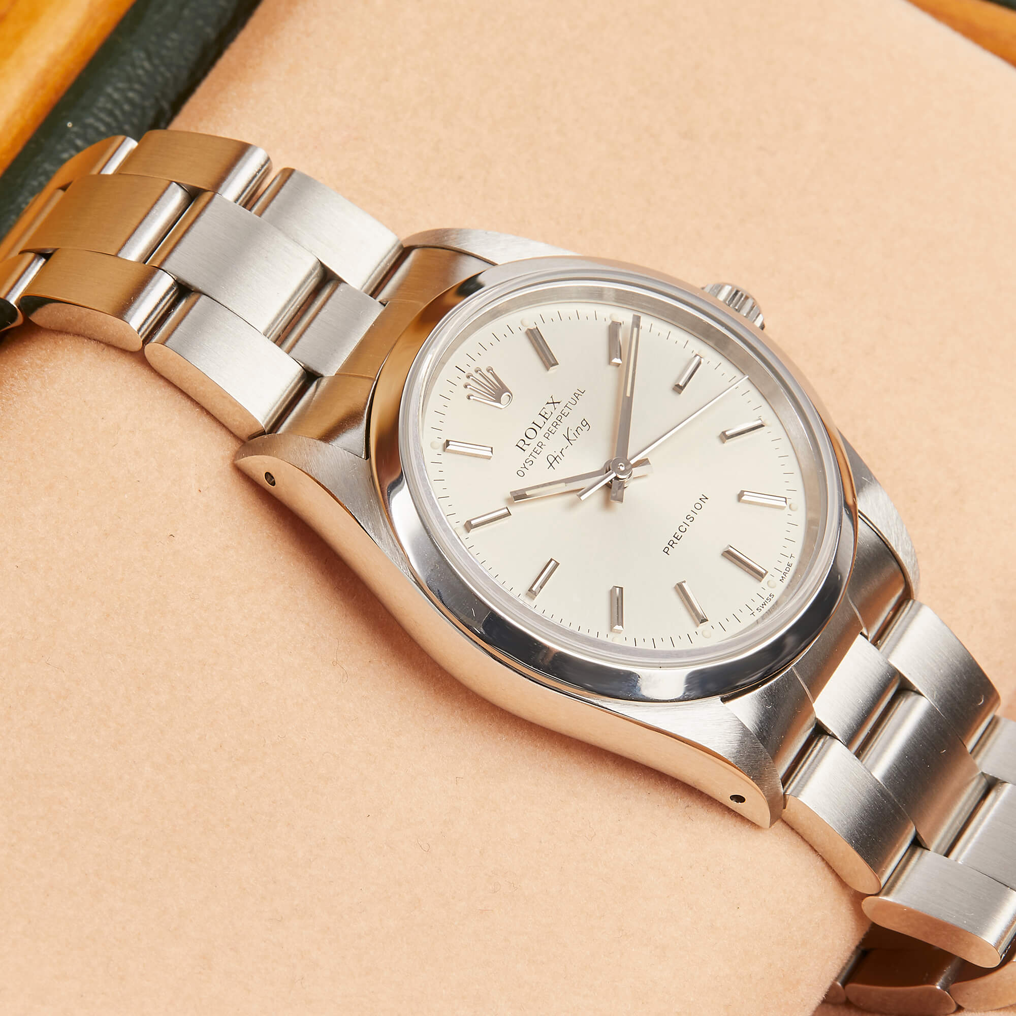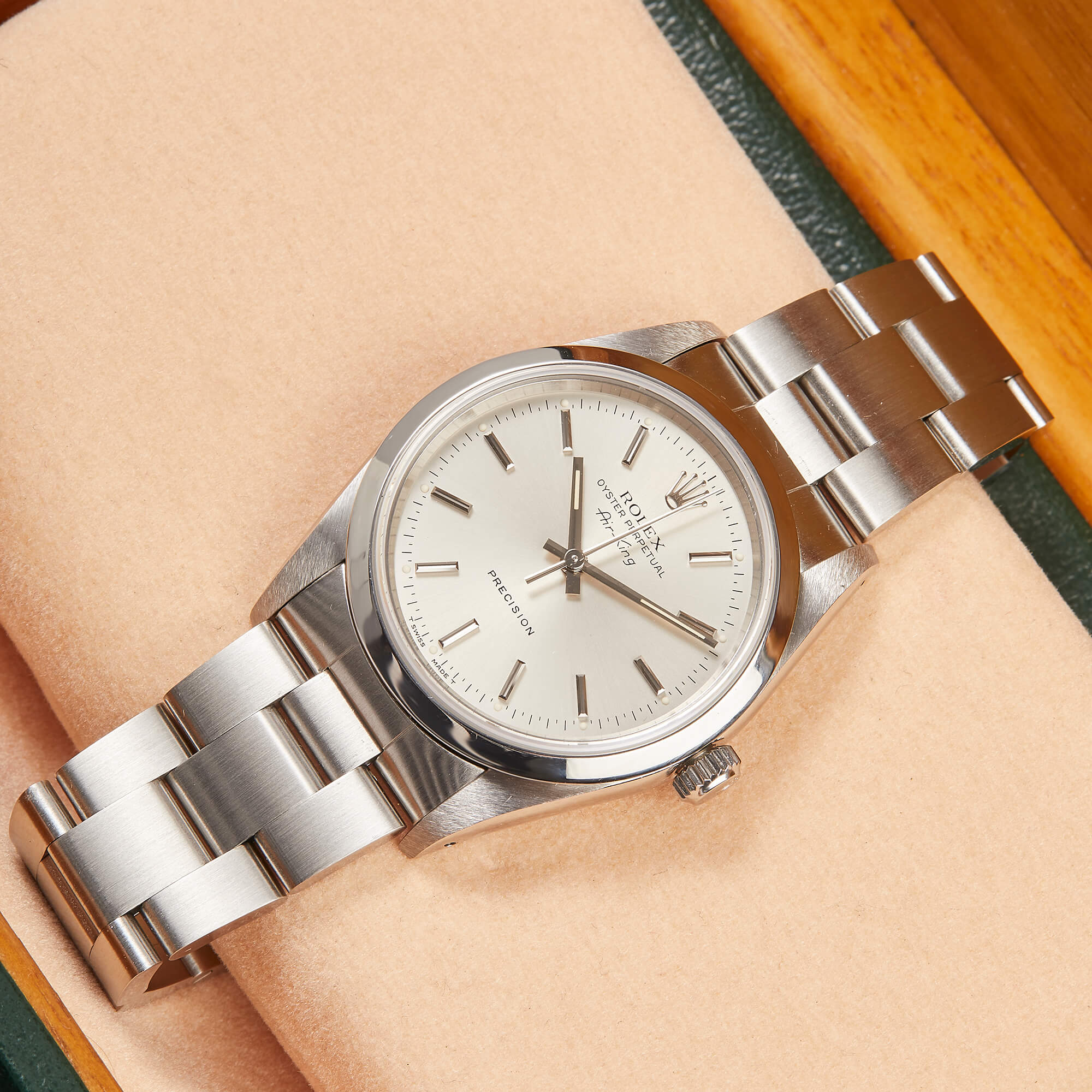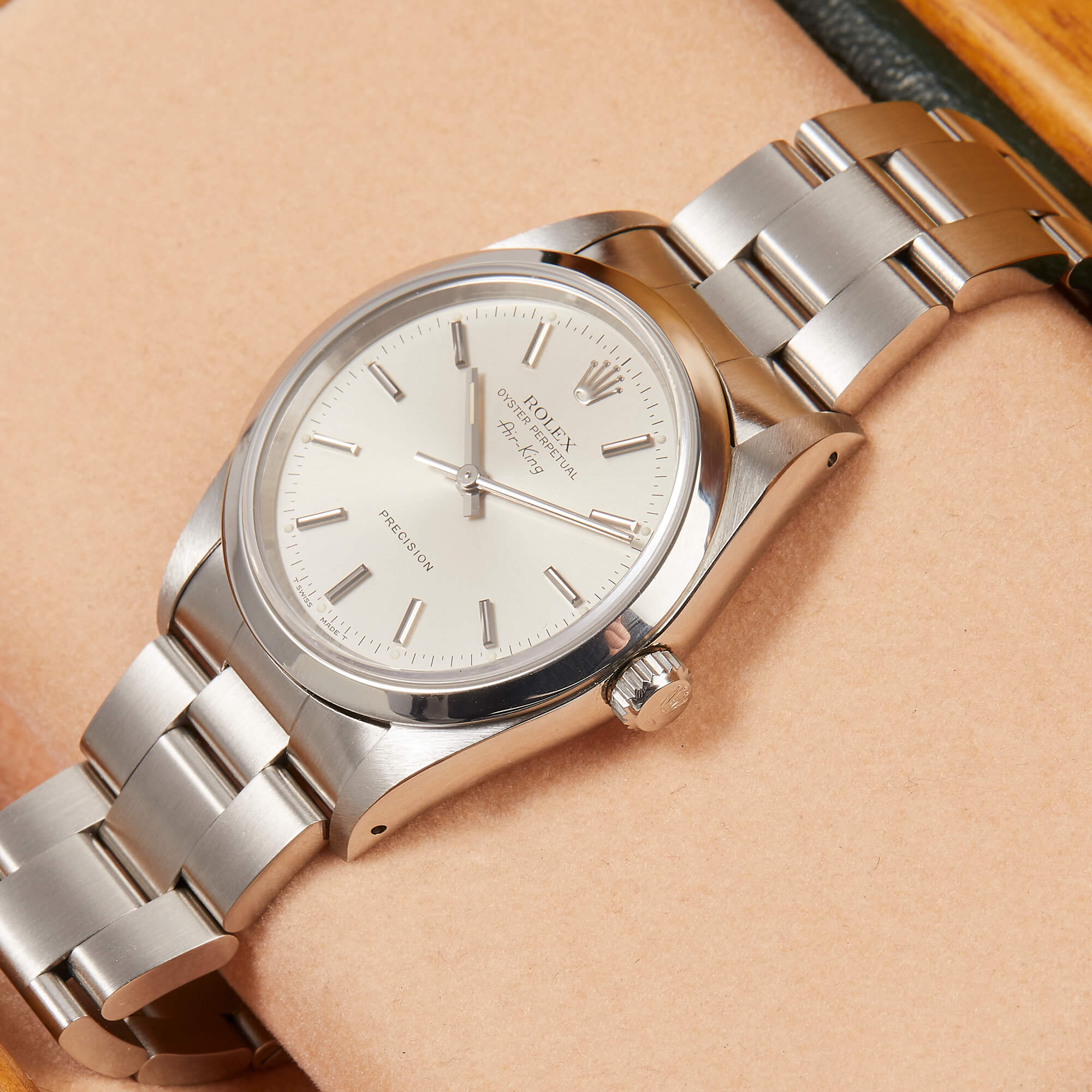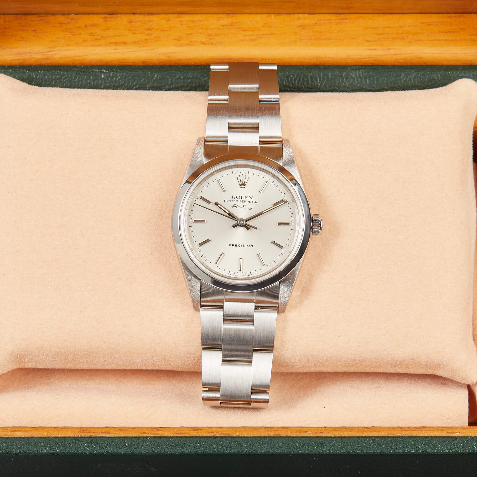 Die Rolex Air-King Referenz 14000 besticht durch ihr schlichtes, robustes Design mit einem 34 mm Edelstahlgehäuse und einem eleganten silbernen Zifferblatt. Das Modell überzeugt mit klarer Ablesbarkeit und klassischem Look, ideal für den Alltag. Die Uhr befindet sich im Fullset.- Durchmesser