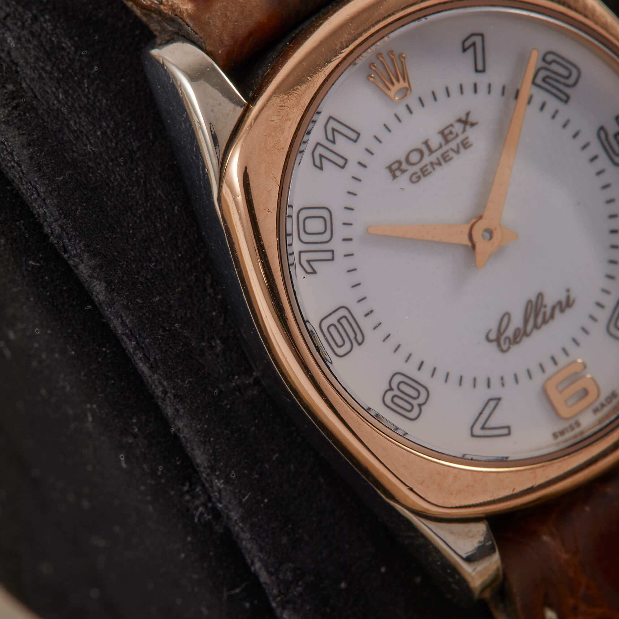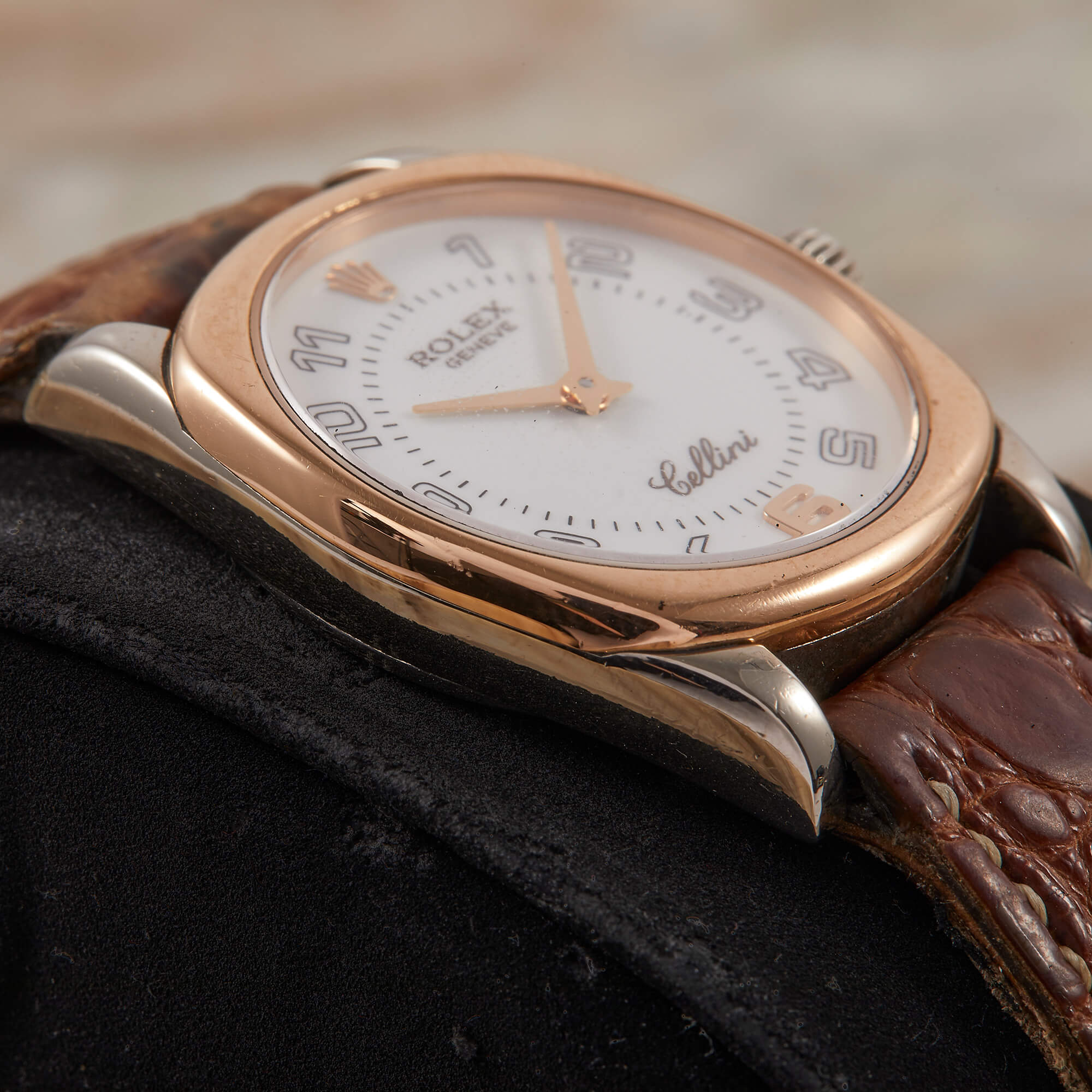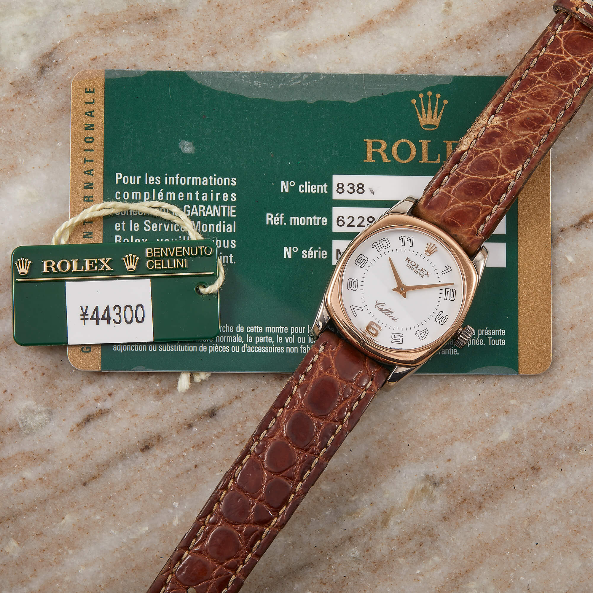 Elegante Rolex Cellini Danaos in der Referenz 6229 mit Gehäuse in Stahl und Roségold. Die Uhr befindet sich in gutem Zustand und überzeugt mit einem klassischen weißen Zifferblatt. Inklusive originaler Garantiekarte – ein stilvoller Dresswatch-Klassiker aus der Cellini-Linie mit besonderem Charme.