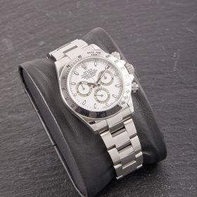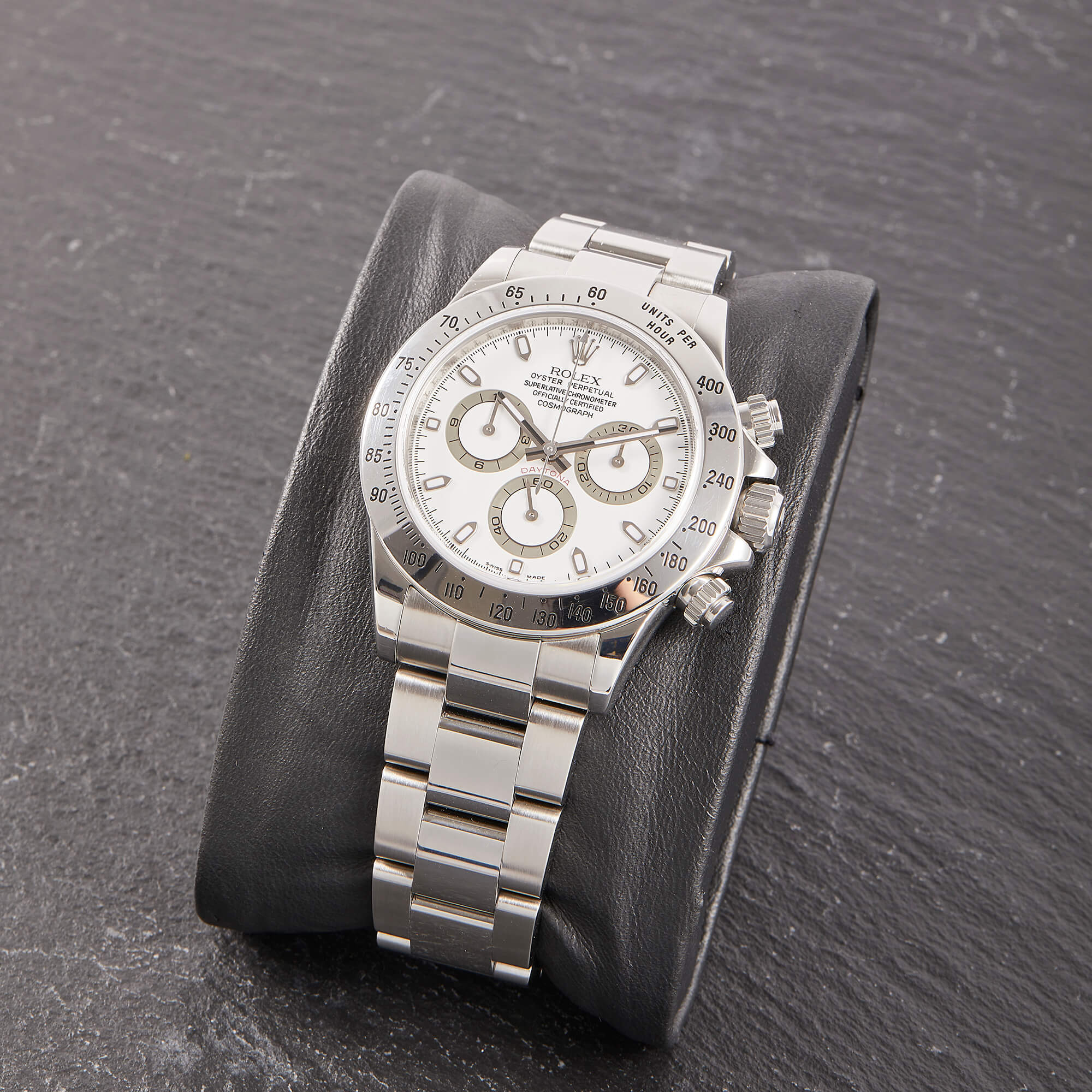 Rolex Daytona 116520 Gefragte Stahl-Daytona mit weißem Zifferblatt, 40 mm Gehäuse und internem Kaliber 4130. Dieses Modell kommt im Fullset mit Box und Papieren – ein gesuchtes Sammlerstück mit hohem Wiedererkennungswert. Frühe Variante mit beliebter kurzer Faltschließe.- Durchmesser