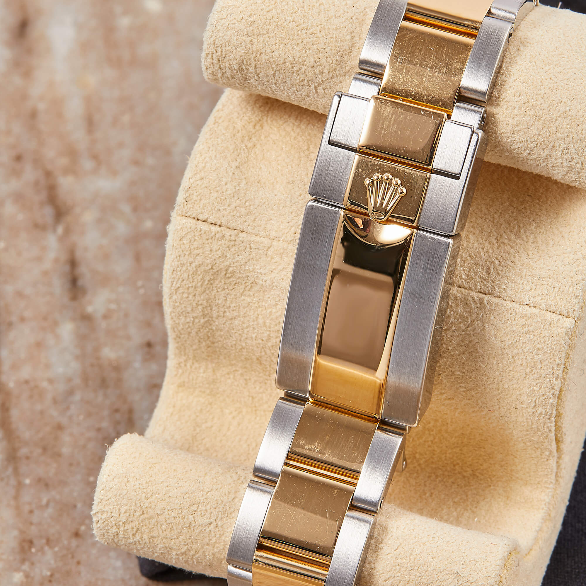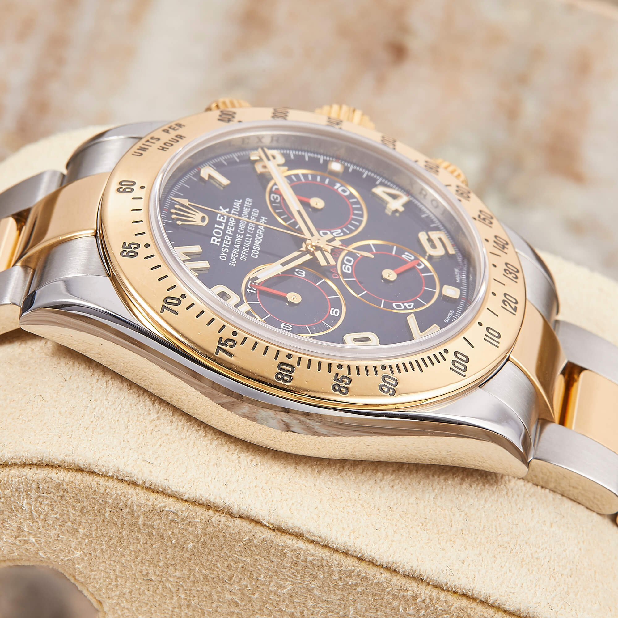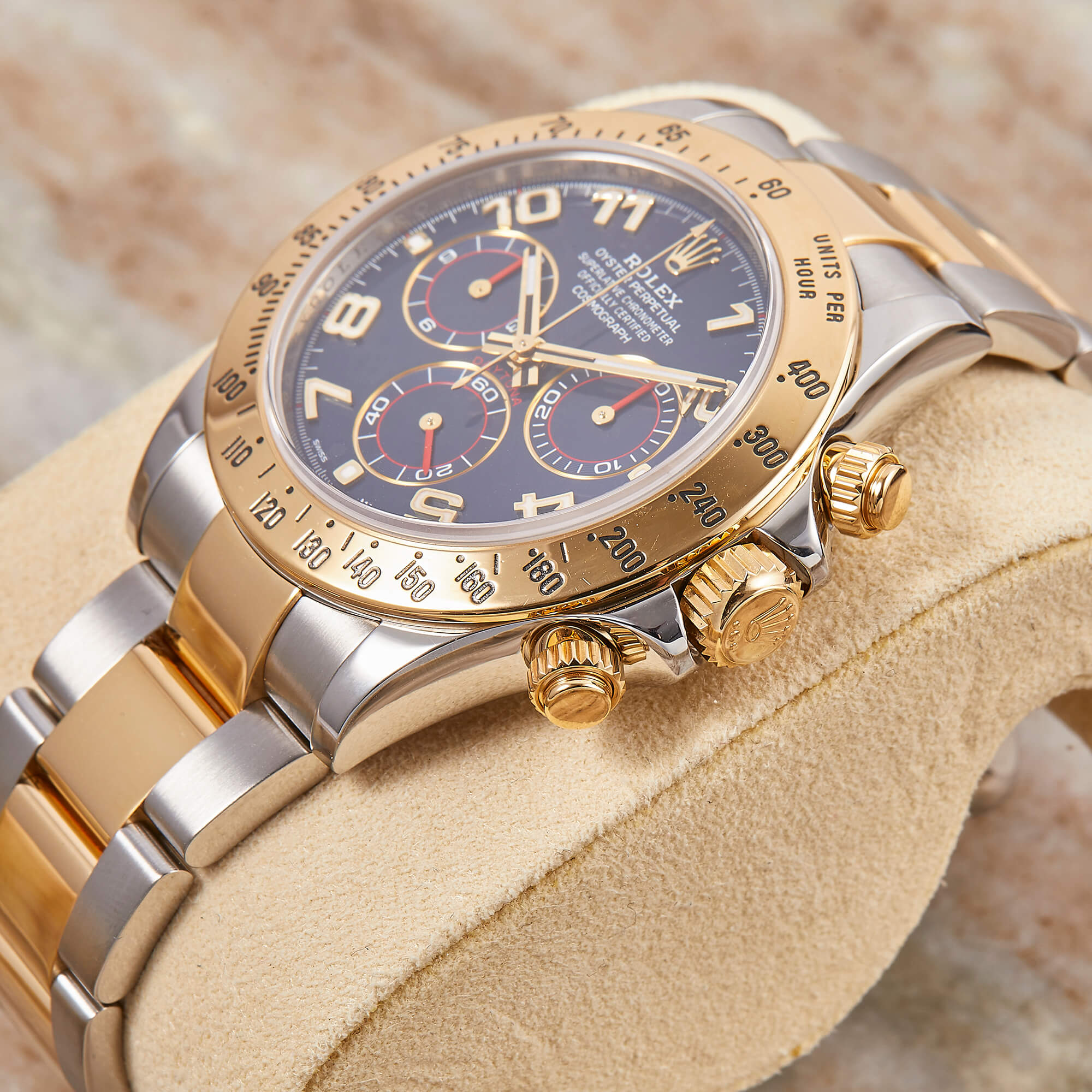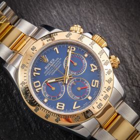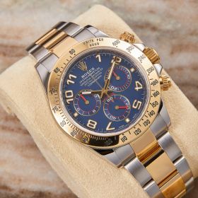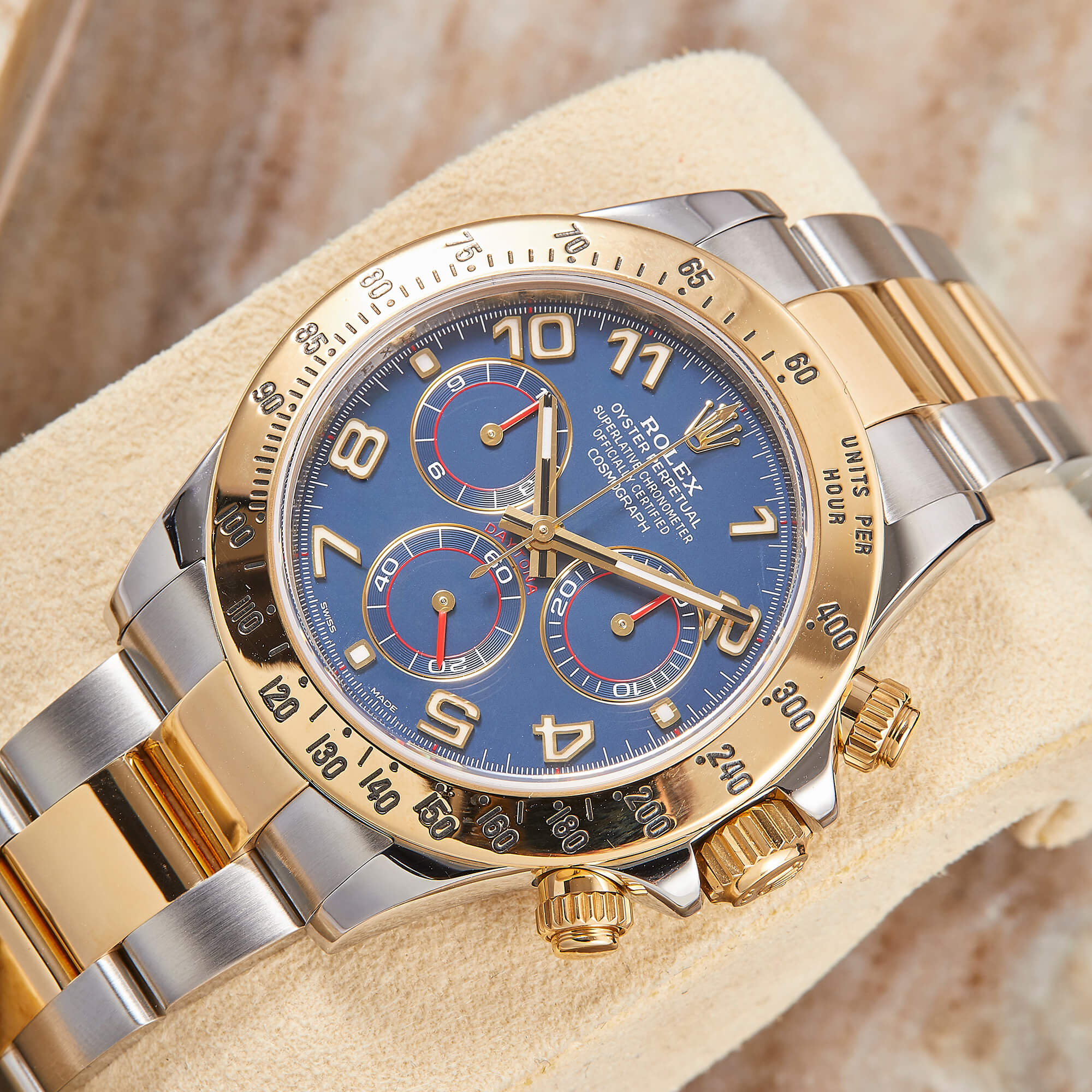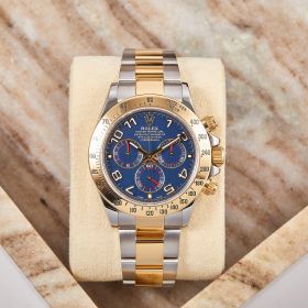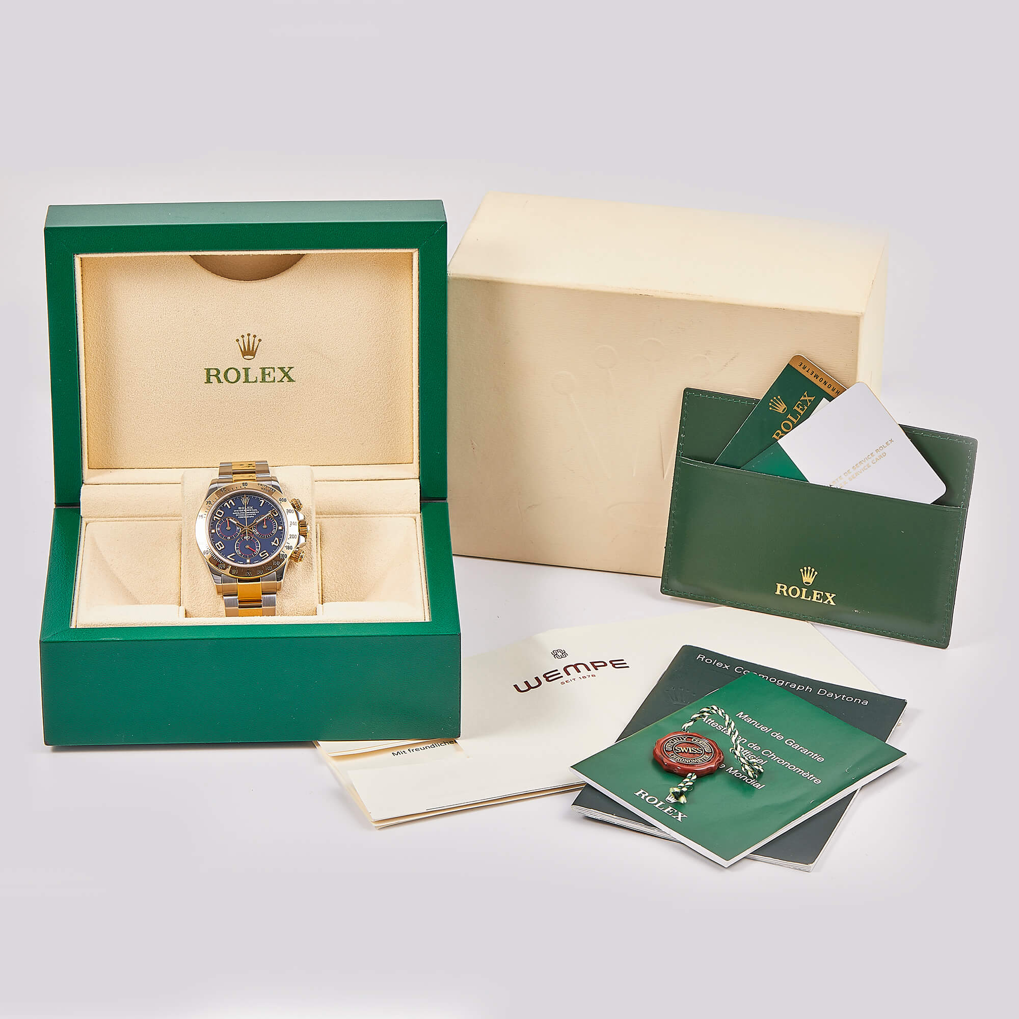 Die Rolex Cosmograph Daytona Ref. 116523 im Fullset ist ein begehrter Klassiker, der Sportlichkeit und Eleganz perfekt vereint. Mit ihrem blauen Racing-Zifferblatt und der markanten Lünette aus 18-karätigem Gelbgold mit Tachymeterskala ist sie nicht nur ein funktionales Chronographen-Werkzeug, sondern auch ein stilvolles Statement. Dieses Modell wurde kürzlich einem Service nach Herstellervorgaben unterzogen und kommt mit einer neuen Rolex Servicecard, sowie im Fullset, was ihren makellosen Zustand unterstreicht. Die Kombination aus Edelstahl und Gelbgold macht diese Uhr zu einem zeitlosen Begleiter für jede Gelegenheit.- Durchmesser