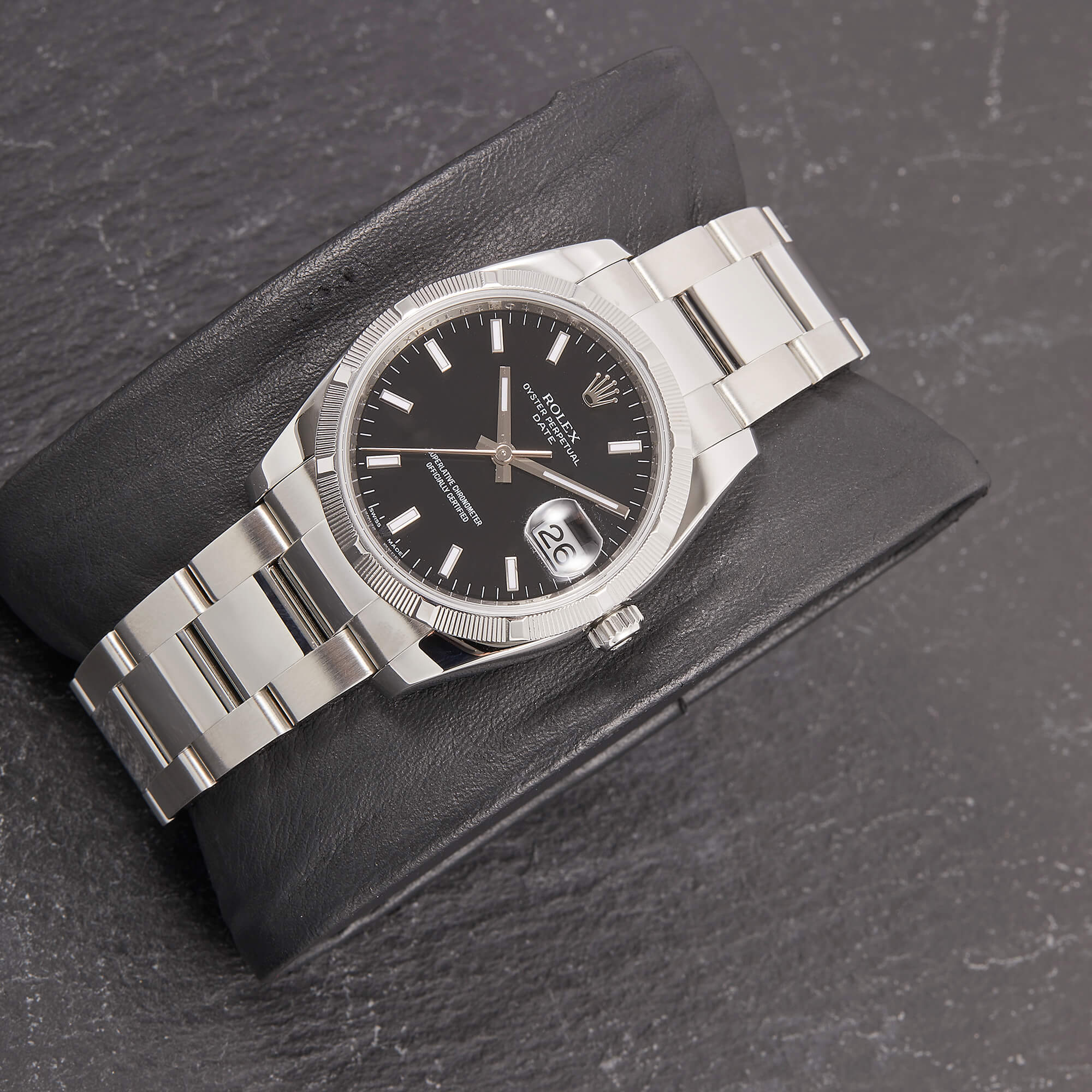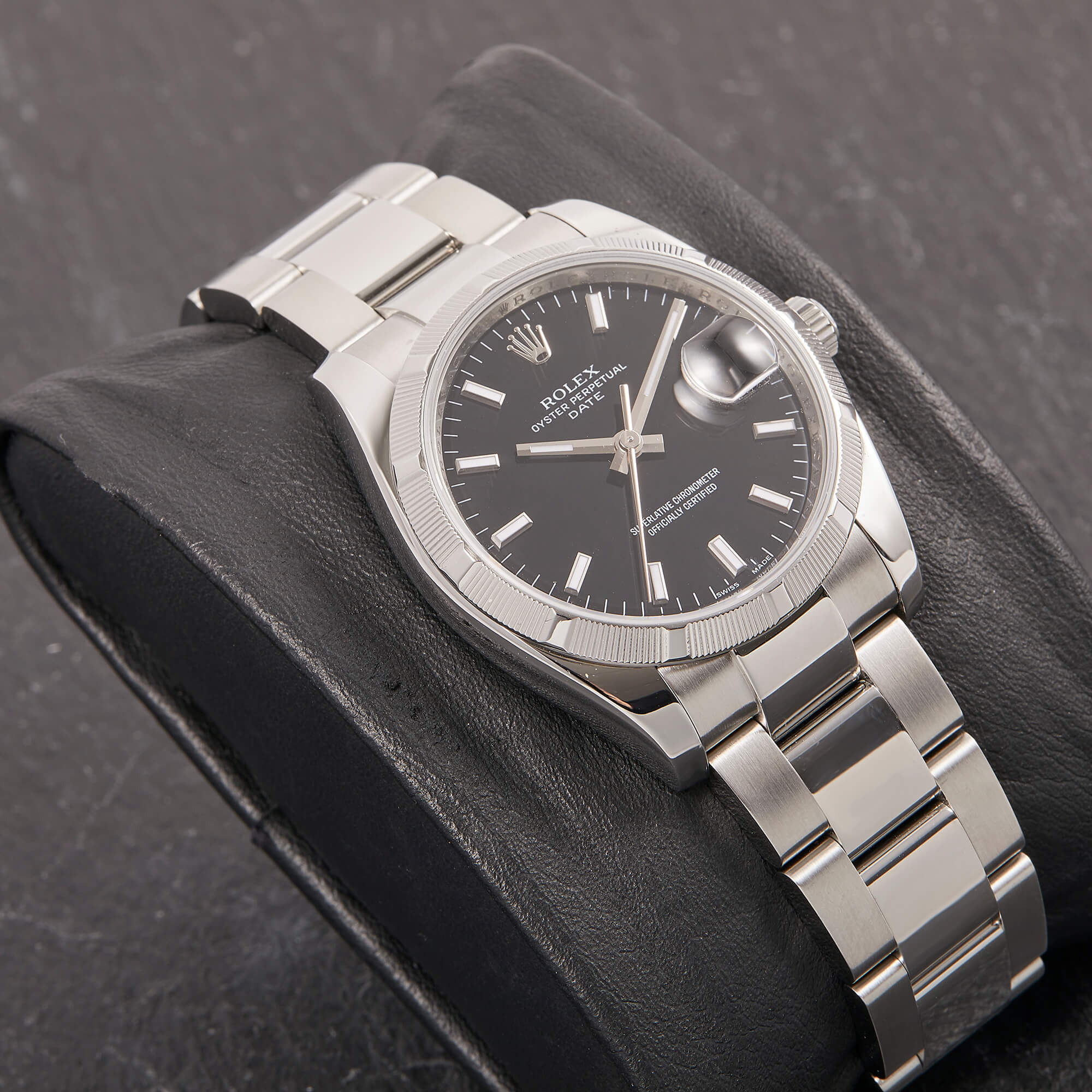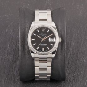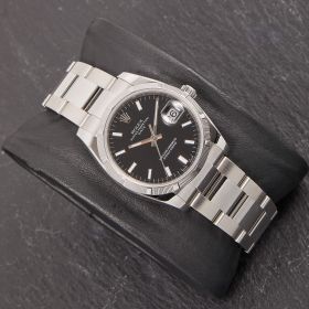 Rolex Oyster Perpetual Date 34, Referenz 115210 im Fullset, sowie mit dem klassichen schwarzen Zifferblatt. Das Modell verbindet klassische Proportionen und steht exemplarisch für die zeitlose Eleganz der Oyster-Perpetual-Linie.- Durchmesser