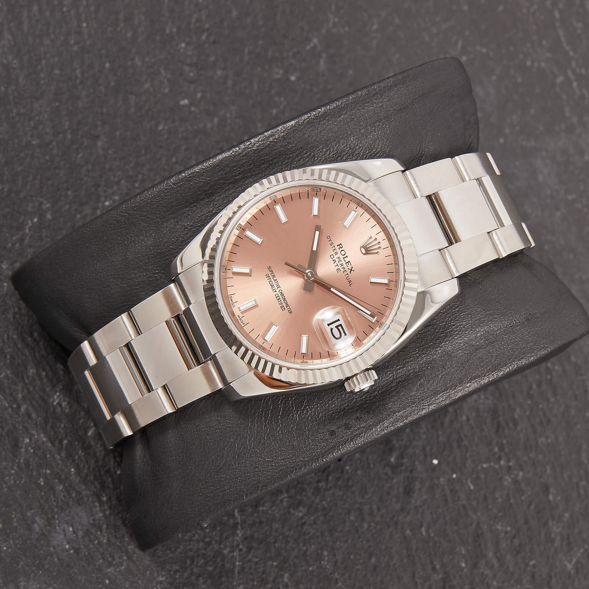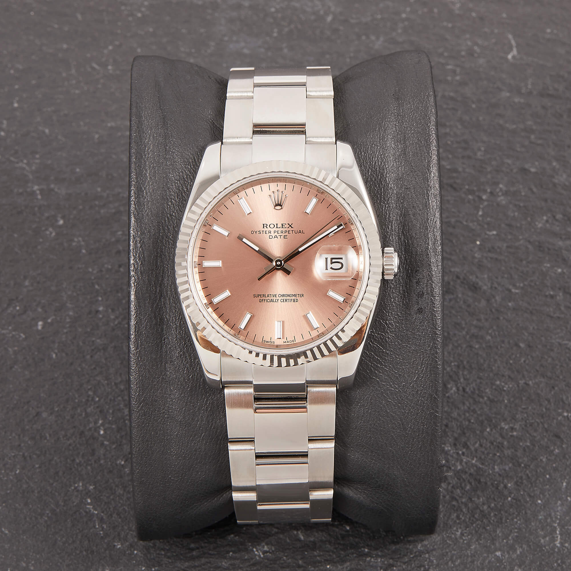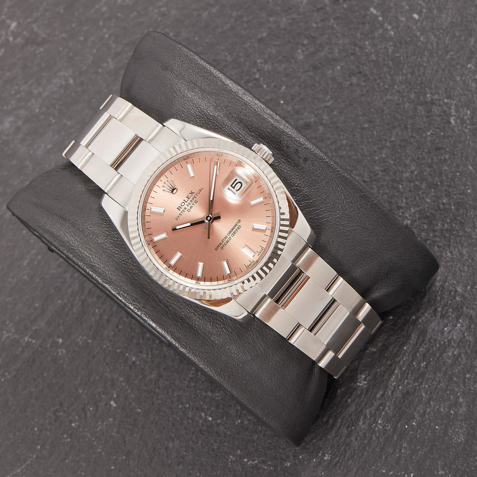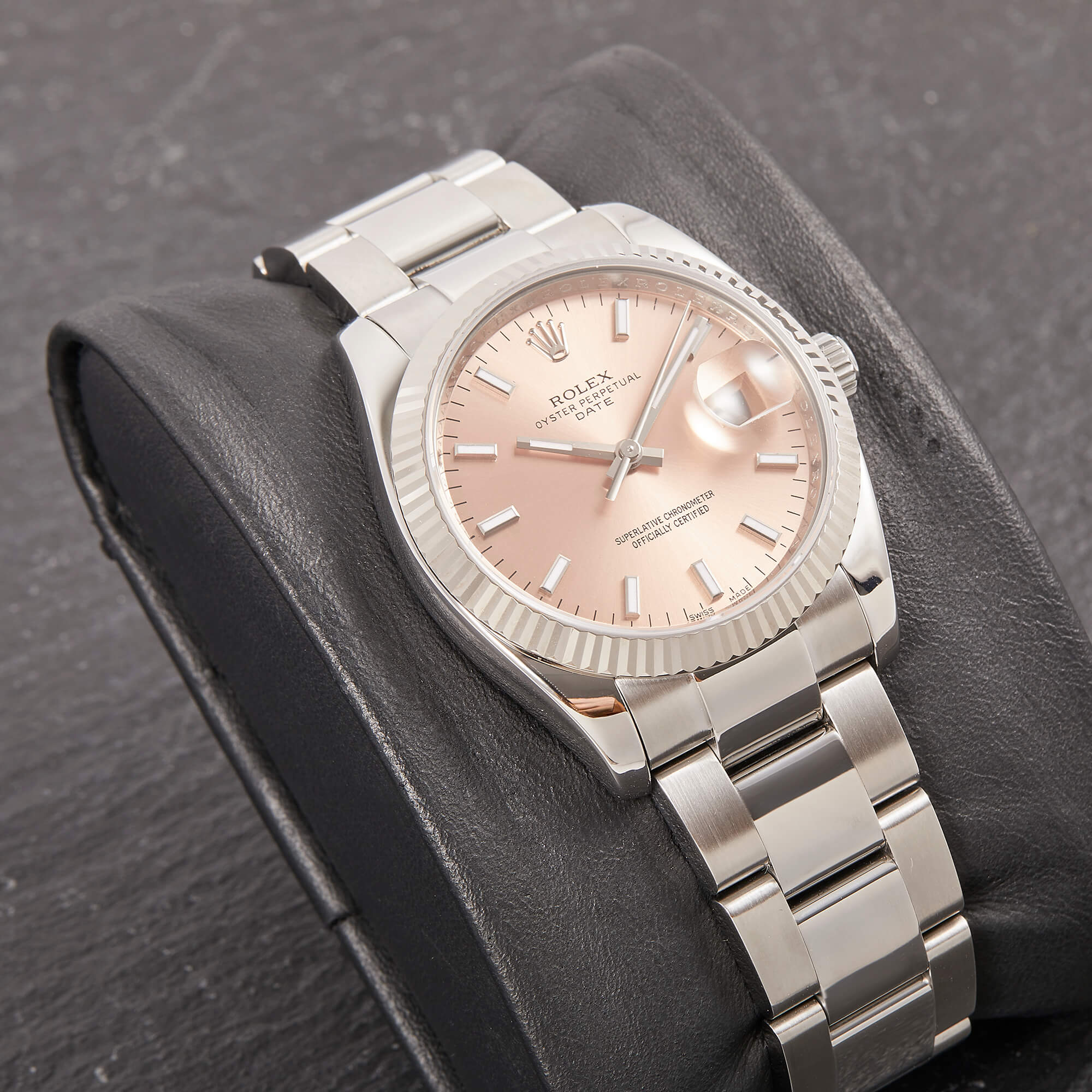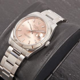 Die Rolex Oyster Perpetual Date 34 Referenz 115234 bietet eine spannende Kombination aus sportlicher Schlichtheit und eleganten Details. Ihr lachsfarbenes Zifferblatt wird durch Strichindizes akzentuiert. Die Weißgold-Riffellünette unterstreicht den hochwertigen Charakter dieses Modells.- Durchmesser