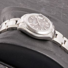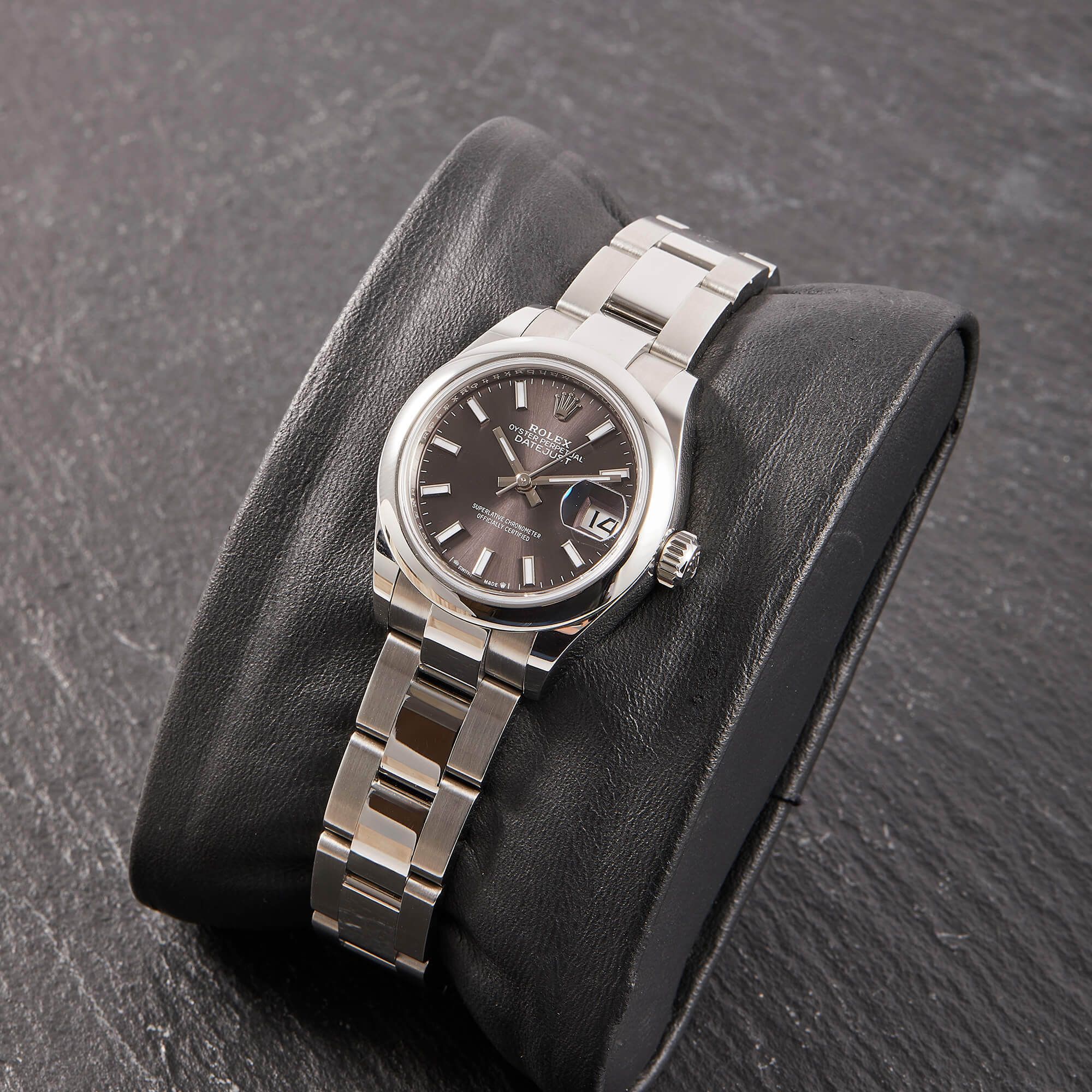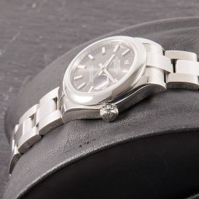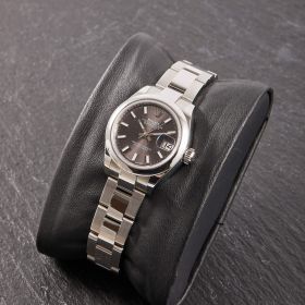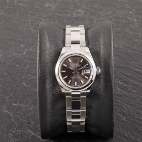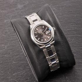 Die Rolex Lady Datejust 28, Referenz 279160, präsentiert sich in klassischer Edelstahlausführung mit einem elegantem grau-schwarzen Zifferblatt, das je nach Lichteinfall wunderschöne Nuancen zeigt. Das 28-mm-Gehäuse bietet die perfekte Balance aus Präsenz und femininer Eleganz. Die Uhr kommt im Fullset und überzeugt als moderne, zeitlose Begleiterin aus dem Hause Rolex.