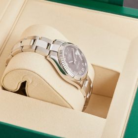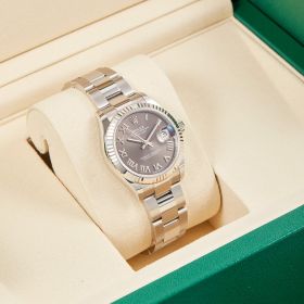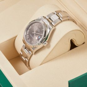 Lady Datejust mit 31mm Gehäusedurchmesser komplett in Edelstahl gefertigt mit geriffelter Weißgoldlünette. Graues Zifferblatt mit römischen Indexen und Oysterarmband.- Durchmesser