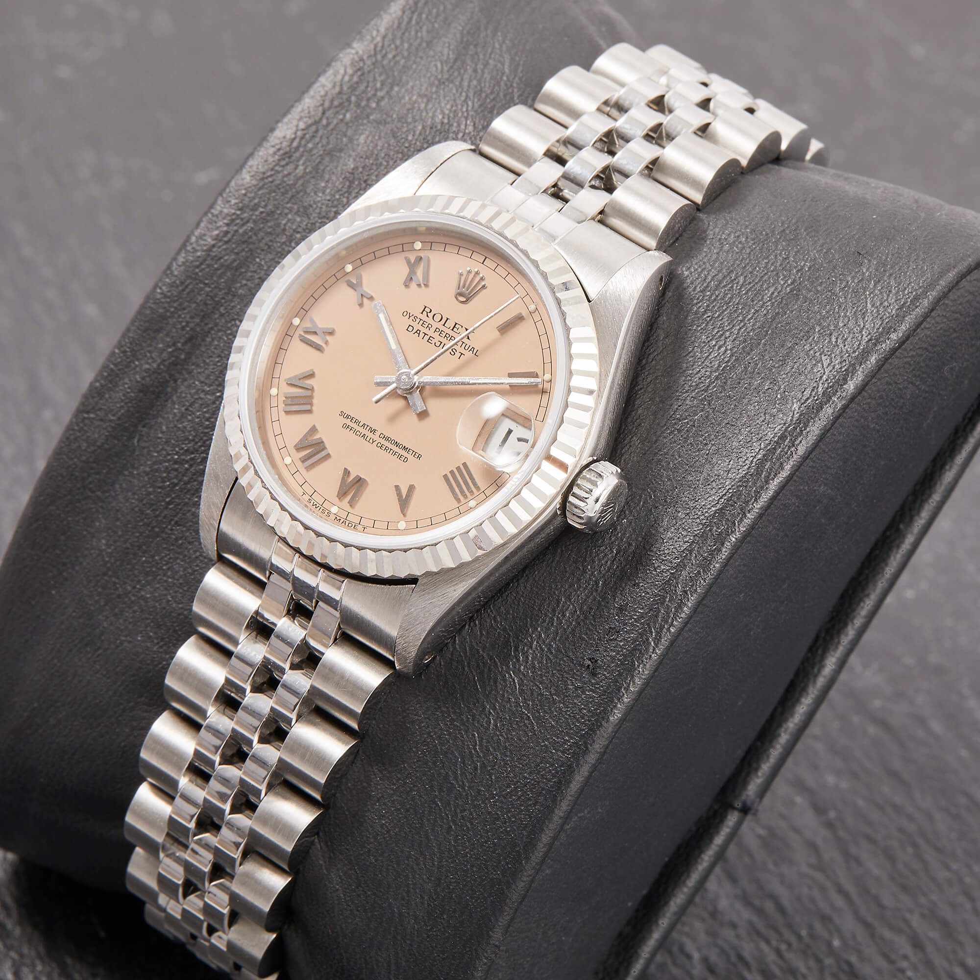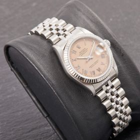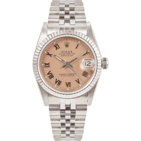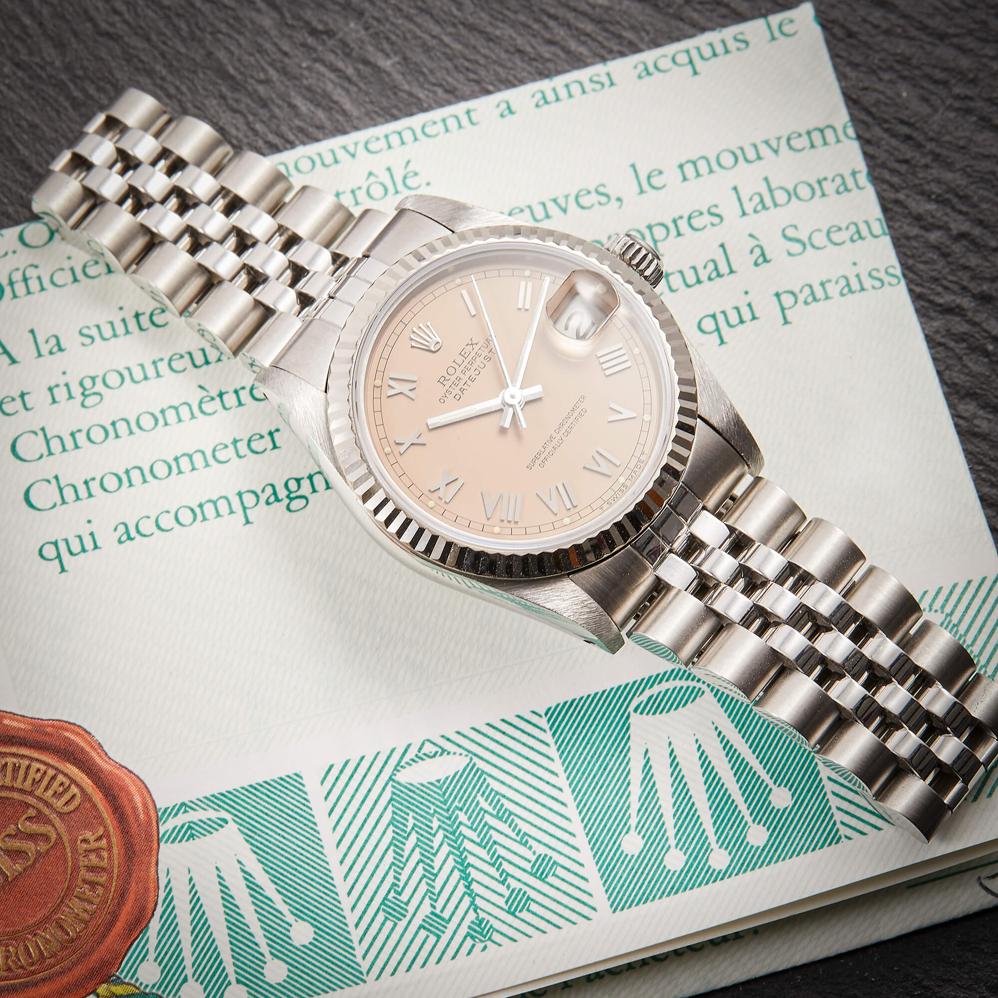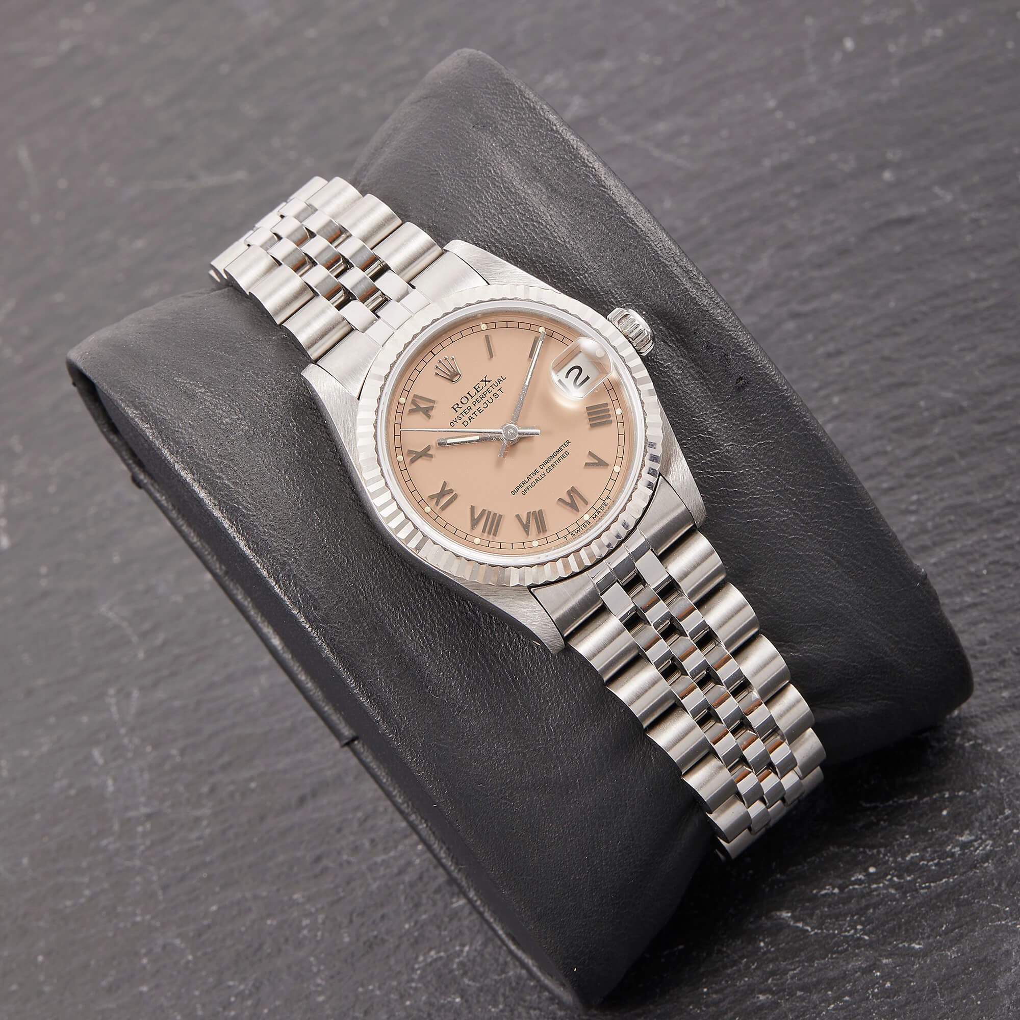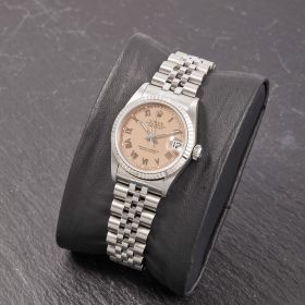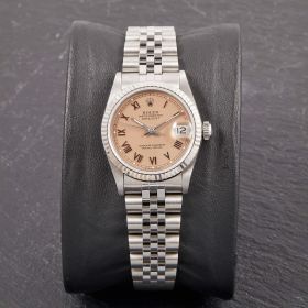Rolex Datejust 31 Ref. 68274 mit originalen Papieren. Die Kombination aus Edelstahl und weißgoldlünette verleiht der Uhr eine elegante Note, während das lachsfarbene Zifferblatt inkl. römischen Indizes ein wahrer Hingucker ist. Ein zeitloses Modell in handlicher 31 mm Größe.- Durchmesser